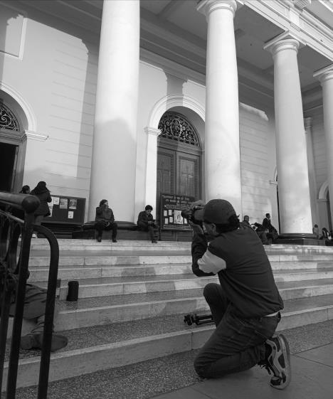 ISO-800 F / 4.5 1/100 s Esquema de Iluminación : Cenital Tipo de luz : NaturalLa grandiosa estructura contrasta con la sencillez de la vida diaria que transcurre a su alrededor Las imponentes columnas de la una iglesia enmarcan a las personas que descansan en sus escaleras Este espacio sagrado ofrece sombra y descanso a files y extraños