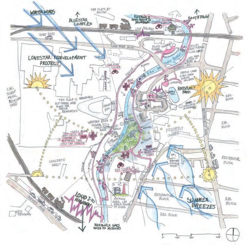 Our site was located in Roosevelt Park, south of the South Alamo art district. The extension of the river walk trail runs down the eastern side of our site, and the San Antonio River flowed down the western side of our site. The site was located above an embayment, a plot of sunken land that gets flooded with water whenever the river overflows. Many riverside plants and trees grow in this embayment, and I attempted to leave this area as unaffected as possible.