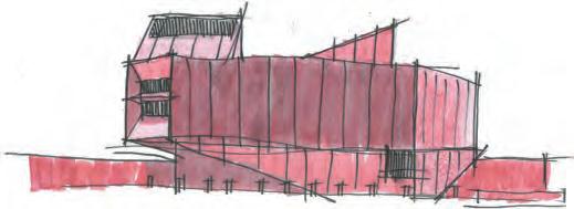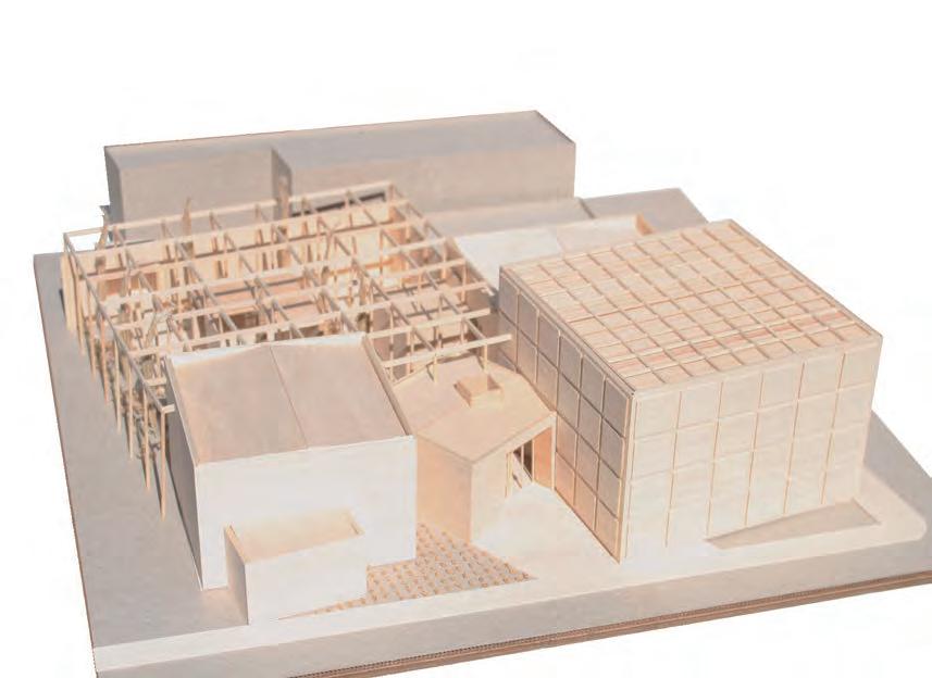 The Ruby City building shape is unique, and I did not want to compete with it with an equally odd-shaped abstraction. I decided to make the building a series of intersecting square prisms that would form one building, but the connection between the prisms could be experienced clearly. Visitors can experience the insides of these rectangular prisms in the gallery spaces. The interior gallery space has an overhead cast concrete waffle structure, and the outdoor garden has a matching steel grid pergola.