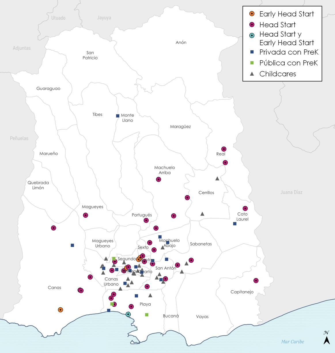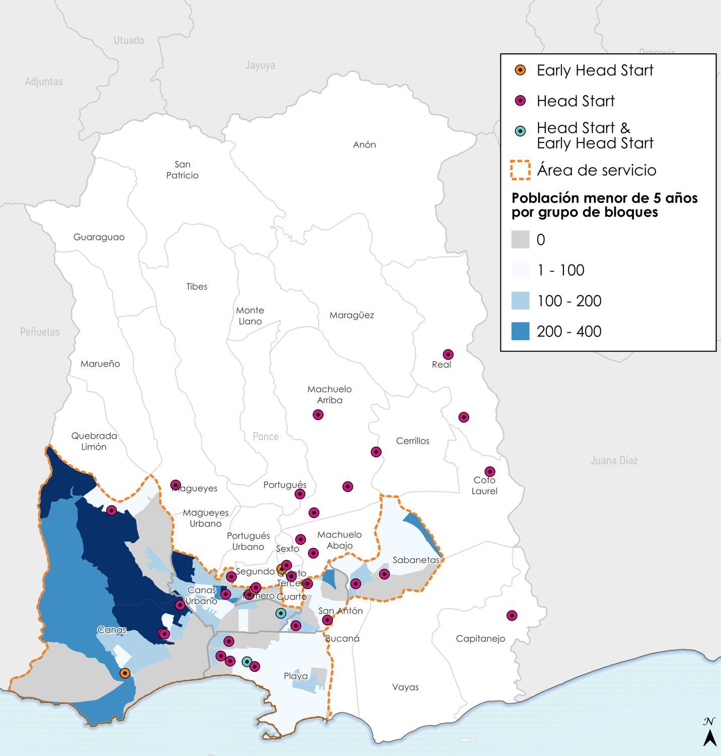 De acuerdo con la información de la Encuesta de la Comunidad del Censo de Población y Vivienda para 2021 se estima que el 65.2% de los menores de 3 y 4 años están matriculados en centros prescolares o en la escuela privada o pública en el área de servicio de Ponce y el 72.0% en el área de servicio de San Juan, para Puerto Rico la cifra es menor con 58.4%. La encuesta llevada a cabo en 2022 para efectos del Estudio de Comunidad, por otro lado, provee información tanto para los niños entre 3 y 4 años y como para los menores de 3 años. En esa dirección se encontró entre el grupo de menores de 3 y 4 años, proporciones menores en el área de Ponce (45.0%) y en el área de San Juan (68.0%). Al mirarlo para la totalidad de niños menores de 3 años, el por ciento es aún menor en ambas áreas con 29.0% en Ponce y 43.5% en San Juan.