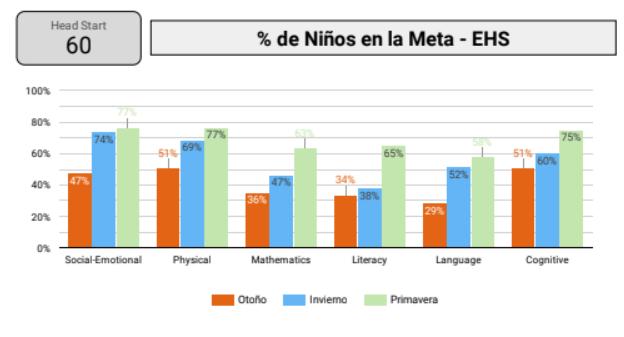 Los resultados de los niños demuestran que se han trabajado las metas de preparación escolar en todos los dominios. En Head Start y en early Head Start se refleja un aumento en los porcentajes de alcance en todos los dominios. El 60% o más de los participantes de HS alcanzan todos los dominios. El 58% o más de los participantes de EHS alcanzan todos los dominios.