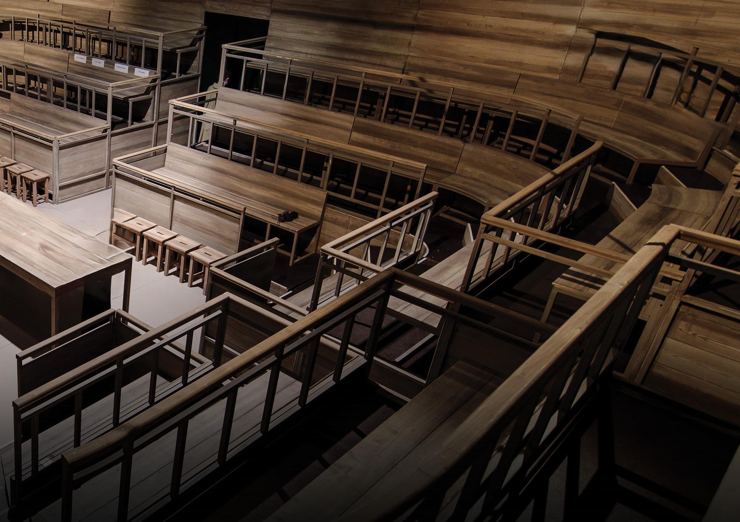 „A játéktér egyetlen monumentális méretű doboz, egy cirkuszi manézs végtelen körére emlékeztető térforma, valamint egy, a nézőtéren átívelő, a játéktérbe betörő platform. A „ház” törékeny, papírszerű falakkal határolt – ezek a dobozolás abszurd gesztusán keresztül fokozatosan lebomlanak, jelezve a rend, a biztonság és az otthon illúziójának megszűnését. A körkörös forma a falubeliek folyamatos, kényszeres mozgását, a menekülés lehetetlenségét, a háborús lét felőrlő ritmusát hangsúlyozza. A nézőtéren átívelő kifutó – a halott fiú „porondja” – egyenesen a díszlet középpontjába vezet, ahol már nincs sem otthon, sem élet, csak pusztulás és üresség: a háború és az agresszió elkerülhetetlen következményeinek sűrített képe.”