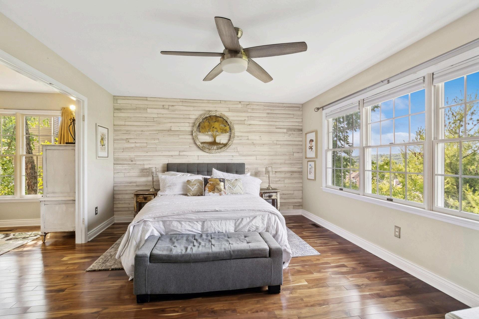 The primary bedroom is a tranquil retreat featuring laminate wood floors and a rustic barn wood accent wall. It boasts a spacious walk-in closet and an attached en suite bathroom for ultimate convenience. Enjoy stunning mountain views and direct access to the second bedroom, offering flexibility for use as a nursery, office, or sitting area