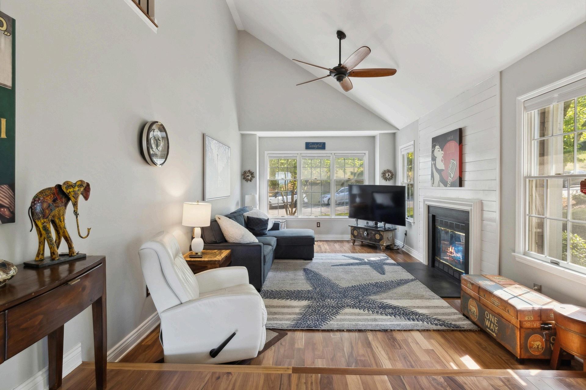 Welcome to the living room, a stunning space just a step down from the front door. This room features soaring twostory ceilings and is bathed in abundant natural light. It includes a cozy wood-burning fireplace with stylish shiplap accents and easy access to the dining room, making it perfect for both relaxation and entertaining.