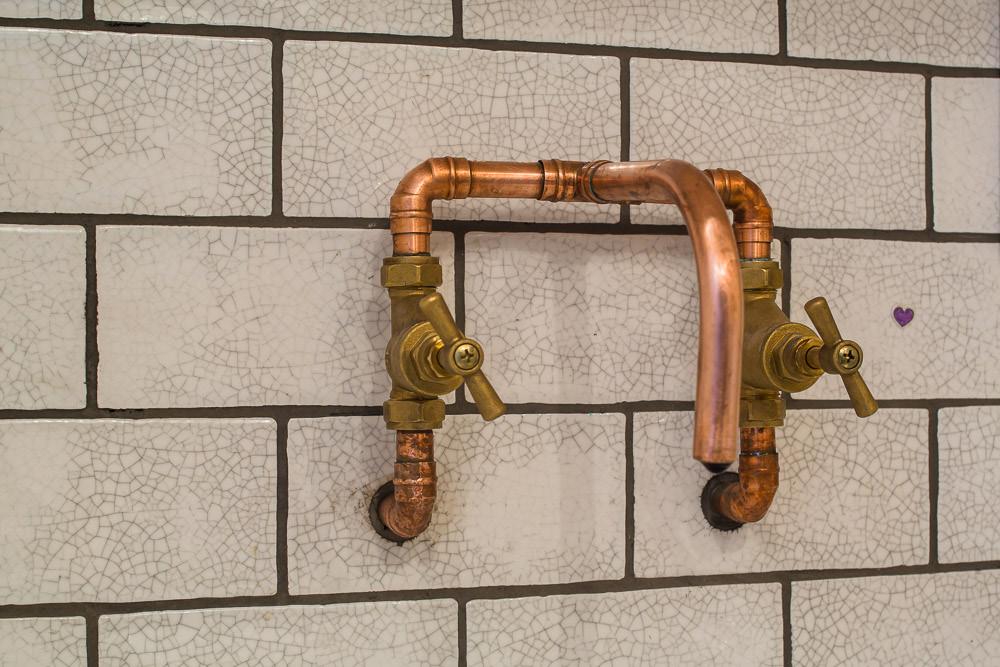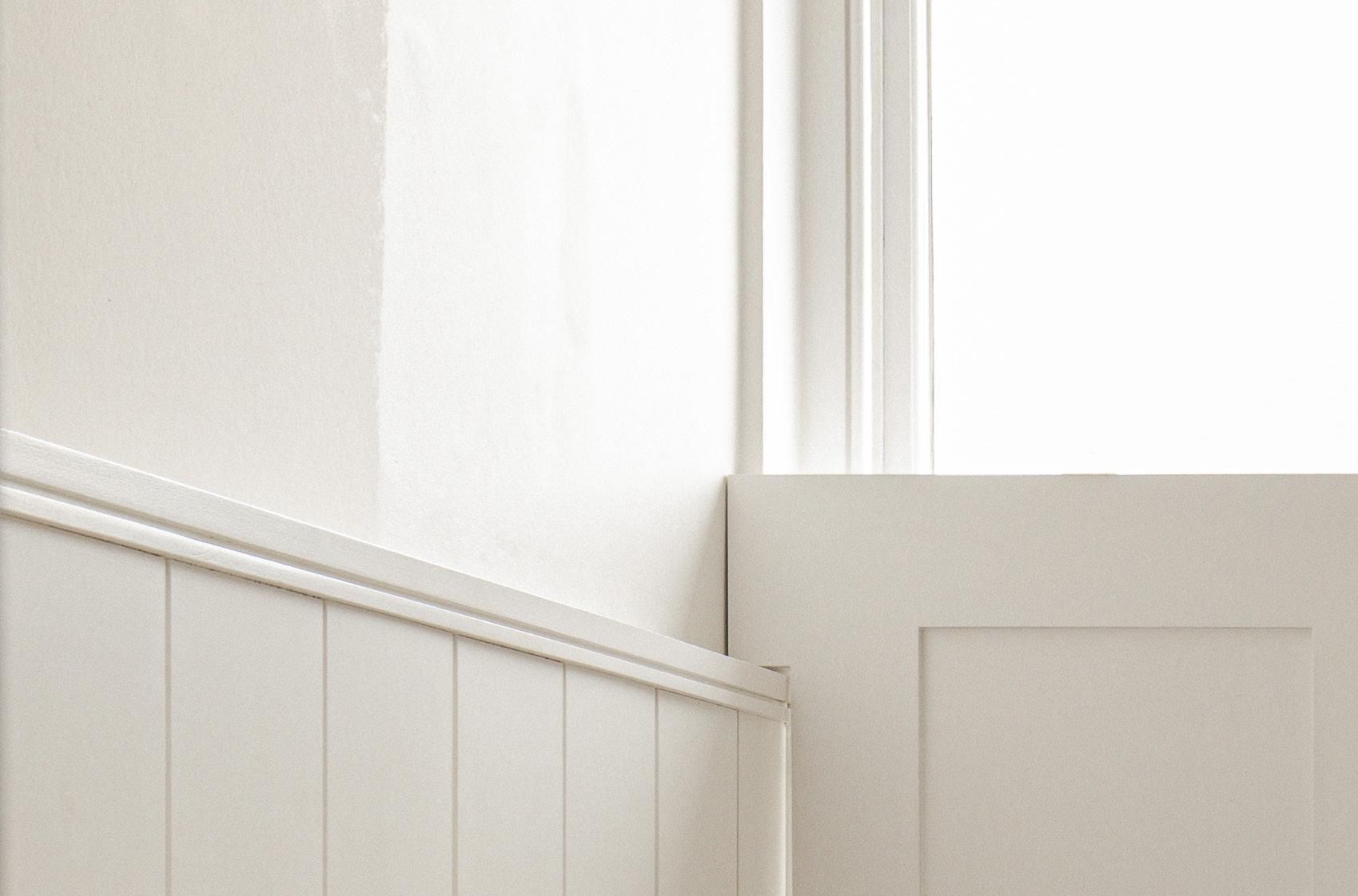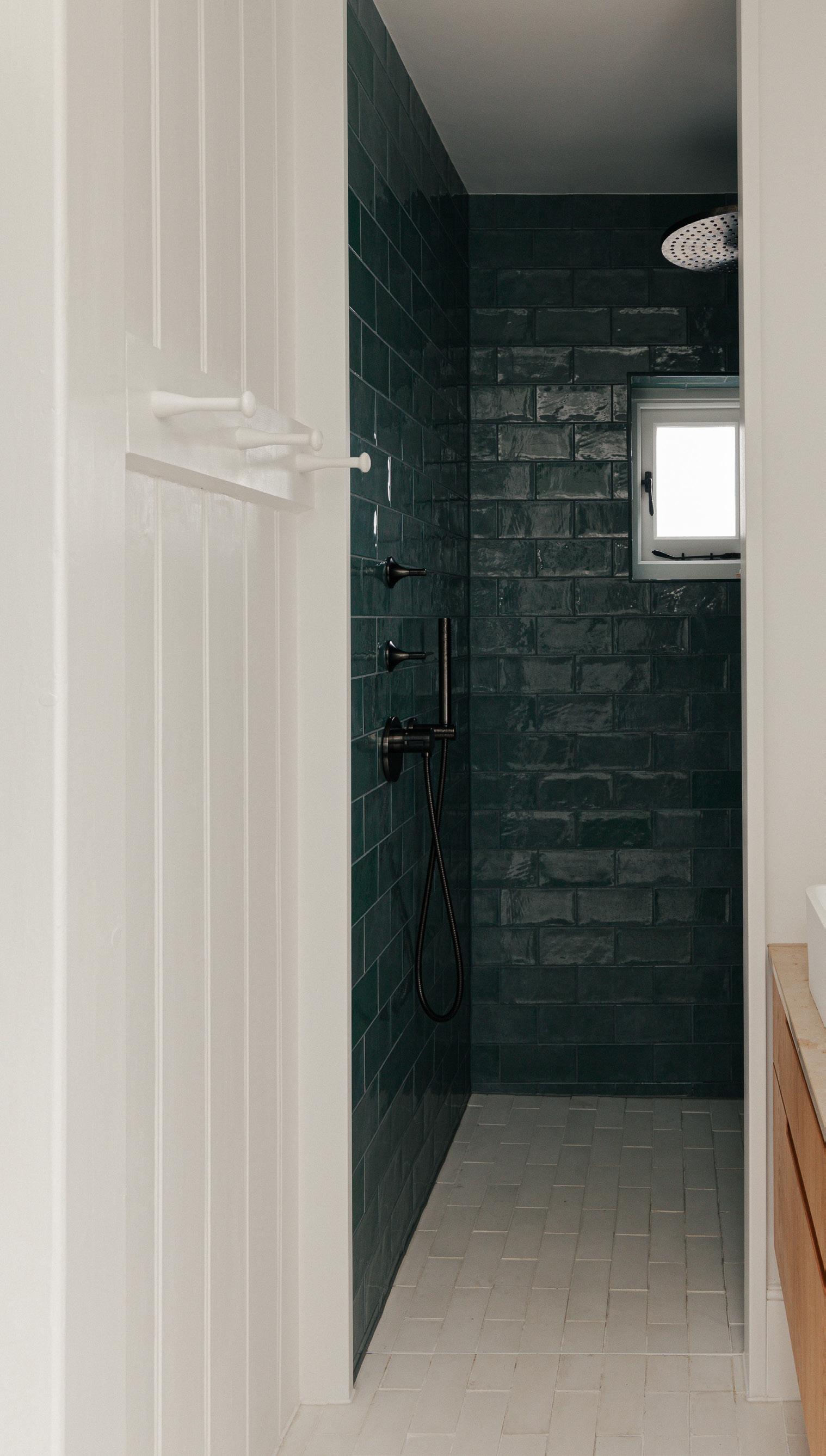The second floor bathroom was totally overhauled. Some original timber hooks were discovered in one of the existing pieces of built in joinery. These were then used as a template for a local joiner to turn new pegs to match. An original tongue and groove panel wall was also uncovered during the build, restored and celebrated in the new shower room.