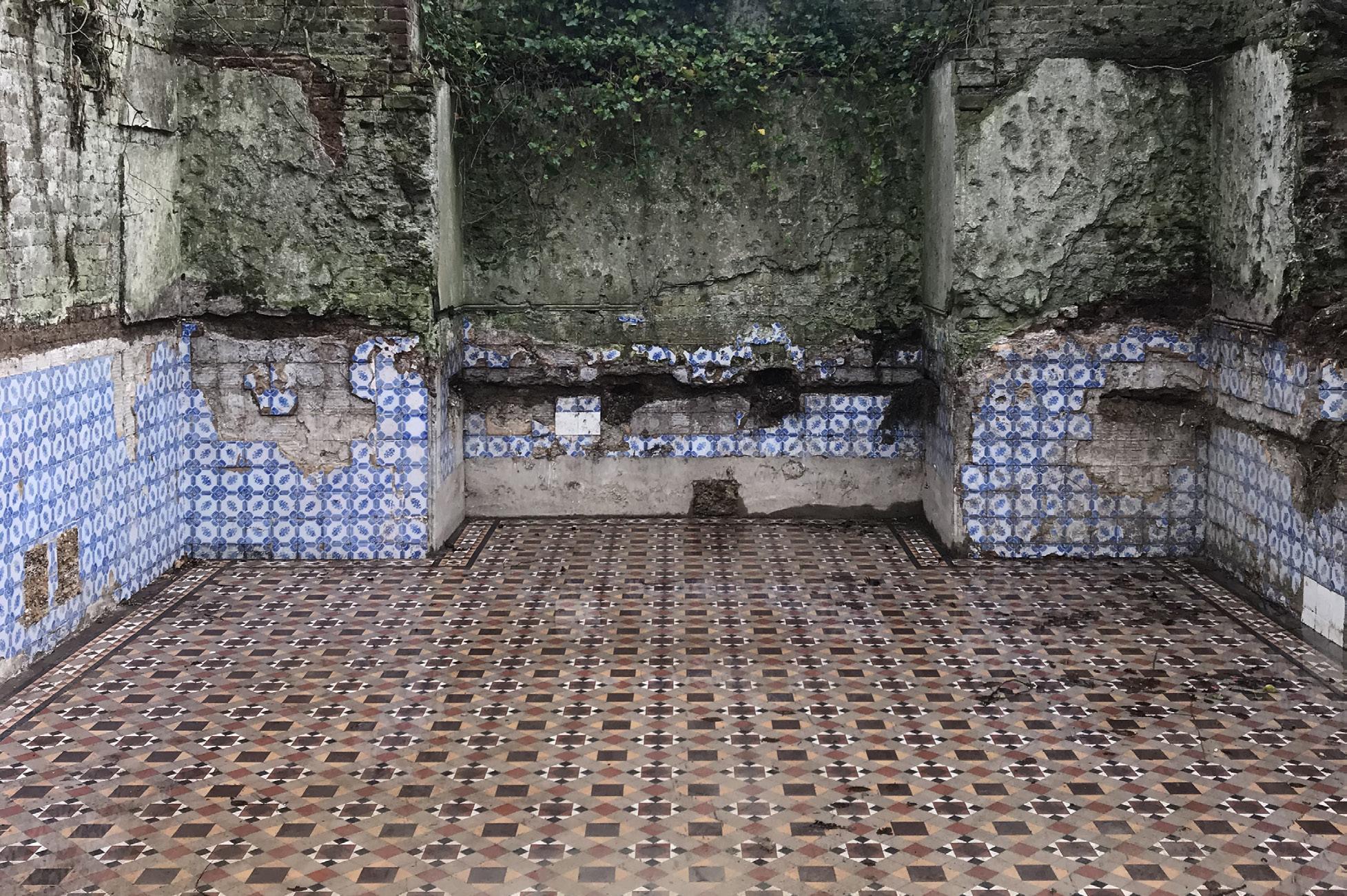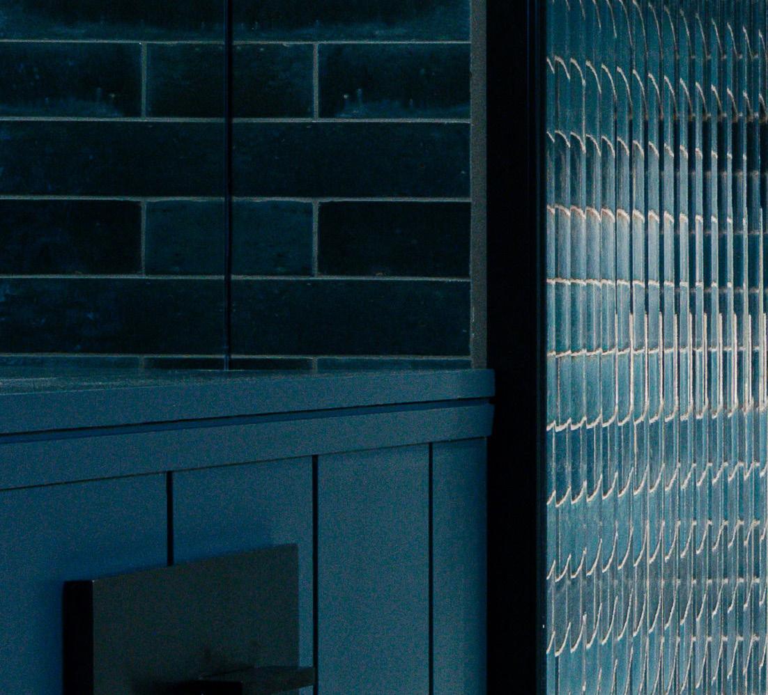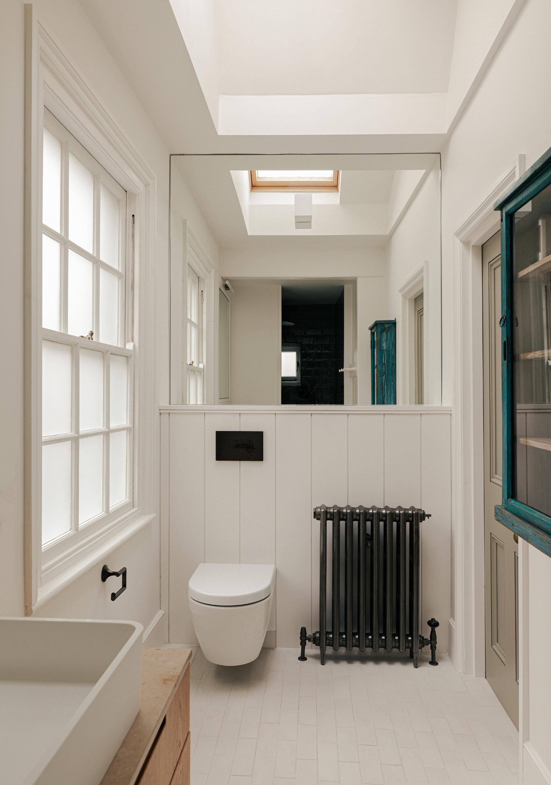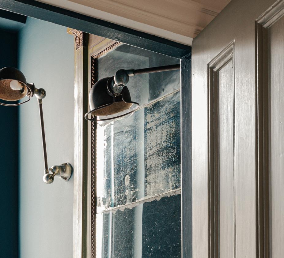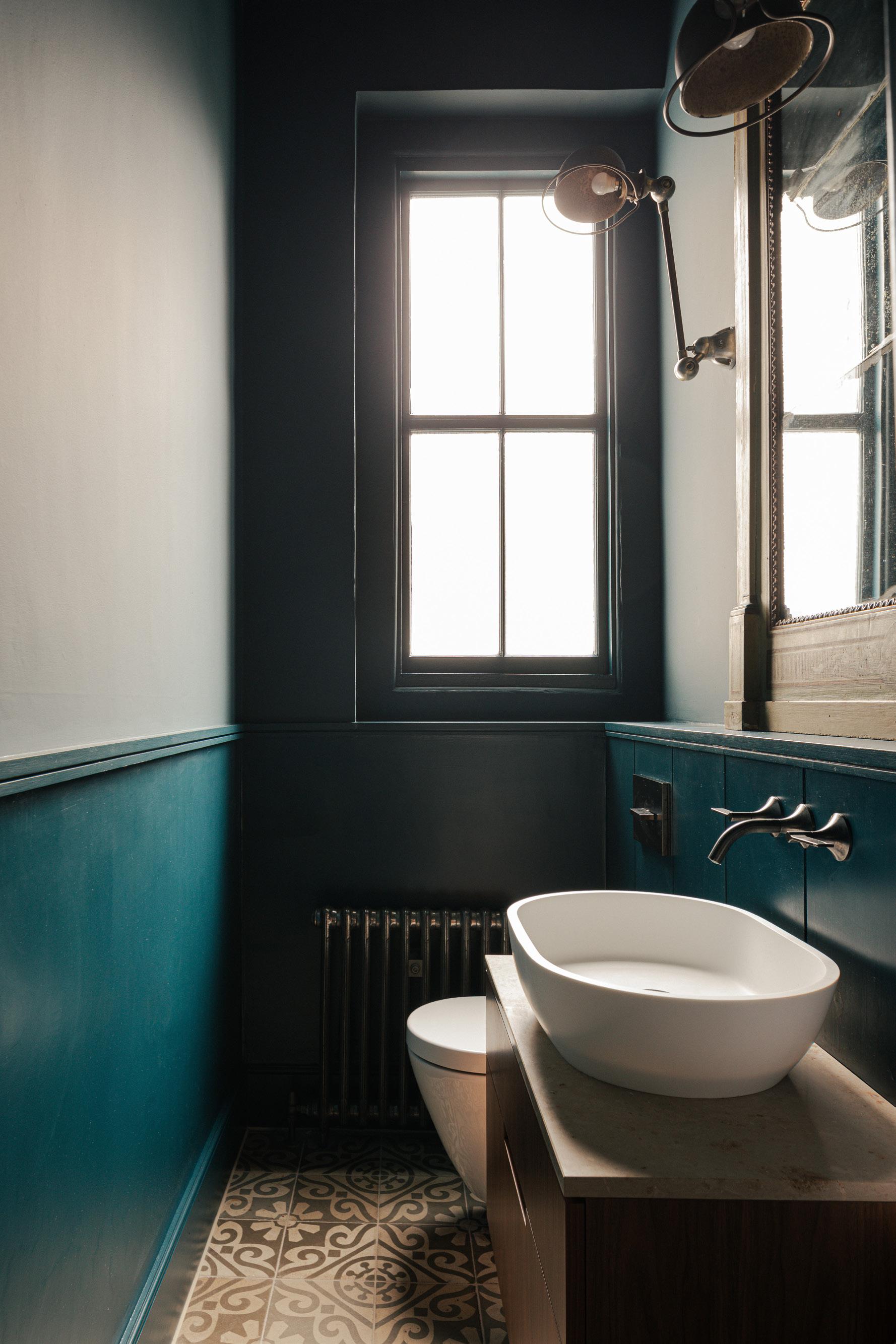 The ground floor WC was refurbished and a new shower room inserted at basement level. Reclaimed floor tiles, mirror and light fittings combine with a dark colour palette to create rich sensory environments.
