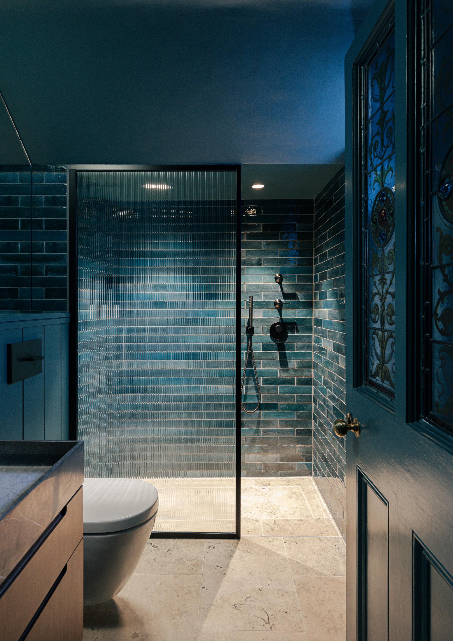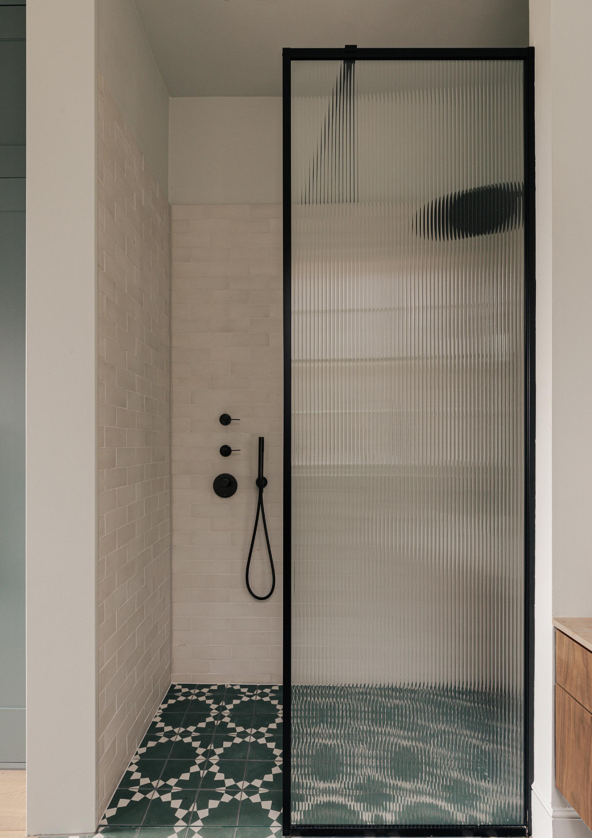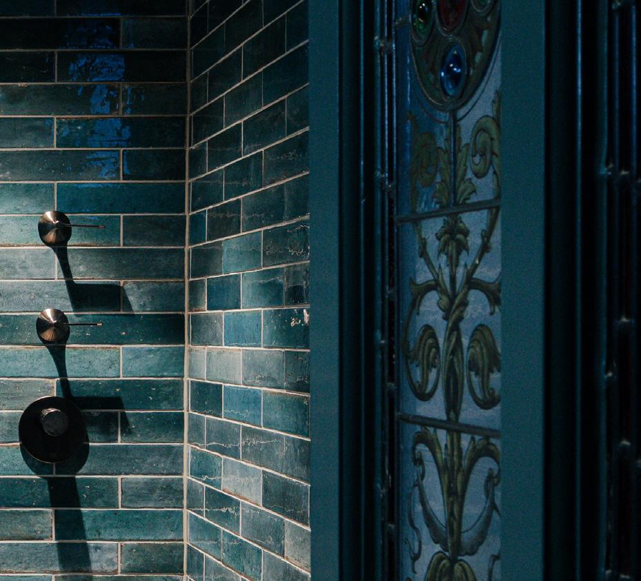 Refurbished shower rooms are an eclectic mix of decorative tiles & fluted glazed shower screens in black plated metal frames twinned with bronze plated brassware. Period doors and panelling were restored and re-painted to unify the aesthetic.