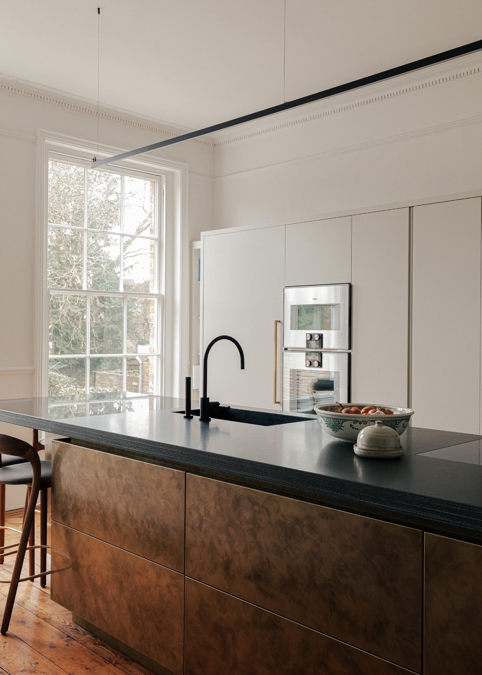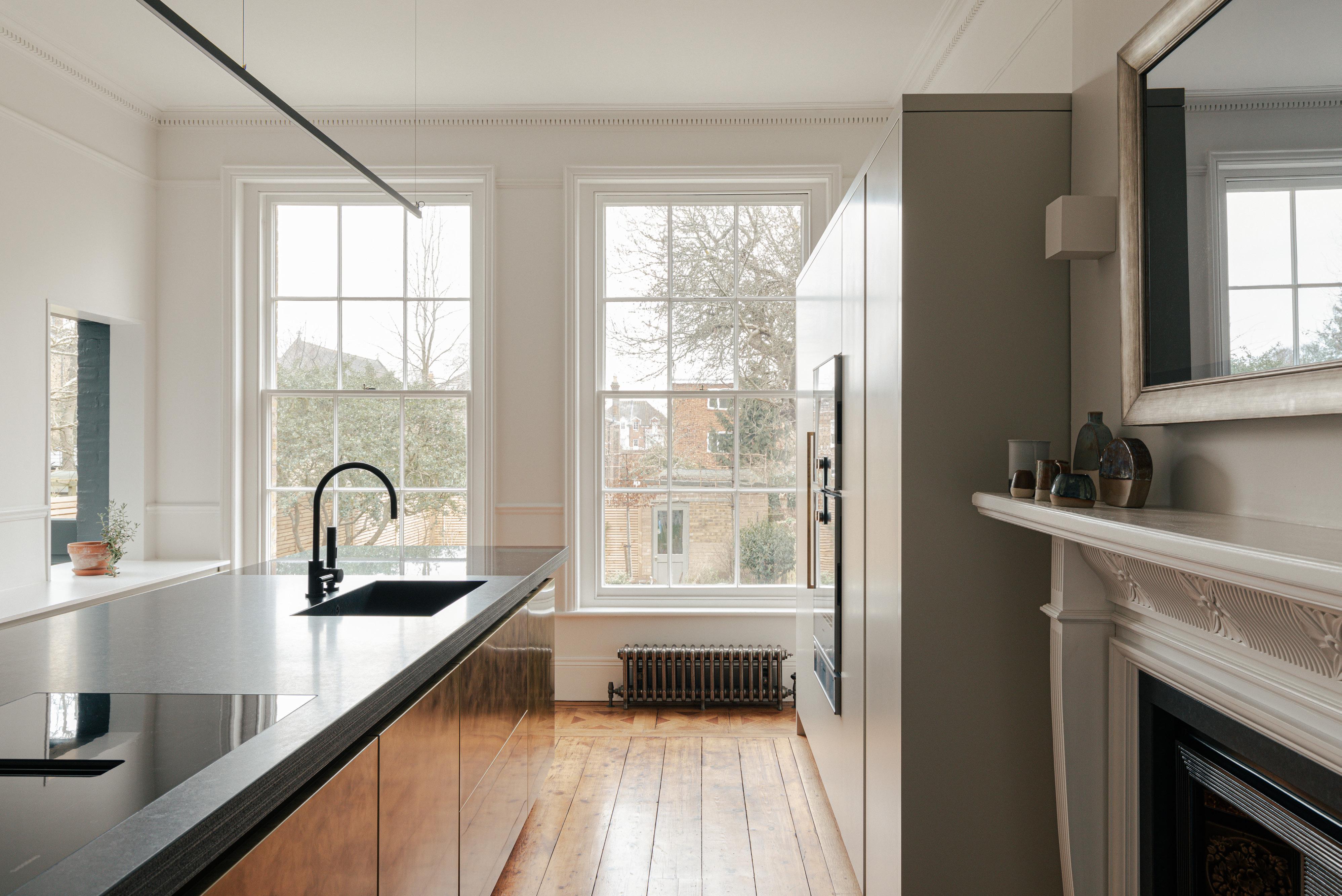 Sash windows, cornices, fireplaces and architraves were restored. Floor boards were re-conditioned and a new contemporary kitchen inserted into the space.
