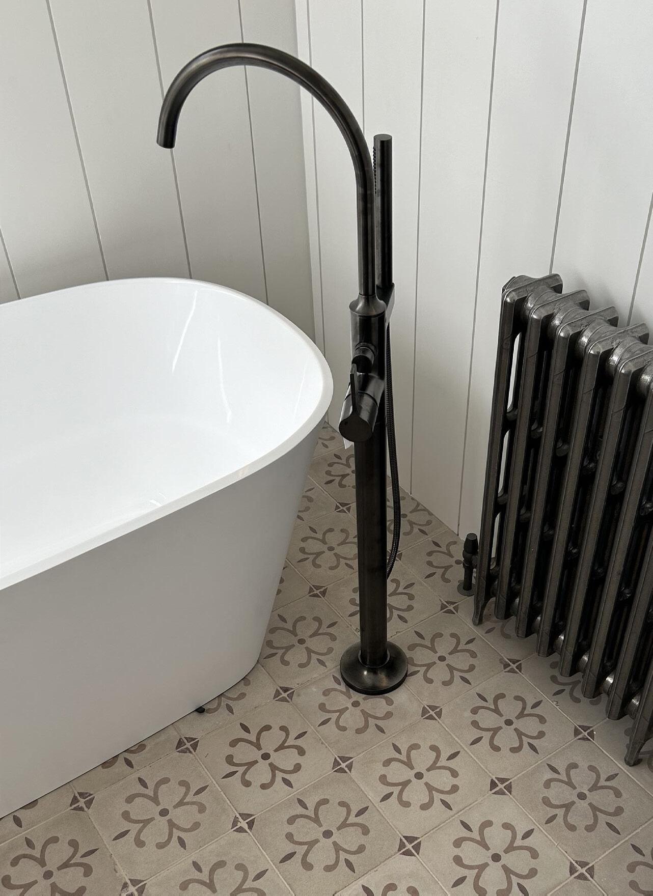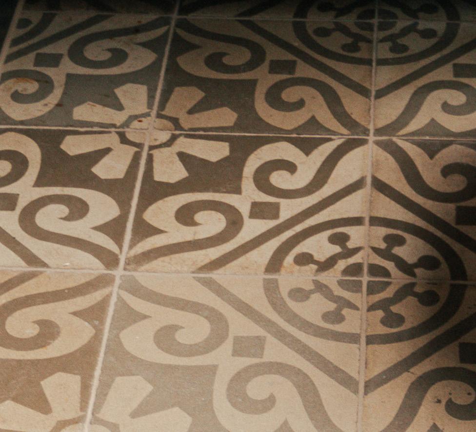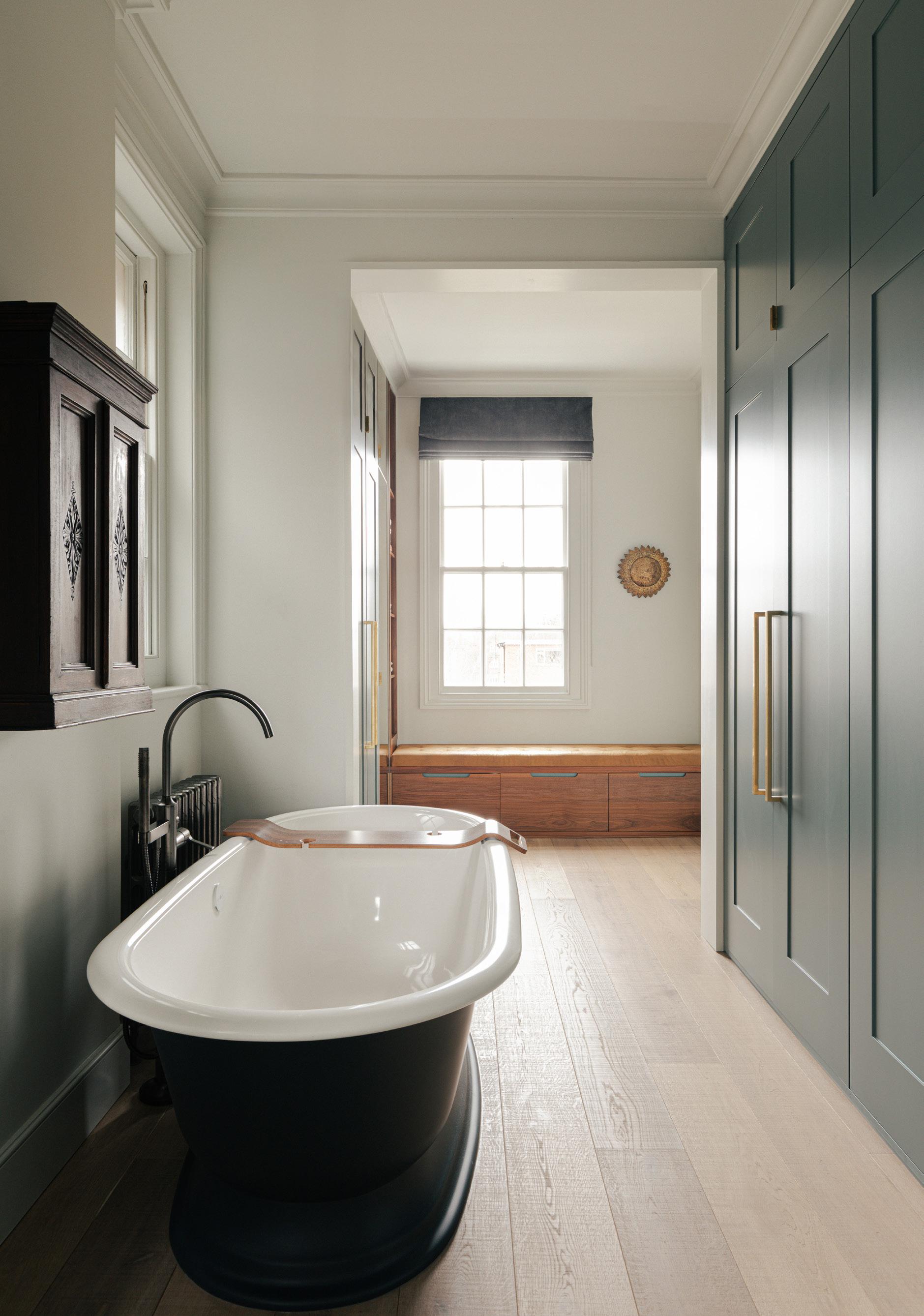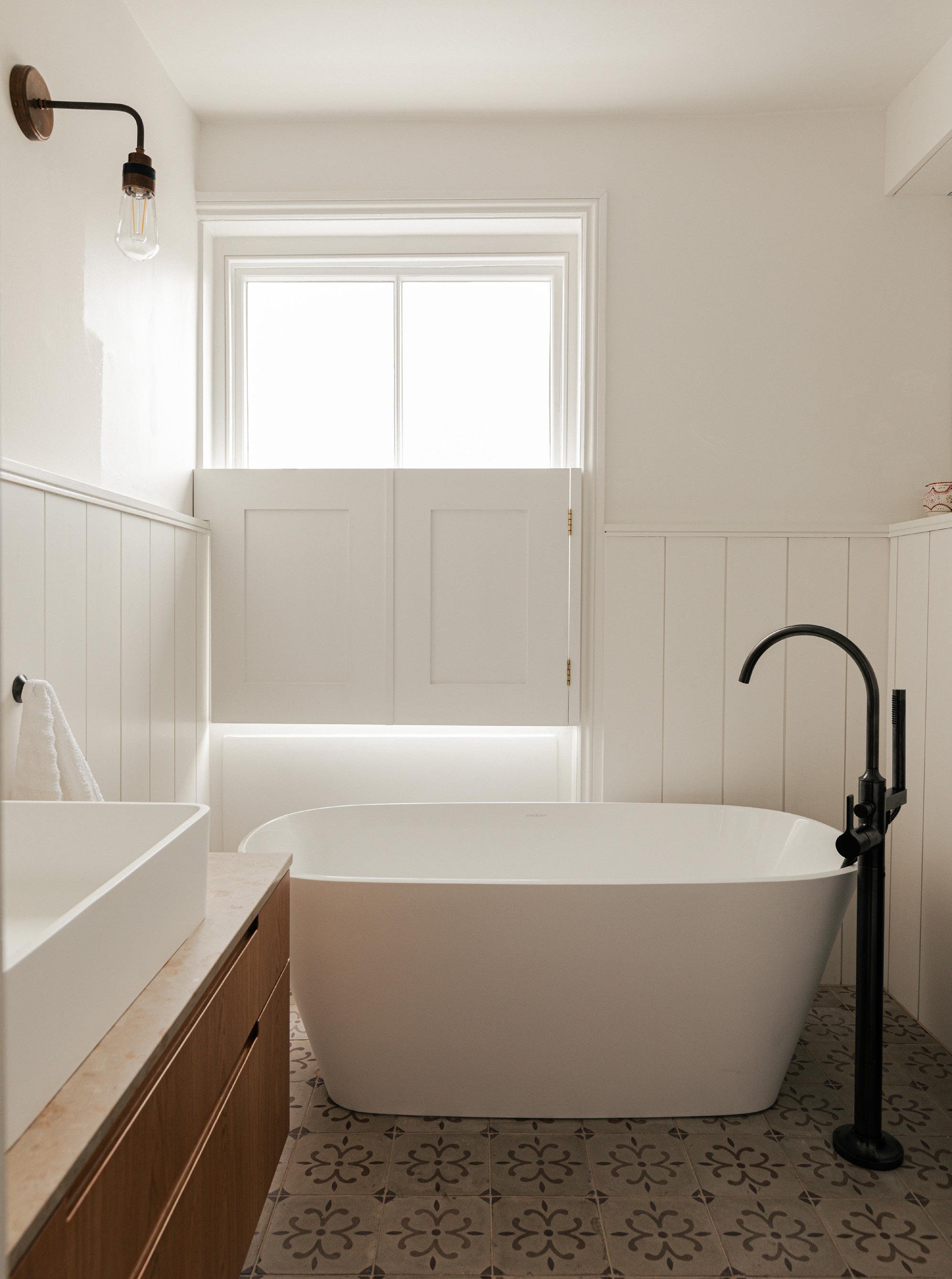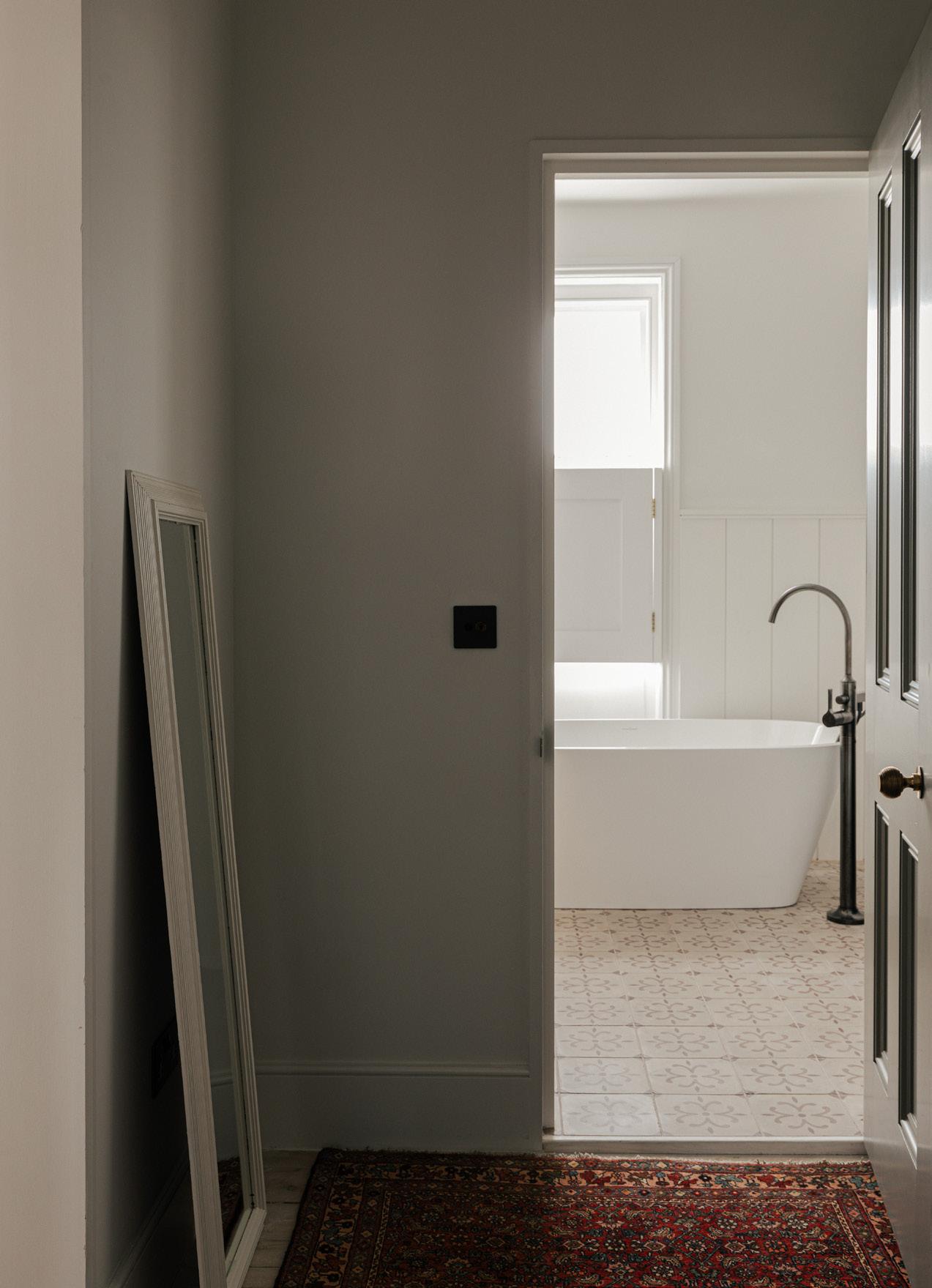 The principal bathroom is an eclectic mix of decorative tiles, bespoke joinery, antique furniture and contemporary light fittings. The hues are warm and soft.