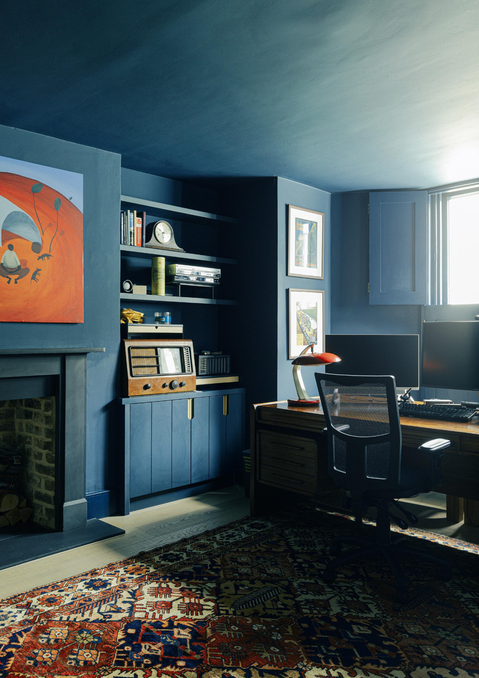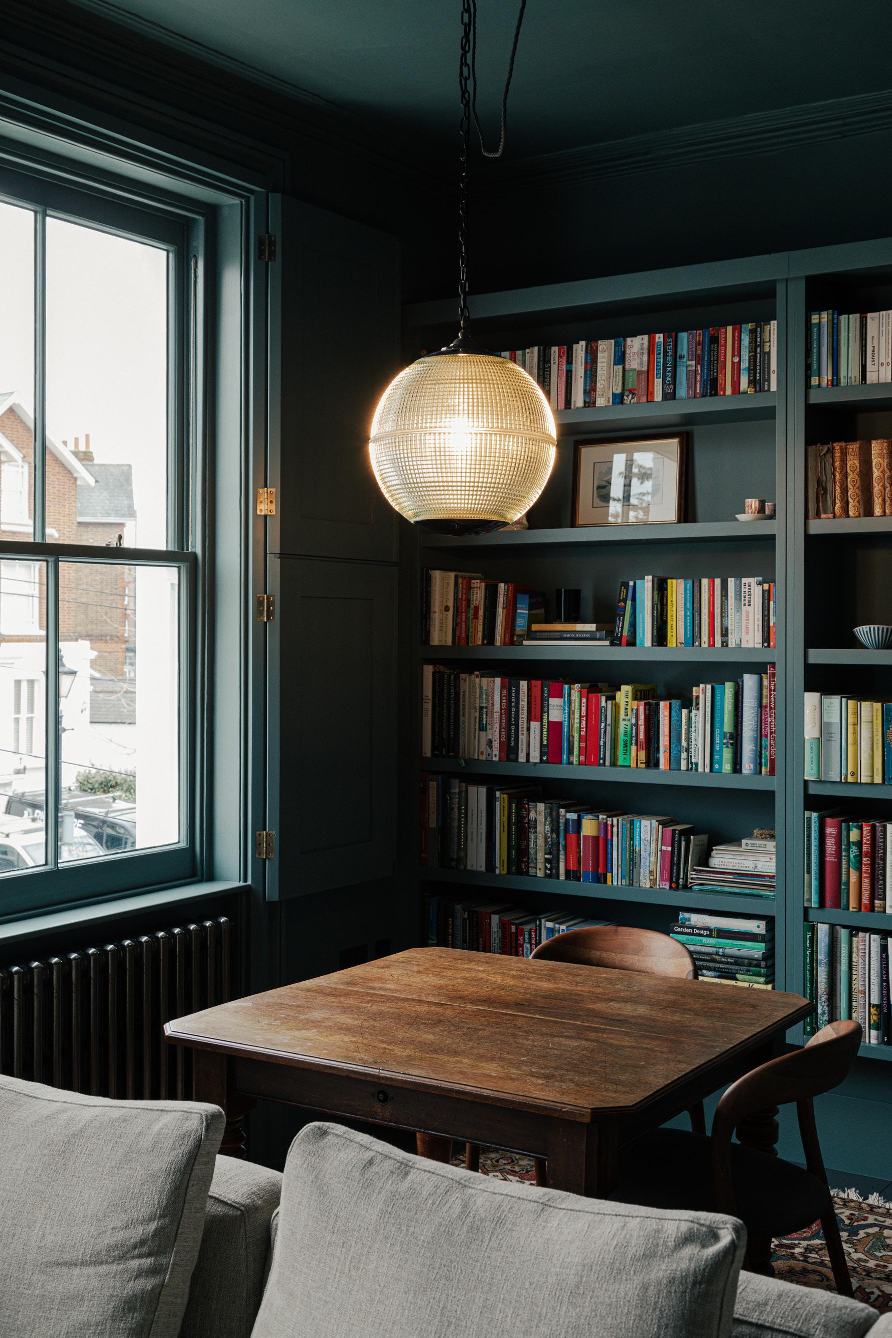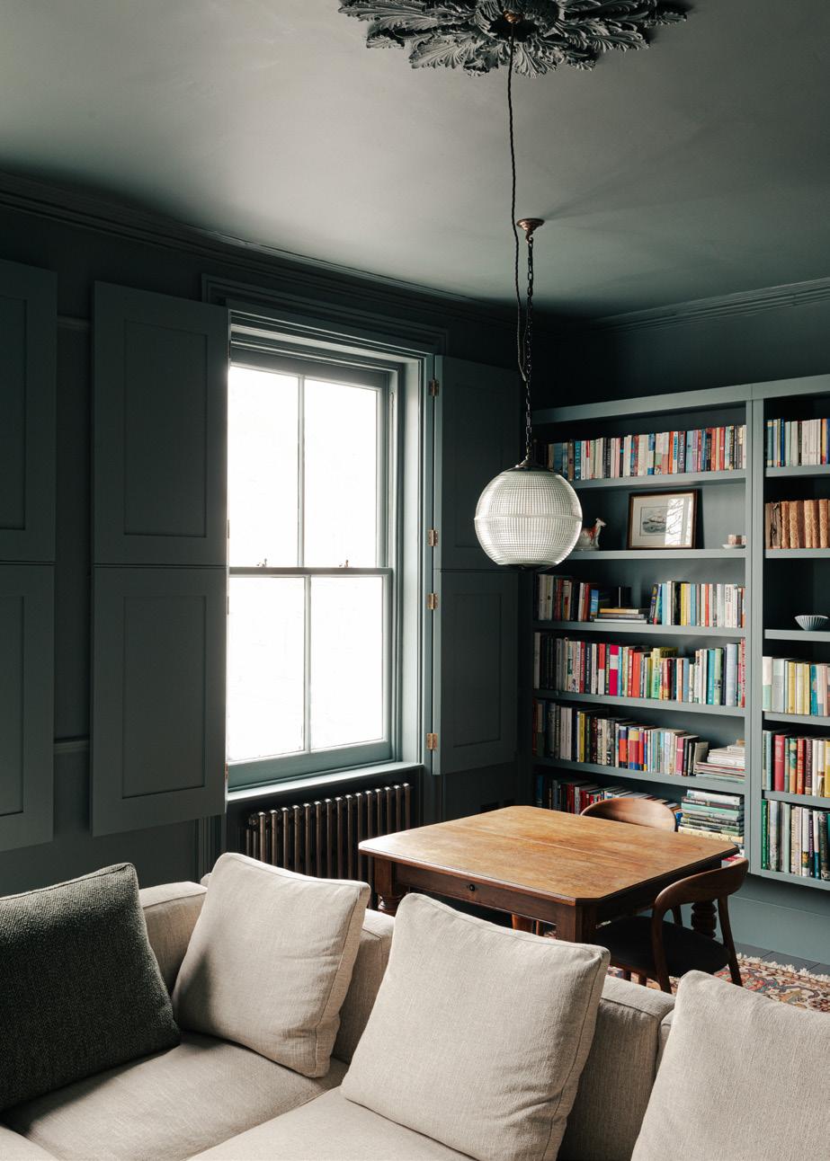 A separate basement flat was re-integrated with the main house and what had been a bedroom was converted into a study. The original stone fire surround had years of paint removed and the brickwork opening was repainted. New bespoke timber shutters and joinery complete the traditional feel of the room.