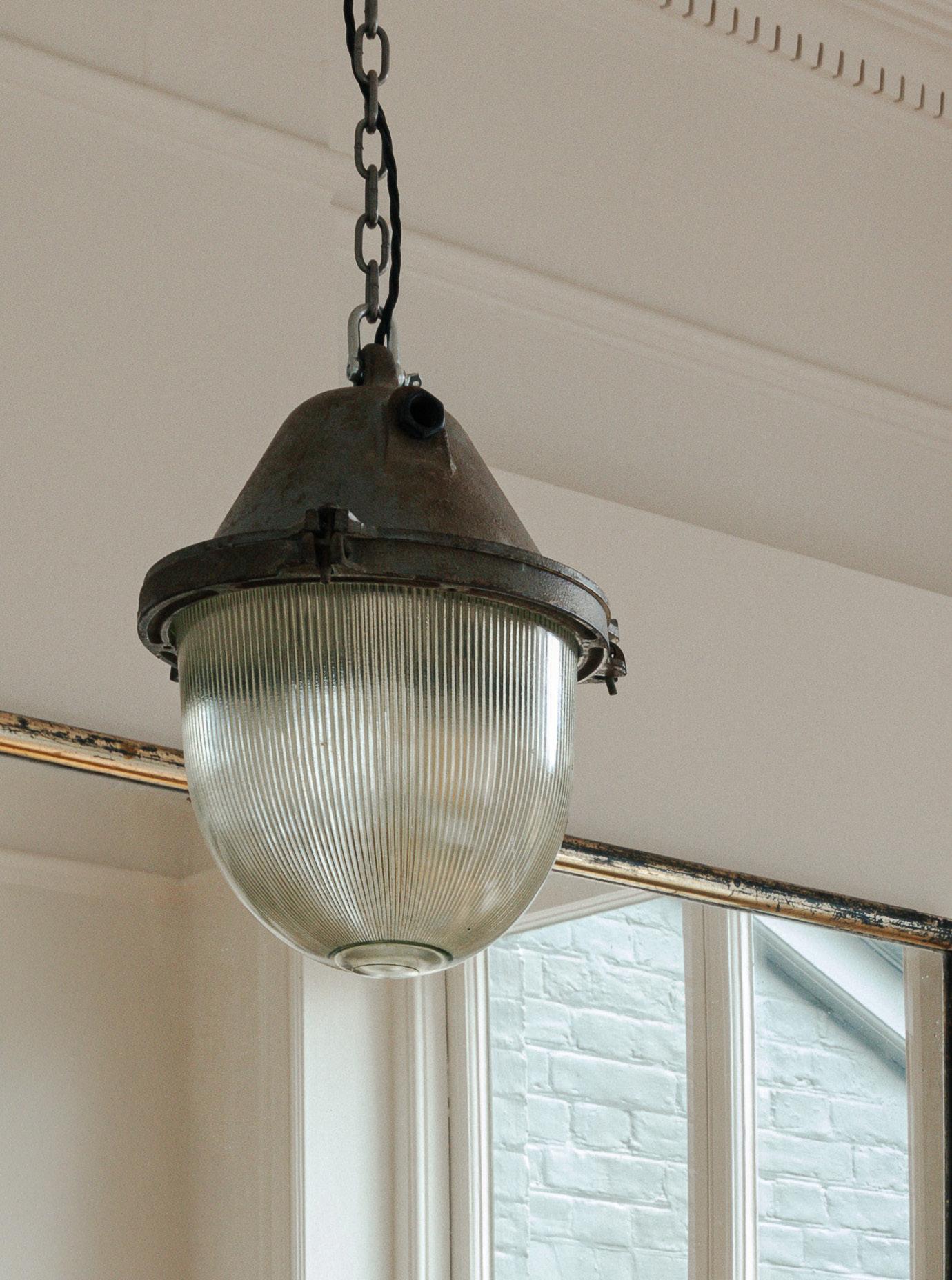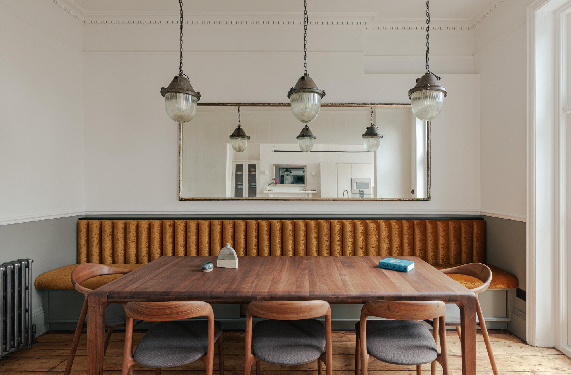 Reclaimed lighting and a vintage bistro mirror is paired with new, bespoke, contemporary joinery.