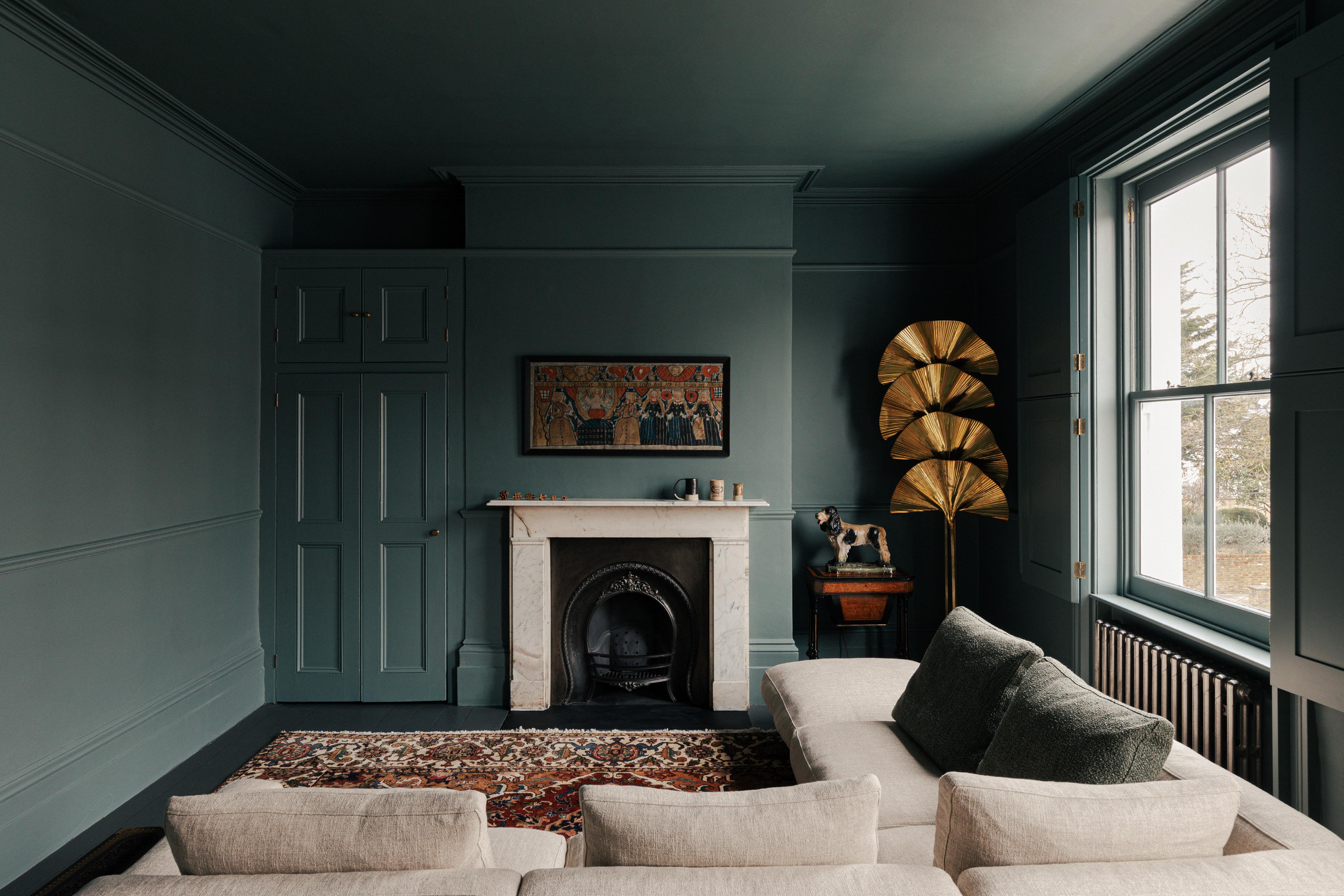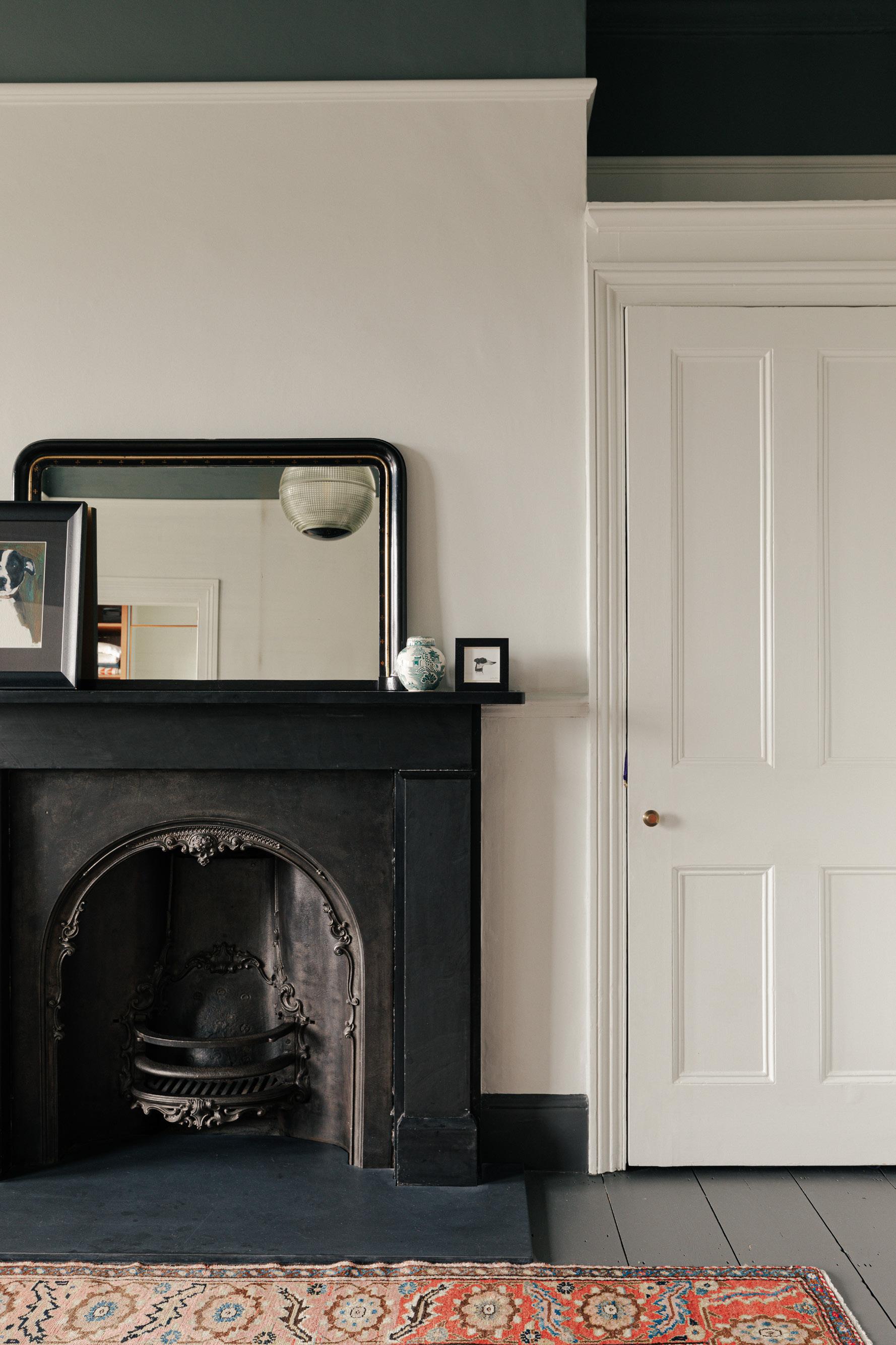 Image on the left showing restored fire place and door in master bedroom. A bold colour palette including a dark ceiling above picture rail creates a more contemporary feel to the room.