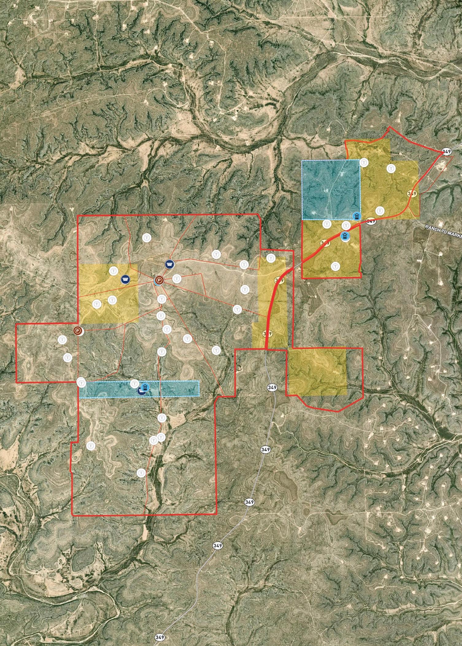 There is a 320 ± acre tract located inside the confines of the main body of the ranch that is owned by the current ranch tenant. This tract (depicted on the map in blue) has a water well and at least a couple of drinking troughs and a poly water storage reservoir. Additionally, there is another 640 ± tract located on the northern portion of the ranch (depicted on the map in blue) that is also owned by the current ranch tenant that is fenced into the property. Neither of these two tracts are fenced out from the rest of the ranch and both have been used in conjunction with the rest of the property.