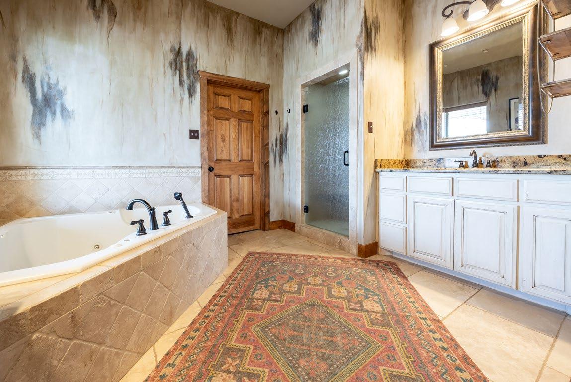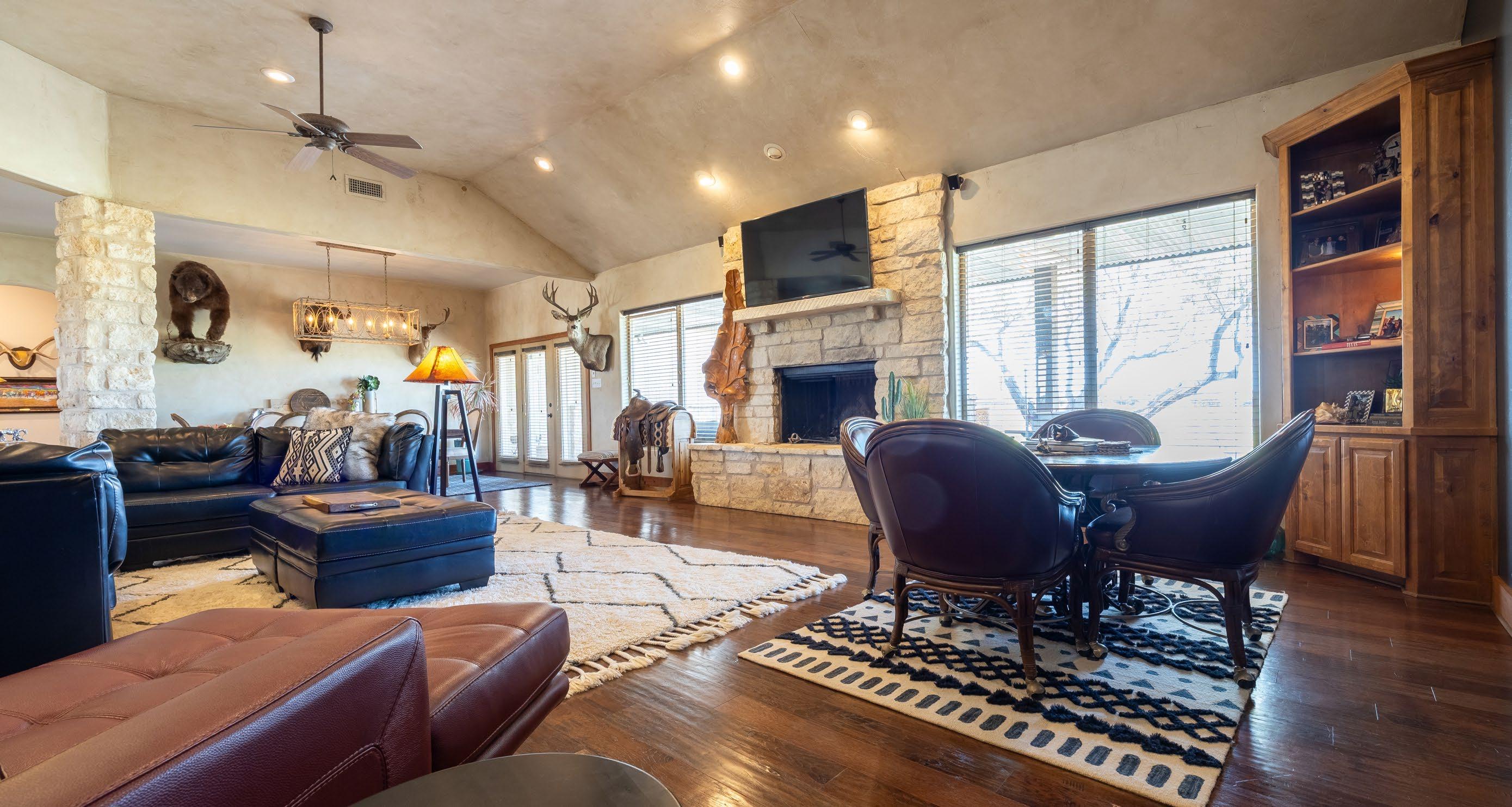 The Barrett Horse Property is very well improved and features a 3,218± sq. ft. 4 bed/3 bath ranch style limestone and stucco home with a metal roof. The home features a large open concept living room, kitchen, and dining room. The kitchen features all granite countertops, a large walk-in pantry, KitchenAid stainless appliances, custom rustic alder cabinets, and a large bar area. The living room and dining area consist of a large limestone wood-burning fireplace, limestone columns, and hardwood floors throughout.