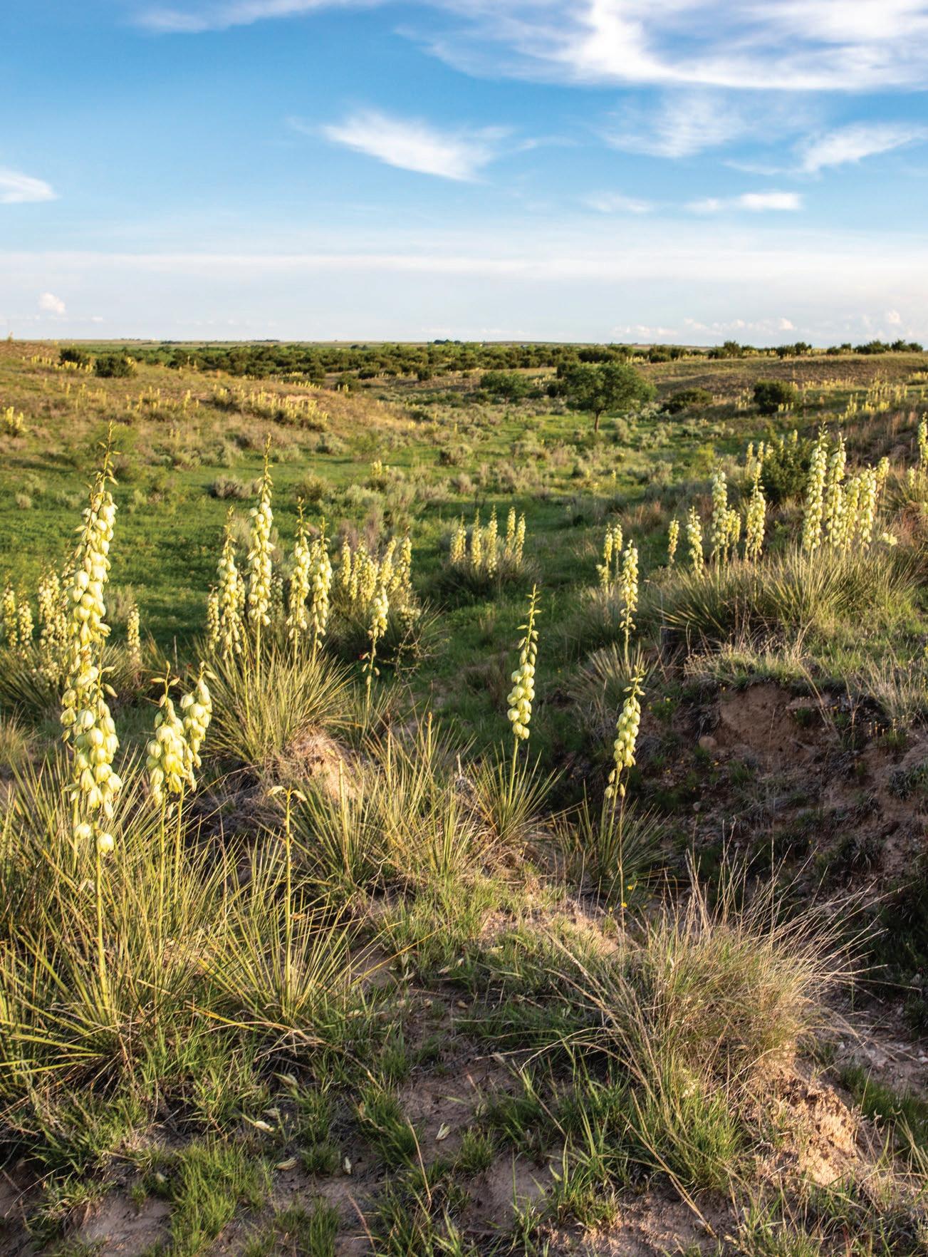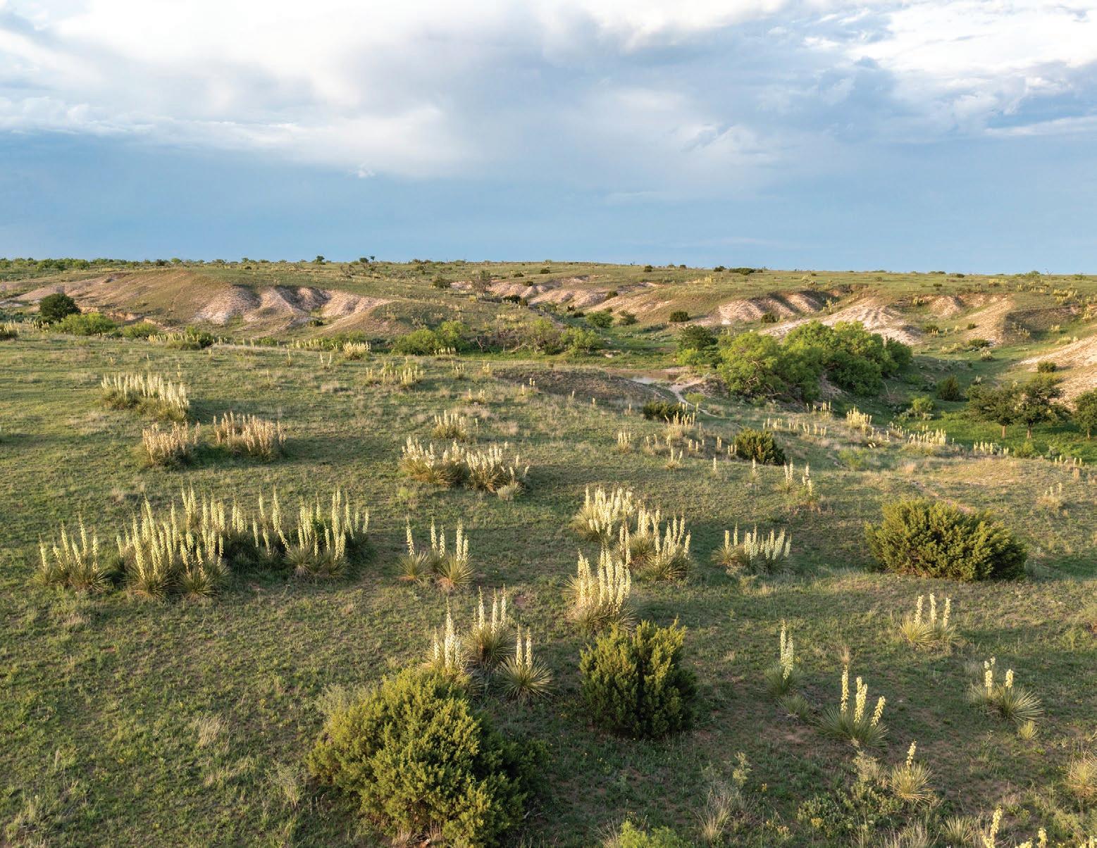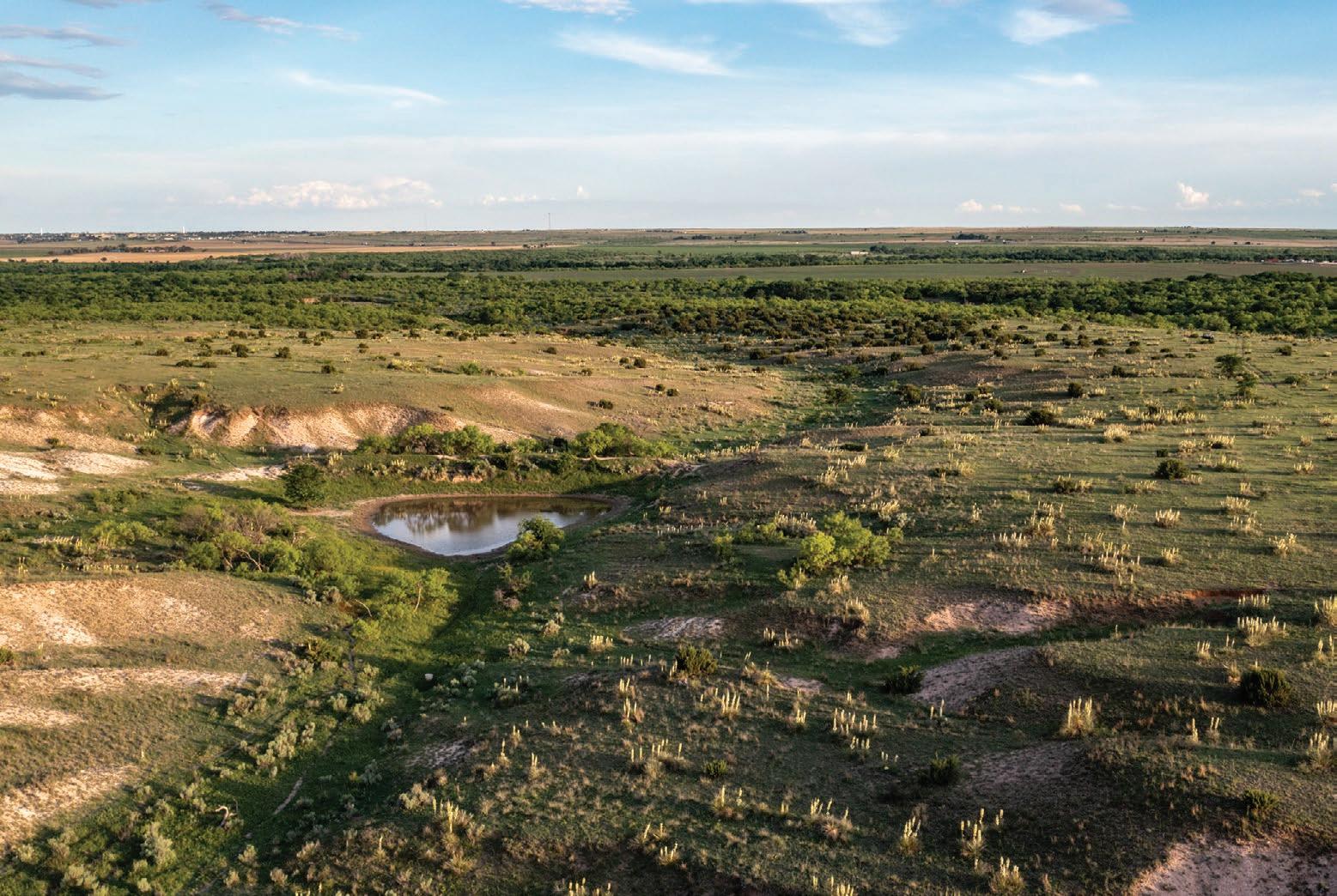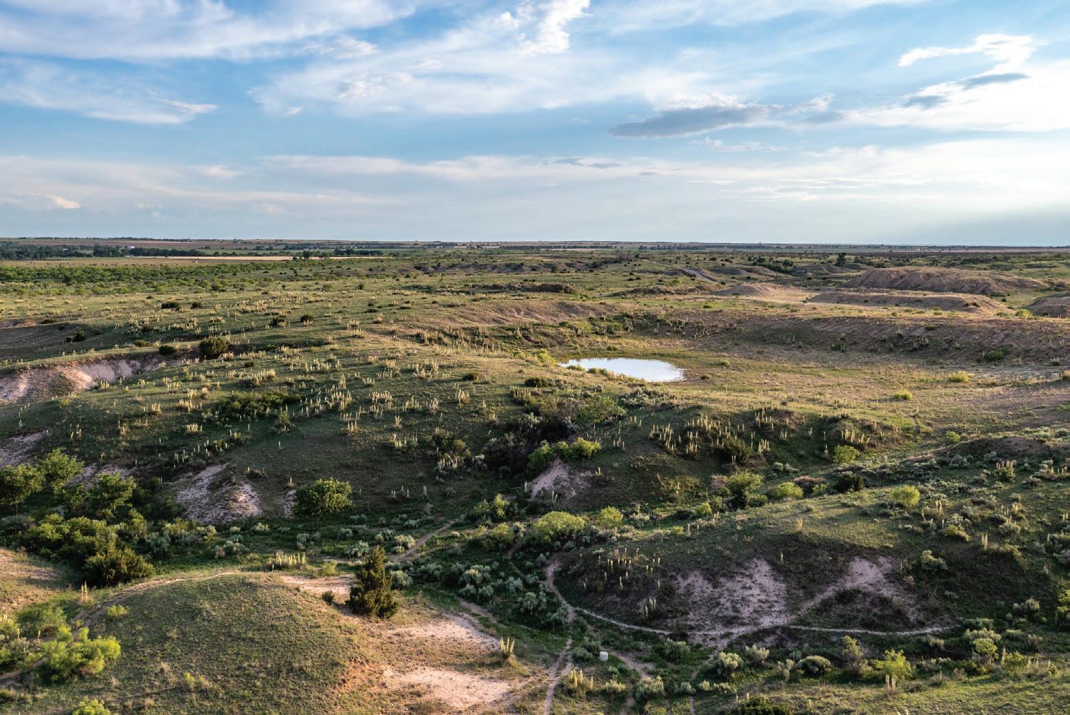 The landscape of the ranch is comprised of rolling to rough and sometimes broken native grassland, accentuated with multiple draws and valleys draining to the south. There is a gravel pit on the property that is currently not in use. The ranch has good cover for wildlife, with a lighter concentration of mesquite to the north, and denser mesquite and juniper on the southwestern and southern portions of the property. There are three dirt ponds on the ranch.