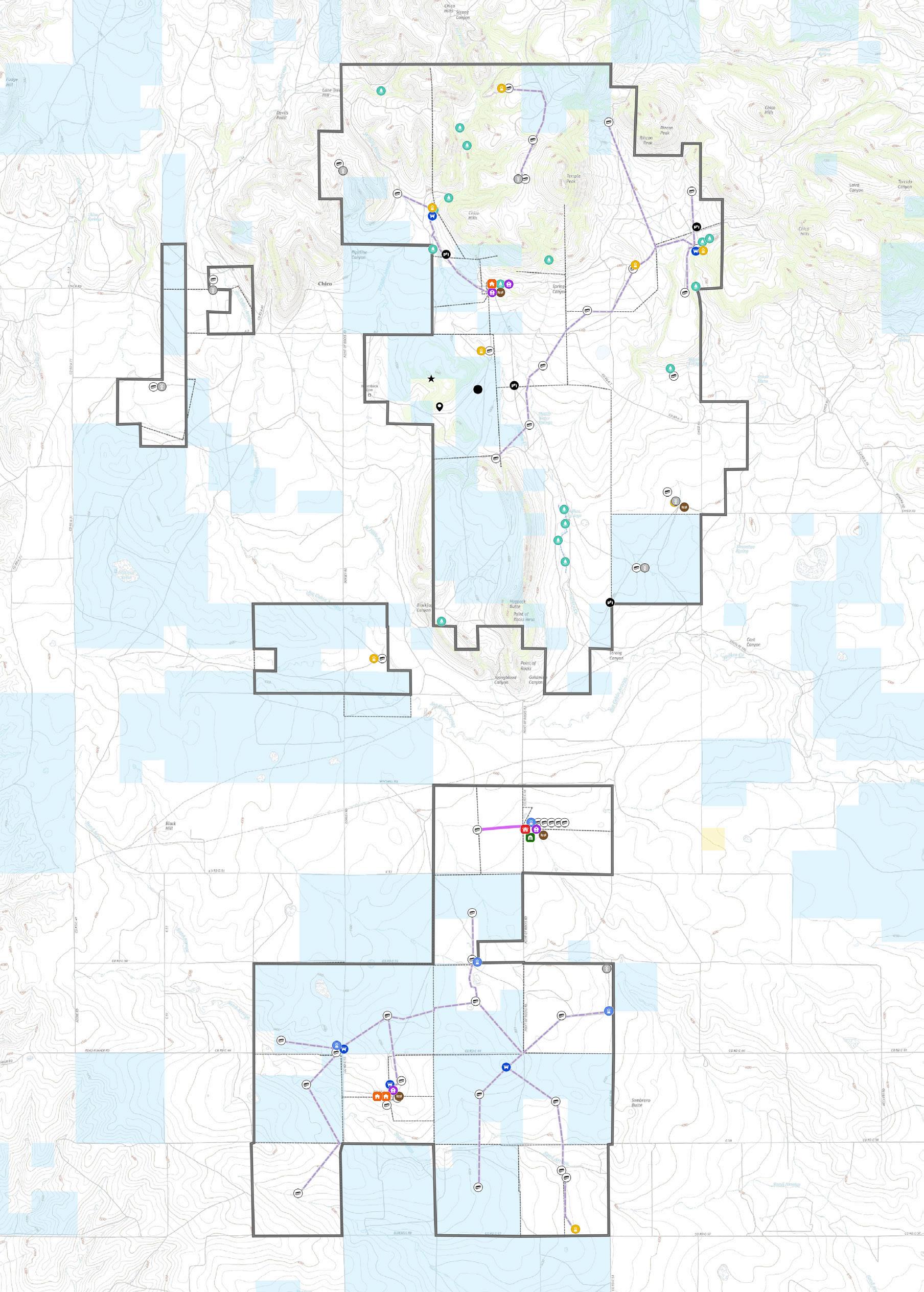 The north portion of the ranch is exceptionally well-watered, featuring seven natural springs and four pastures with live water—a rare and valuable combination. Supplementing the natural sources are six solar-powered wells and two windmills, ensuring reliable water distribution across this section. Working facilities include two sets of pipe pens, a 25,000-pound digital scale, a 36-ton cake bin, two shipping traps, a sturdy cinder block garage, and log barn.