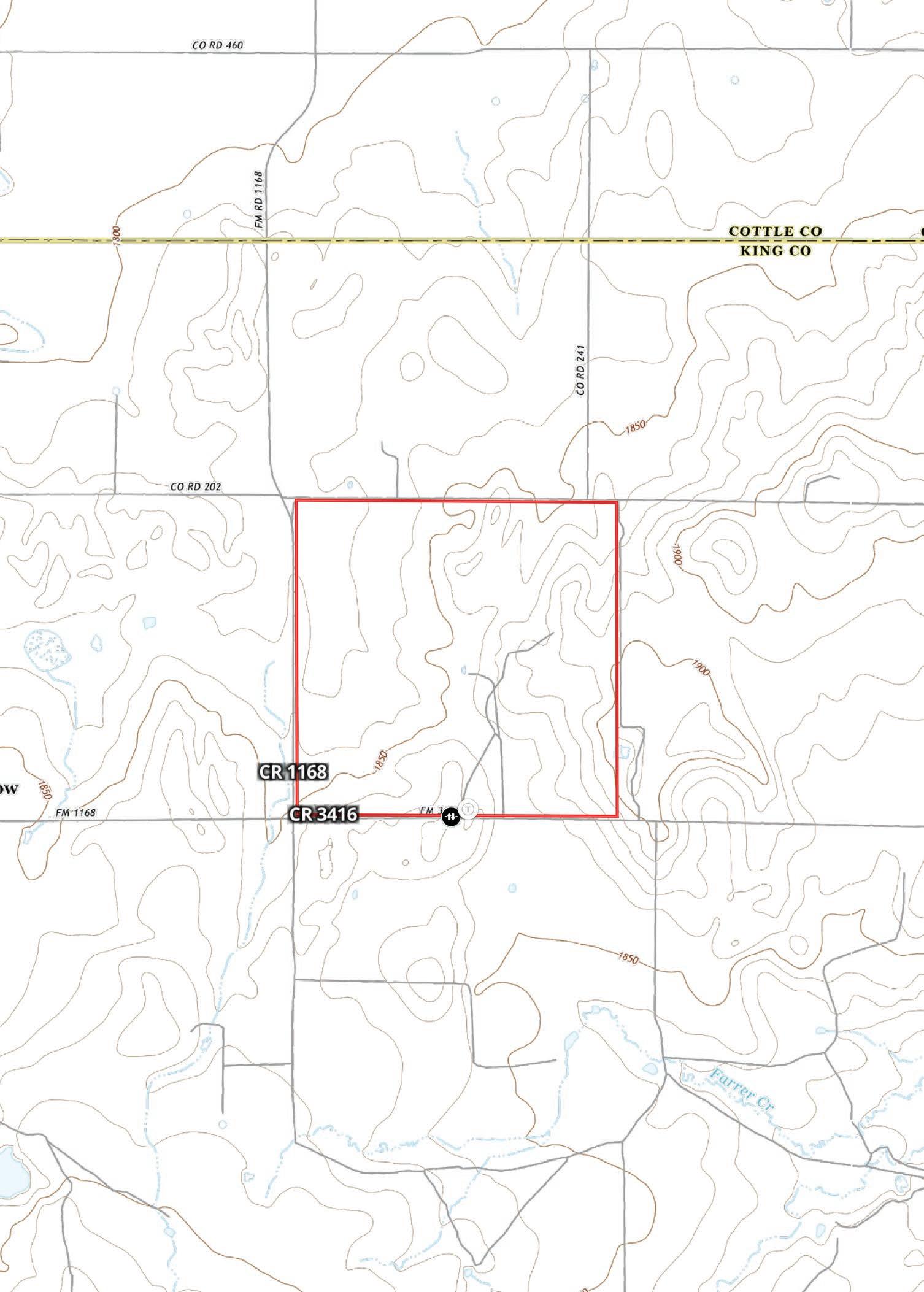Water supply for the property sources from the Cottle/King County Water Co-op and electricity is available via power lines that extends into the interior of the property via FM 3416 that borders the full extent of the southern boundary of the property. FM 1168 parallels the west boundary and CR 202 extends along the northern boundary fenceline. Exterior fence on the west boundary is excellent while the north boundary will require upkeep. The east and south fences are in fair condition.
