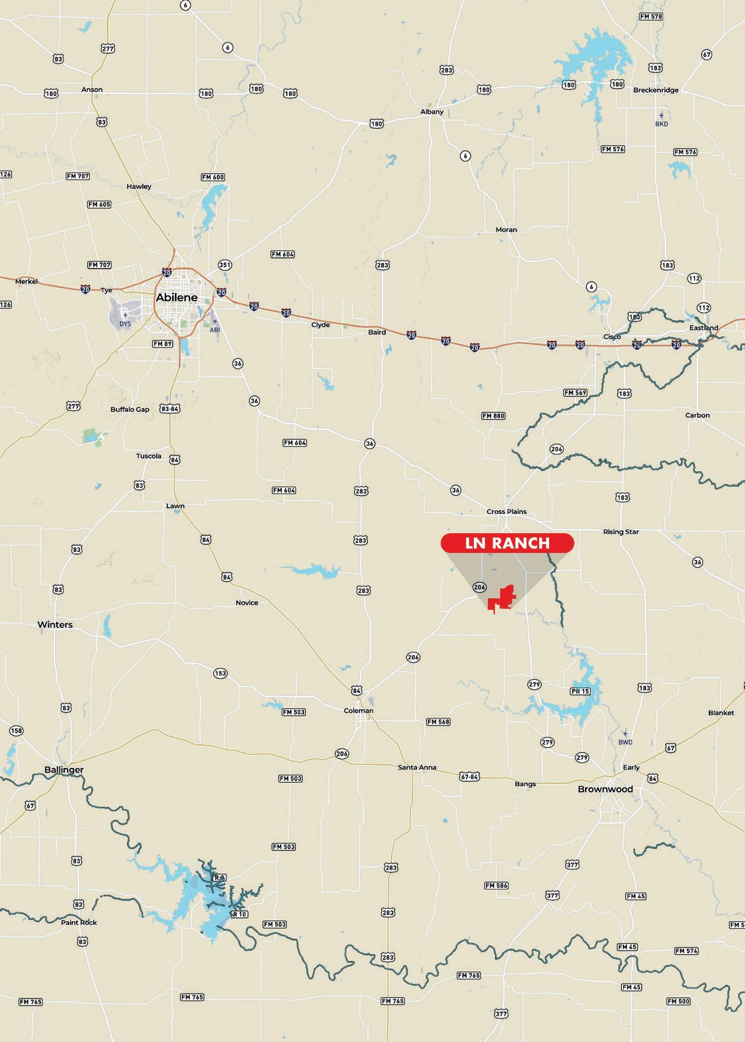 The ranch is in the far northwestern corner of Brown County, due south of Cross Plains. Access is provided by well-maintained county roads. Brownwood is 24 ± miles to the southeast, Coleman is 20 ± miles to the southwest and Abilene is 50 ± miles to the northwest.