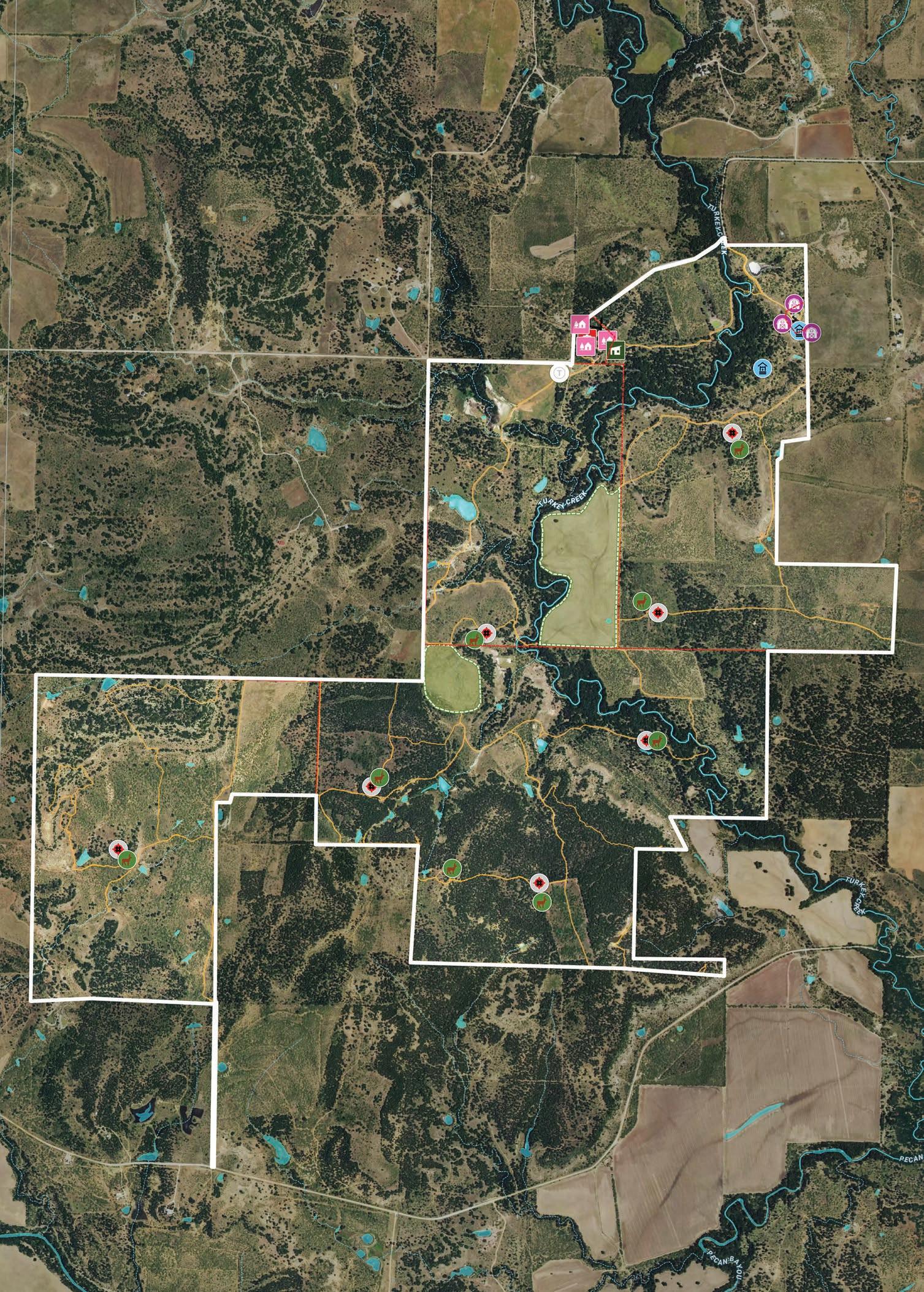 A wet weather creek, Turkey Creek, winds its way through the eastern portions of the ranch. This deep and winding creek bed is lined with large mature trees and will hold pockets of water throughout portions of the year.