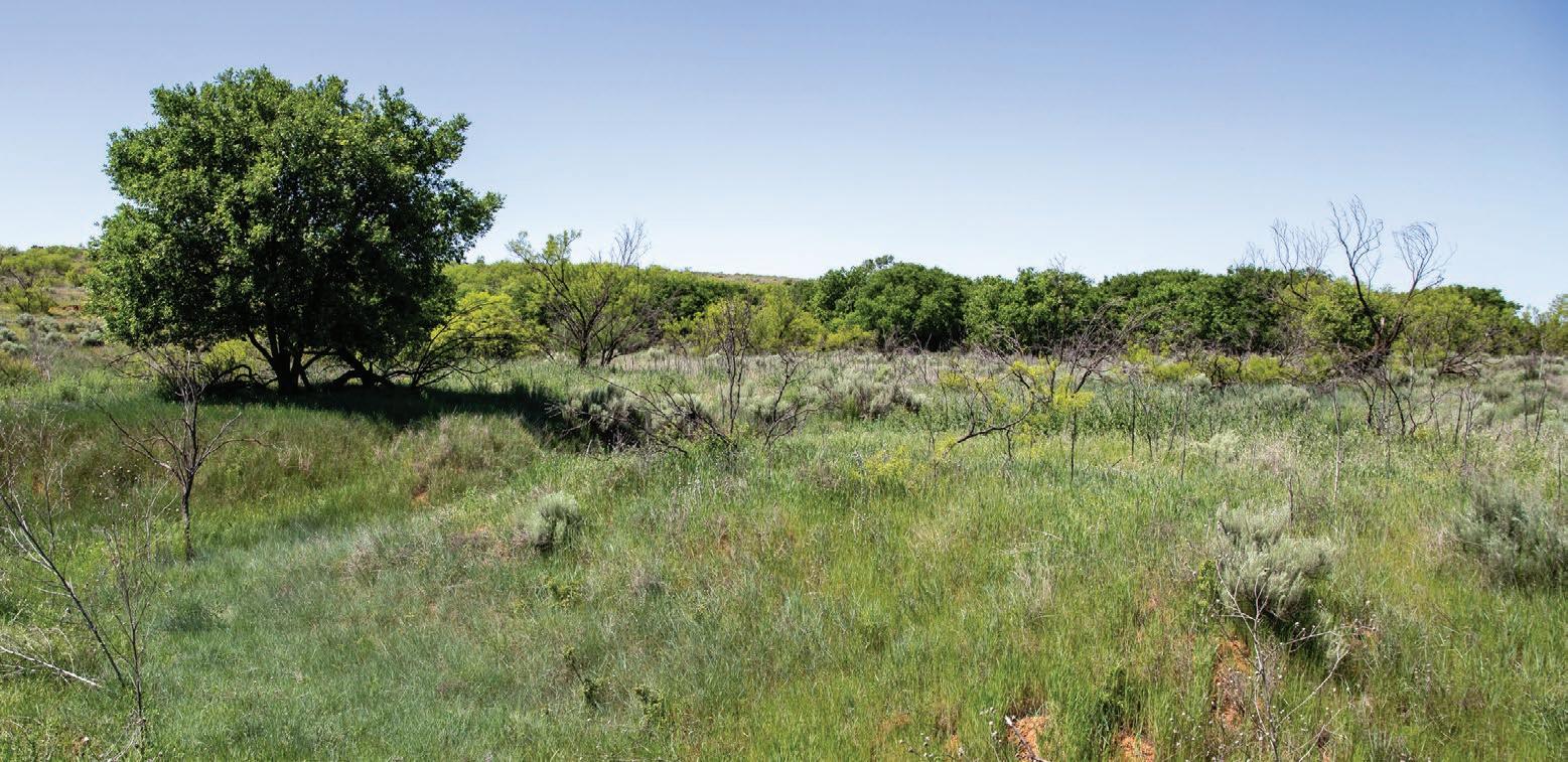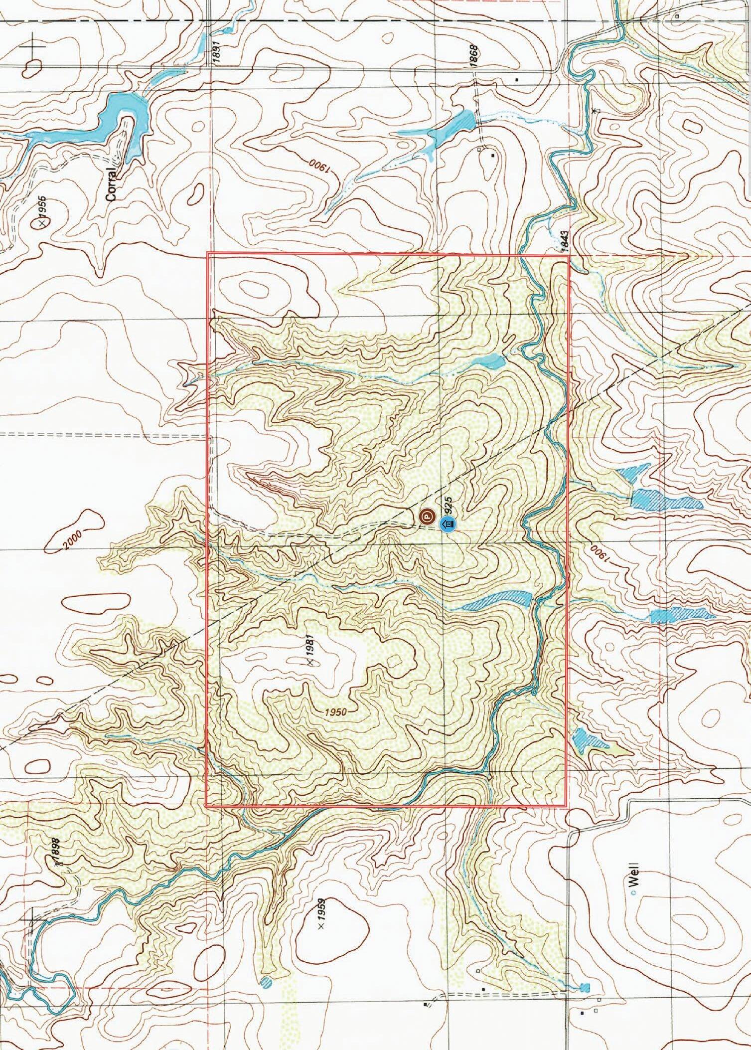 The ranch is mostly native grassland, with rolling hills, deep draws and valleys, large mature trees, and wet weather creek bottoms. The topography of the ranch provides dramatic changes in elevation, from 1,981 feet in the upper grasslands, to 1,850 feet in the lower valley along Jonah Creek. This creek traverses the ranch from west to east for over 2 miles. 115.01 acres of land were previously in farmground and is now enrolled in the CRP program. Soils on the CRP tracts are mostly level to gently rolling in topography and contain a good cover of CRP grasses.