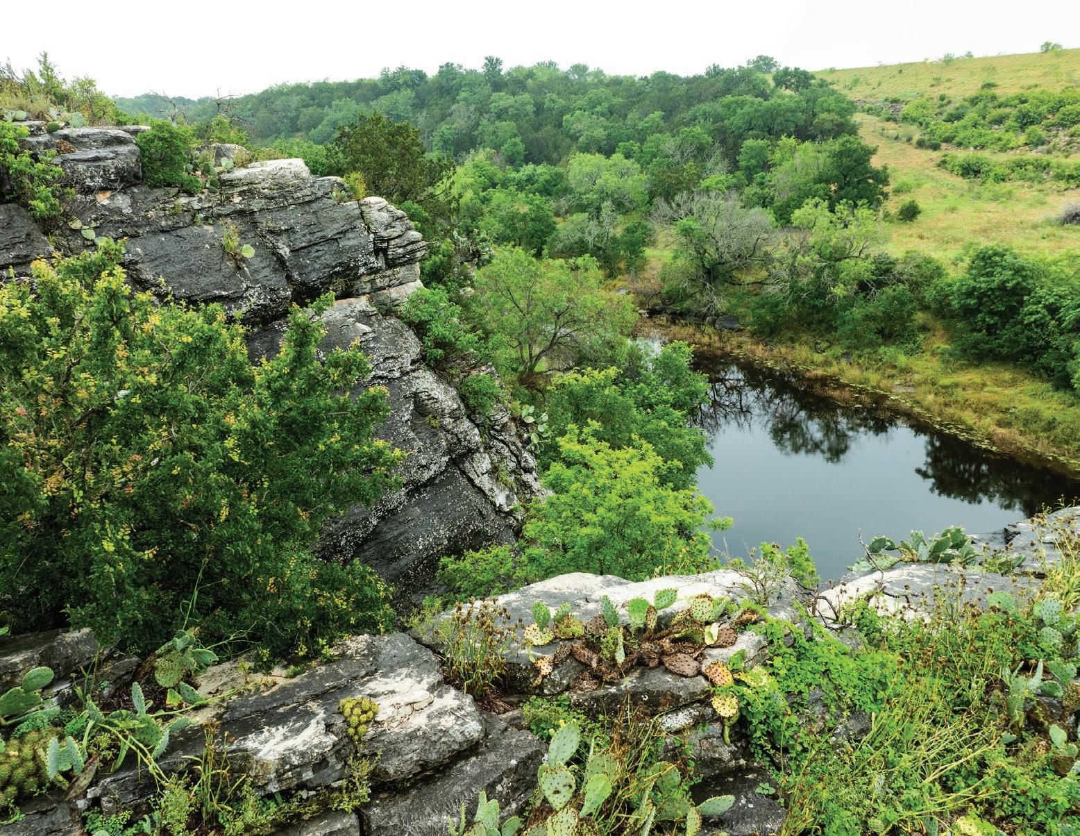 Pillar Bluff Creek meanders through this ranch for approximately 1.2 miles. This is a seasonal creek but maintains holes of water year-round except during extreme dry periods. The actual historic Pillar Bluff is located on the ranch. There are several other unique and attractive rock formations along Pillar Bluff Creek, including Owl Bluff where a large cave-like hole has formed in the side of a cliff along the creek.