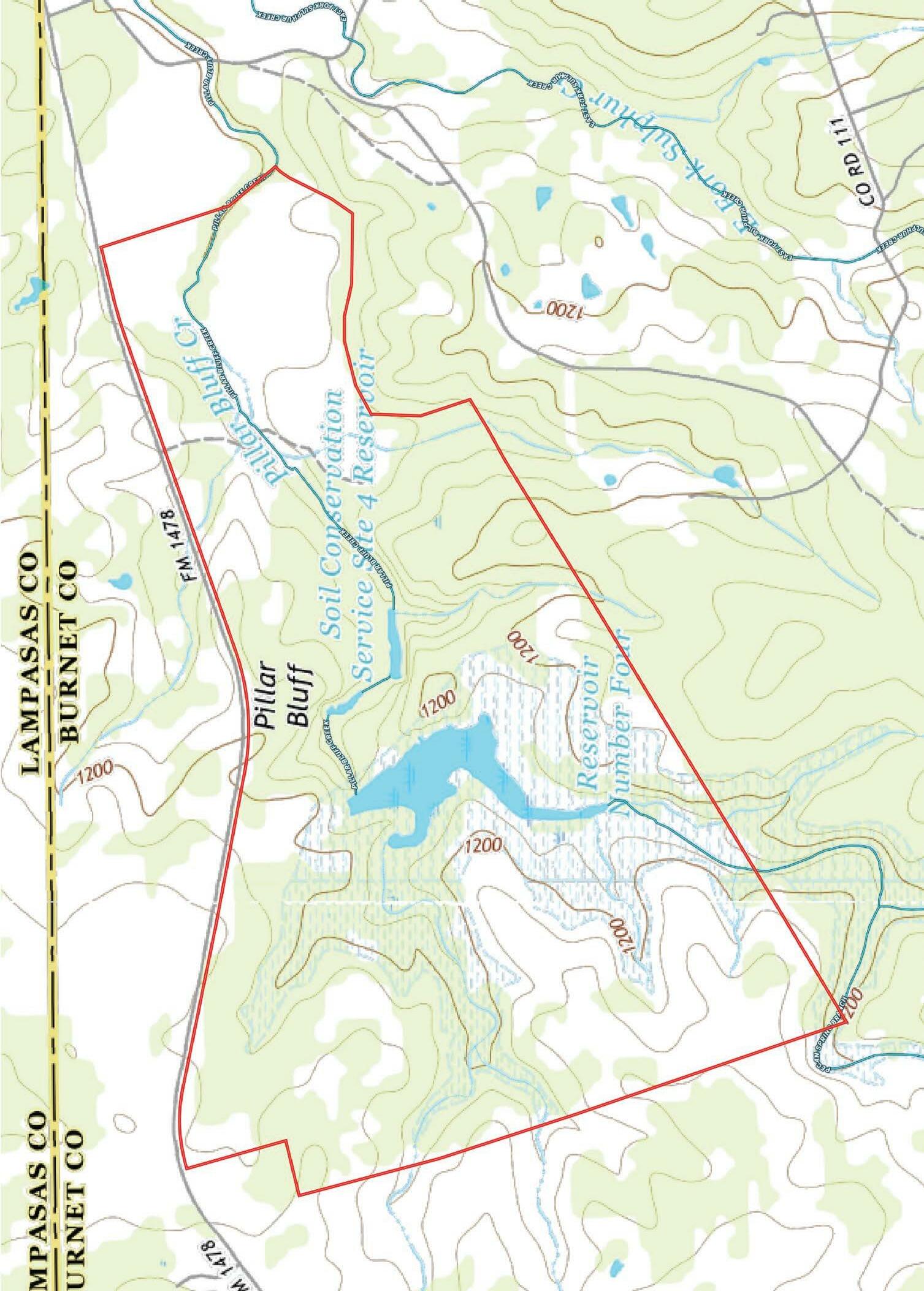The Pillar Bluff Ranch, consisting of approximately 680 acres, is located in north central Burnet County, 2 miles southwest of Lampasas. Pillar Bluff Creek meanders through the ranch for approximately 2 miles. The actual historic Pillar Bluff is located on the ranch. There are several other unique and attractive rock formations along Pillar Bluff Creek, including Owl Bluff where a large cave-like hole has formed in the side of a cliff along the creek. The property has 1.6 miles of frontage along FM 1478 (Naruna Road).
