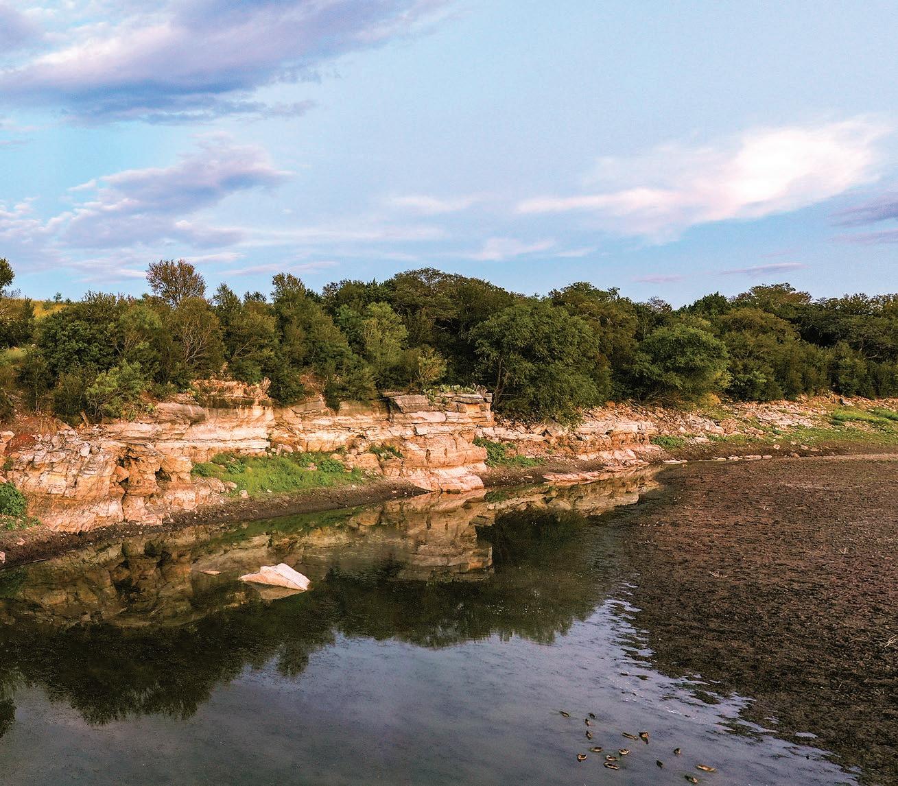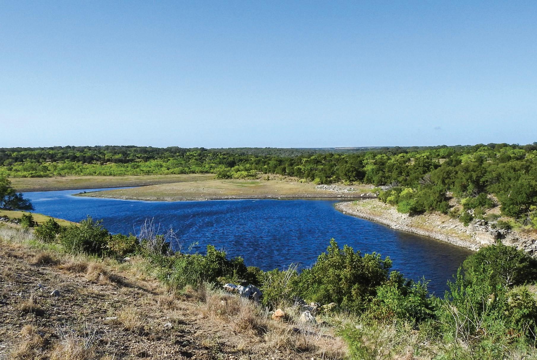 After the town of Lampasas was nearly destroyed by a flood in 1957, the Lampasas County Water Control & Improvement District was formed. They, in cooperation with the Soil Conservation Service and the U.S. Department of Agriculture, built a series of nine flood control dams. Flood Prevention Dam No. 4 was constructed on this ranch just above Pillar Bluff. The drainage area for the reservoir covers 10,589 acres. The dam height is 85 feet, and the pool area is stated to be 53 acres. The lake is estimated to cover approximately 24 acres when the water level is below the flood control outlet.