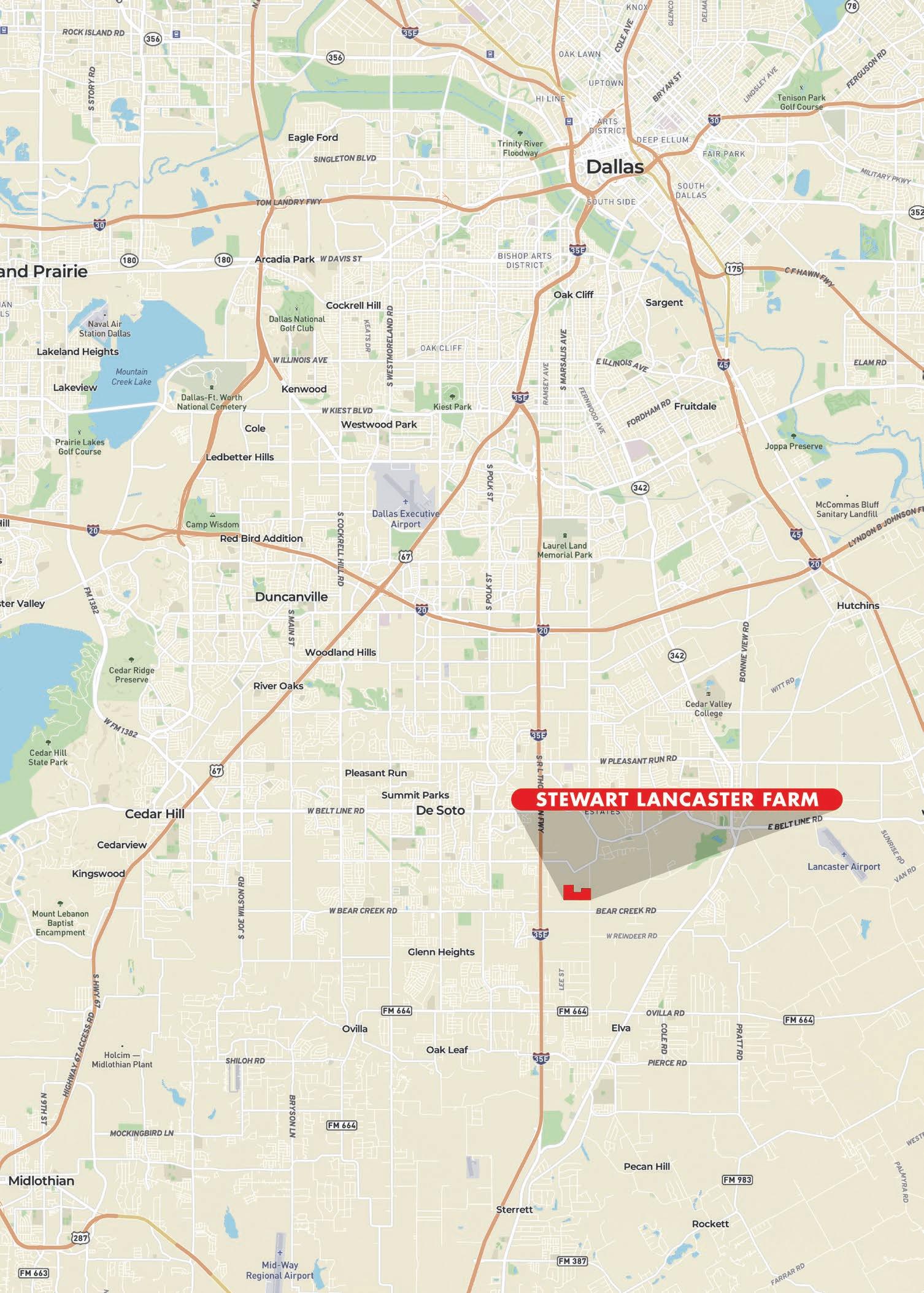 The Stewart Lancaster Farm is a 55-acre property, very centrally located south of downtown Dallas. The property is a very level piece of land that is currently being farmed but is ready for development.
