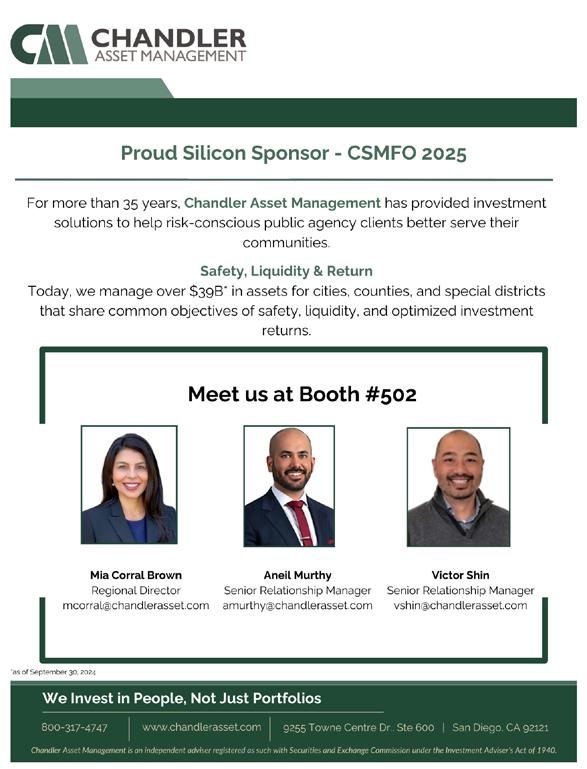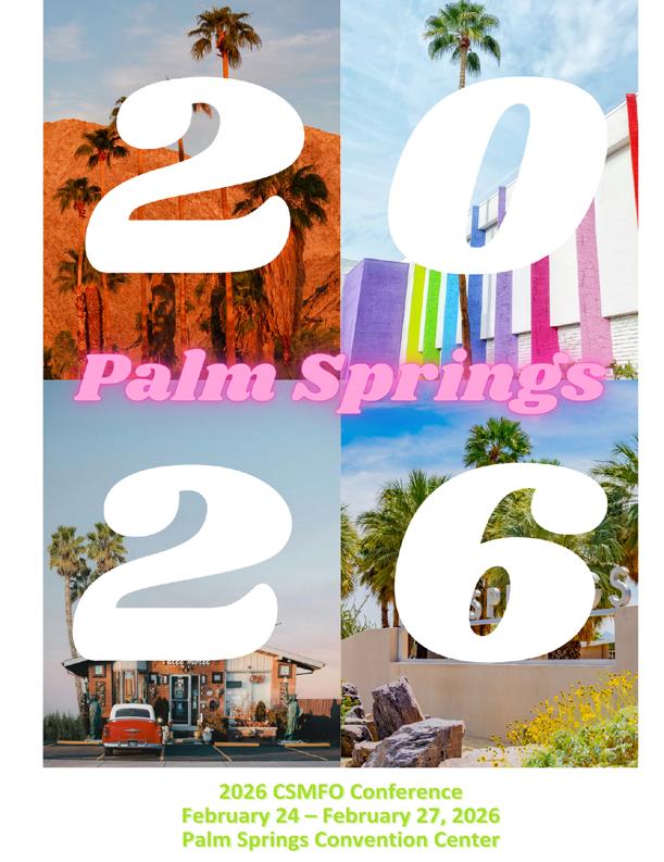 I look forward to an incredible year ahead and encourage everyone to mark their calendars for the 2026 CSMFO Annual Conference in Palm Springs from February 24-27, 2026. Let’s continue to come together to learn, evolve, and inspire the future of government finance!