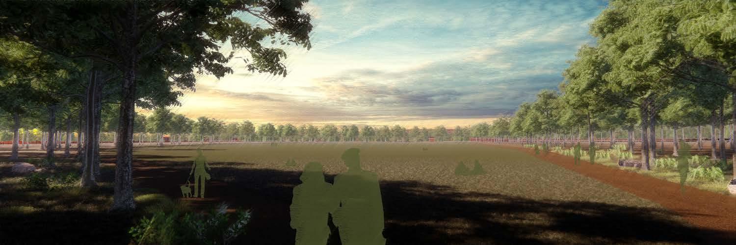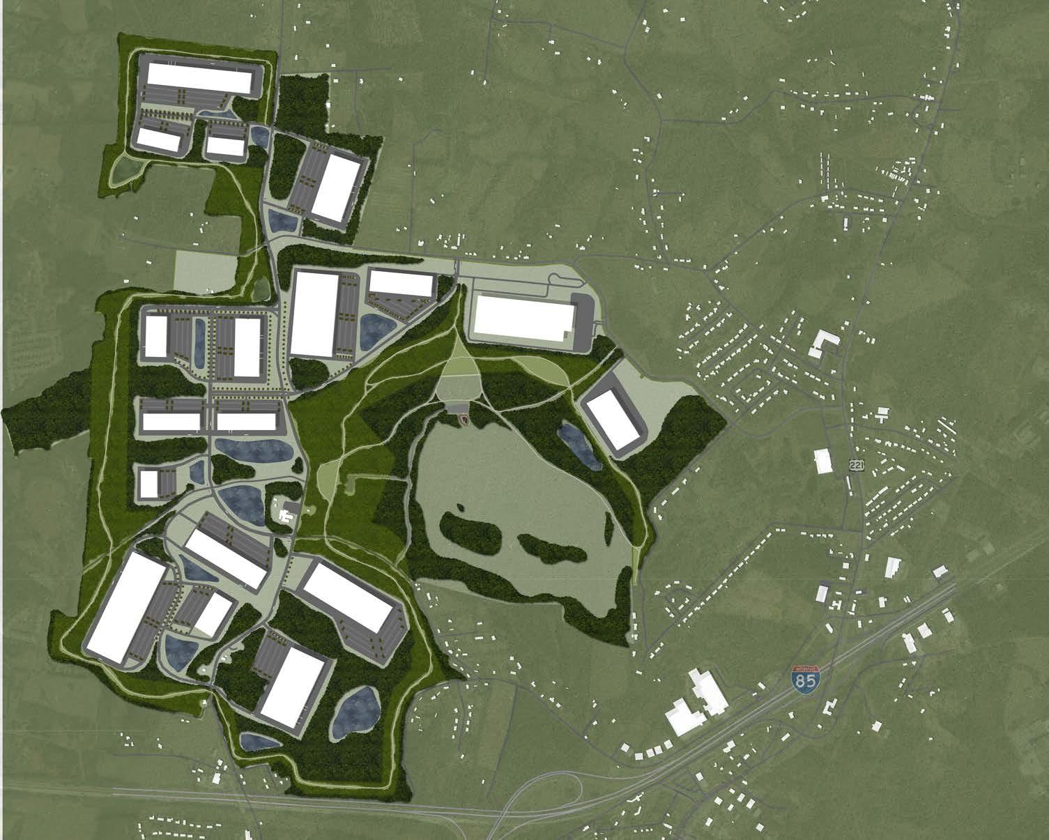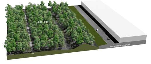 With my new plan, I was still able to keep over 6 million sq. feet of industrial space with an additional 600,000 sq. feet of office space. Rather than intermixing the surrounding residential areas with the new industrial complex, I created a greenbelt, or buffer zone, that runs the entire perimeter of the industrial development. The buffer is a system of mounds and trenches that collects water then sends it into either wetlands or into retention ponds. These mounds also help keep the wildlife in, away from the development. Also within the greenbelt are a series of parks and over 10 miles of nature trails.
