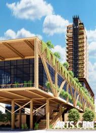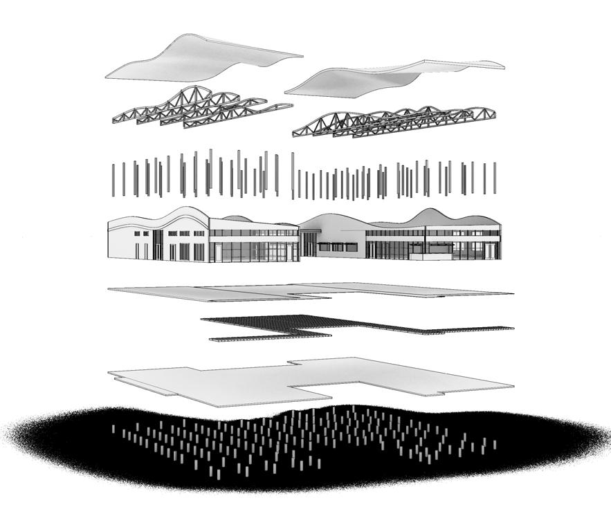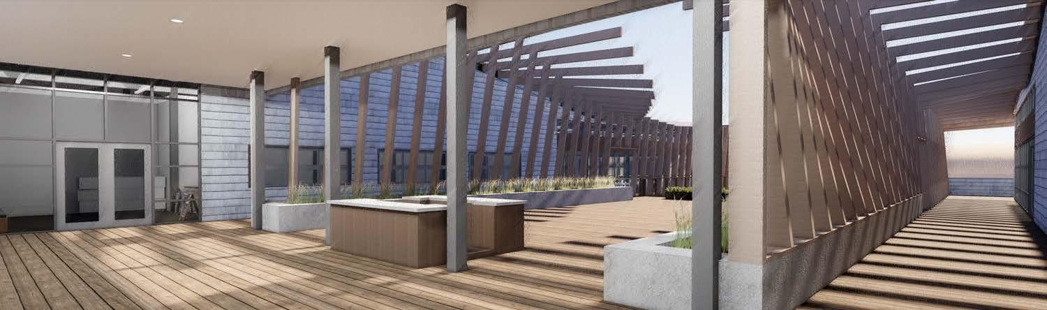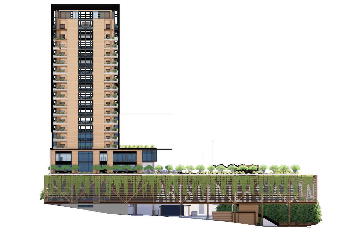 Our project, the Biome Bridge, placed emphasis on the sustainable implications of mass timber construction, allowing the environmental systems to shape the project. The building itself consists of a bridge which extended from the higher elevation on Arts Center Way, and over W Peachtree Street, better connecting the rail and bus stations in the process. This bridge contained the market along with housing support. Over the easternmost side of the bridge sat a two-story community center with a 14-story residential tower above. The community center overlooked an extensive vegetated terrace which rested atop the bridge. The tower’s design was influenced greatly by solar orientation and natural ventilation. Its striking aluminum fins and series of south-facing, threestory atriums not only make for a beautiful design, but also strategically manipulates sunlight for optimal light and thermal quality. Additionally, there are two exterior plazas, a hardscaped entry plaza for art displays along W Peachtree and a landscaped park along 15th Street which include community garden, a lawn, and vendor spaces.