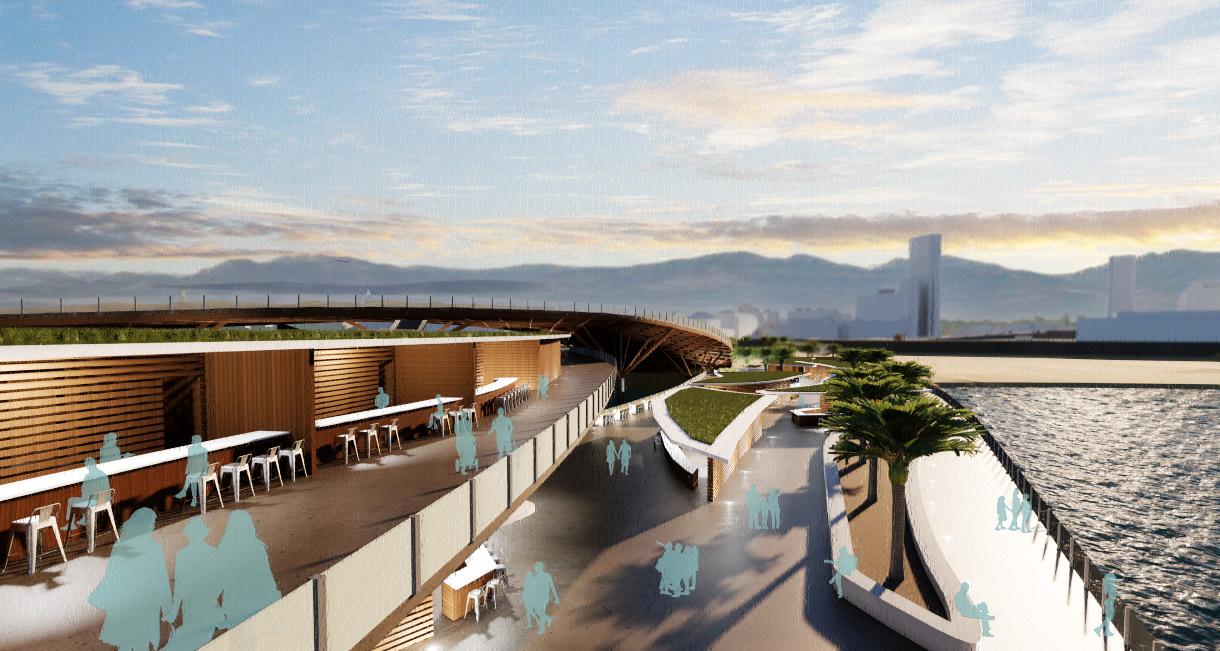 After observing the different programs lacking in the immediate vicinity, my partner, India Young, and I decided to design a large food market on the site. However, as mentioned, because of the site’s location at the end of a chain of parks, my partner and I wanted our project to serve as a continuation of this chain rather than creating a large enclosed building. Functioning as a threshold to the sea, the idea of a delta became our leading influence. Using four intertwined platforms, we created an open-air market that allowed visitors to enter from the beach and freely disperse throughout the space. On two of the platforms are small vendor buildings each with their own green roofs where produce can be grown. On the top overarching platform is a large green space, planters for more produce, a bike path, and even an area for fishing off of the breakwater.
