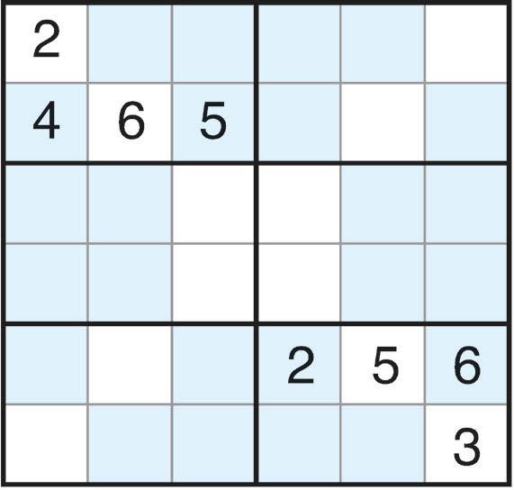 Complete the grid so that every row, column, diagonal and 3x3 box contain the numbers 1 to 9. Complete the grid so that every row, column, diagonal and 3x2 box contain the numbers 1 to 6. ● Each row and each column must contain the numbers 1 through 4 (easy) or 1 through 6 (challenging) without repeating. ● The numbers within the heavily outlined boxes, called cages, must combine using the given operation (in any order) to produce the target numbers in the top-left corners. ● Freebies: Fill in single-box cages with the number in the top-left corner. KenKen is a registered trademark of KenKen Puzzle LLC. ©2023 KenKen Puzzle LLC. All rights reserved. Dist. by Andrews 2-19-23 1 Each row and each column must contain the numbers 1 through 4 (easy) or 1 through 6 (challenging) without repeating. 2 The numbers within the heavily outlined boxes, called cages, must combine using the given operation (in any order) to produce the target numbers in the top-left corners. 3 Freebies: Fill in single-box cages with the number in the top-left corner. ● Each row and each column must contain the numbers 1 through 4 (easy) or 1 through 6 (challenging) without repeating. produce the target numbers in the top-left corners. ● Freebies: Fill in single-box KenKen® is a registered trademark of KenKen Puzzle LLC. ©2023 KenKen Puzzle LLC. All rights reserved. Dist. by Andrews McMeel. www.kenken.com 2-19-23 ● Each row and each column must contain the numbers 1 through 4 (easy) or 1 through 6 produce the target numbers in the top-left corners. ● Freebies: Fill in single-box KenKen® is a registered trademark of KenKen Puzzle LLC. ©2023 KenKen Puzzle LLC. All rights reserved. Dist. by Andrews McMeel. www.kenken.com 2-19-23 ● Each row and each column must contain the numbers 1 through 4 (easy) or 1 through 6 (challenging) without repeating. ● The numbers within the heavily outlined boxes, called cages, must combine using the given operation (in any order) to produce the target numbers in the top-left corners. ● Freebies: Fill in single-box cages with the number in the top-left corner. KenKen is a registered trademark of KenKen Puzzle LLC. ©2023 KenKen Puzzle LLC. All rights reserved. Dist. by Andrews McMeel. www.kenken.com 2-19-23 123 456789 10111213 14 15 16 17 18 19 20 2122 23 2425 26 272829 30 31 32 33 34 35363738 3940 41 42 43 4445 46474849 50 51 52 53 5455 56 5758 59606162 63 64 65 66 67 68 ACROSS 1 Recede 4 Submit, as homework 10 “Yeah ... I don’t think so” 14 Gymnast Suni of Team U.S.A. 15 Plaza resident of fiction 16 What some flakes are made of 17 59-Across from someone who’s paying? 19 Thus 20 Feature of Jupiter’s moon Europa 21 Apple f ield worker? 23 Acronymic title for a legendary athlete 26 23-Across, in boxing 27 Purchase 30 59-Across from an anxious caller?