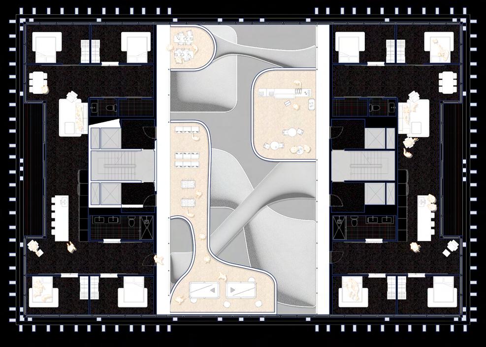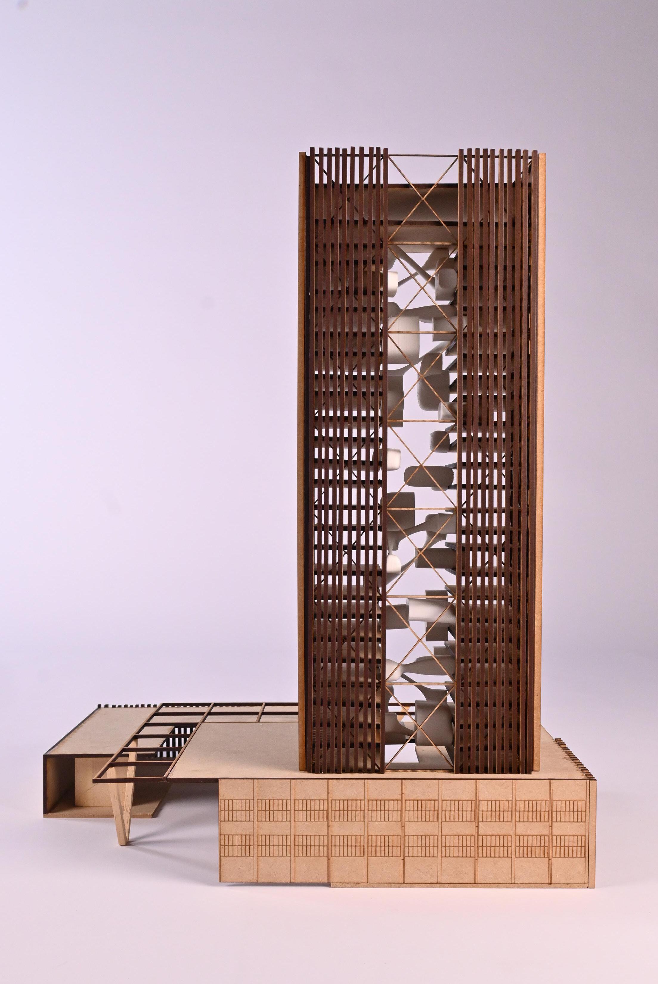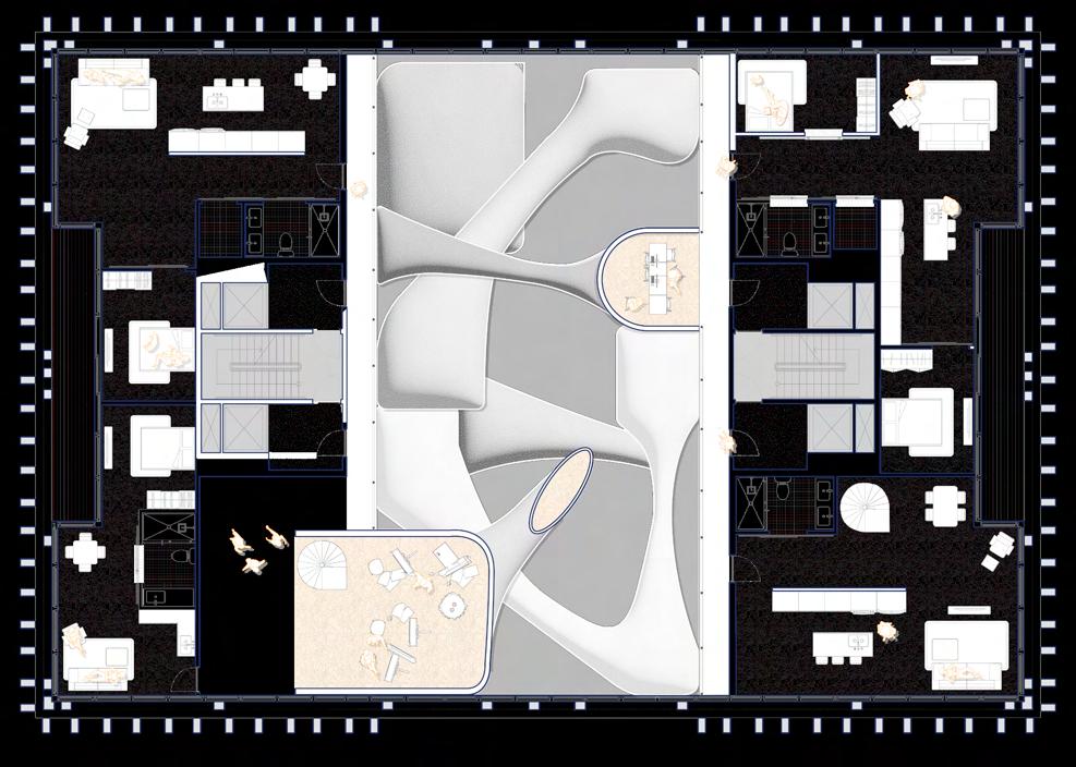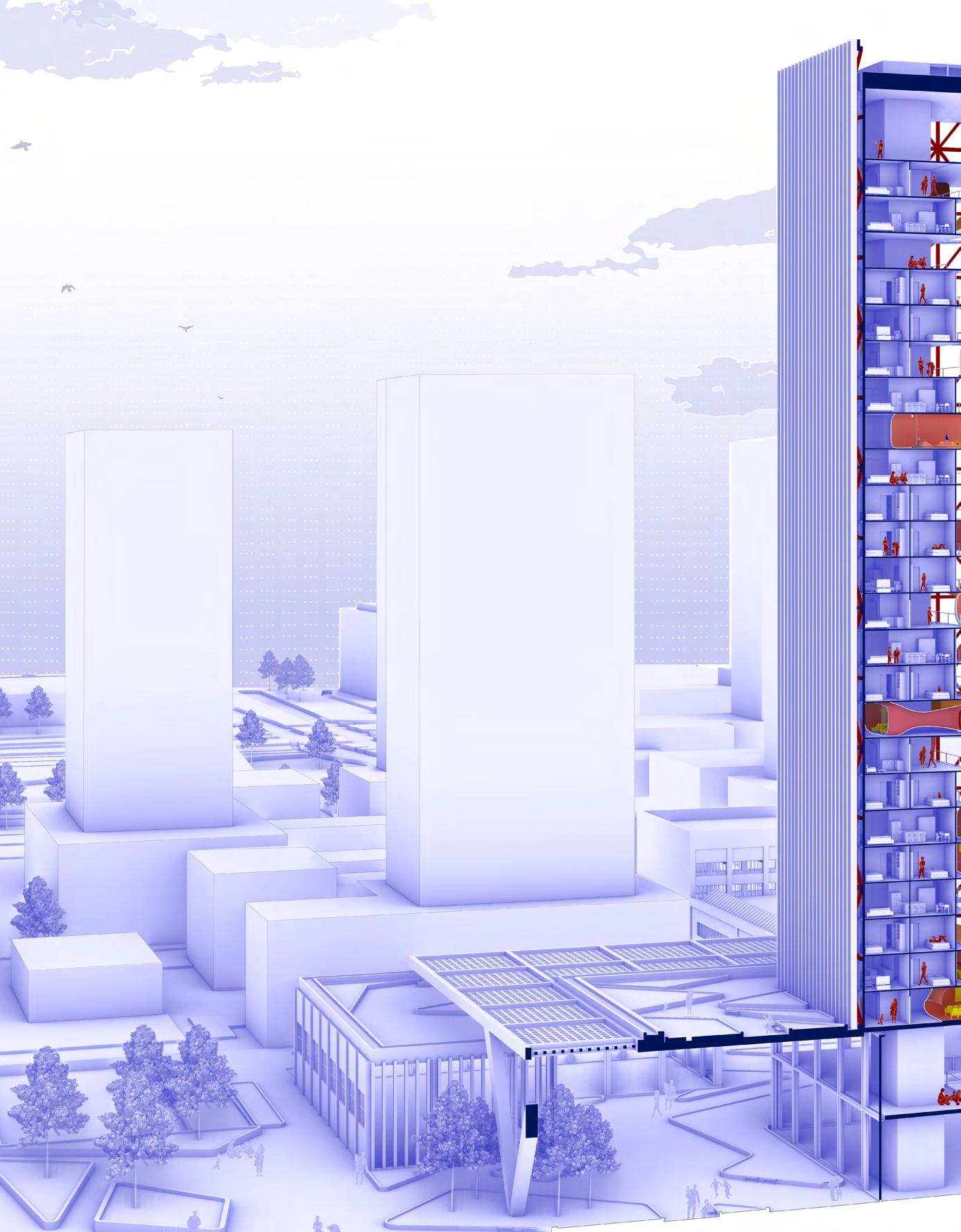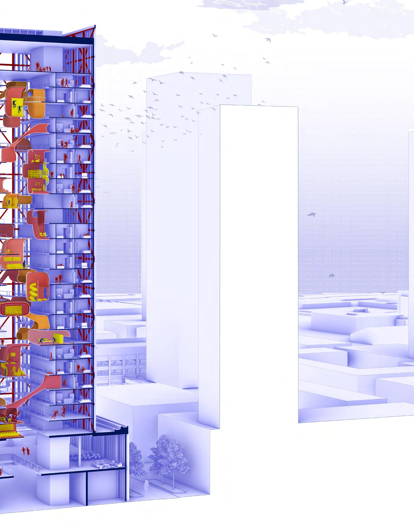 The project aims to explore the issues associated with high-rise living and attempts to provide a remedy through playful exploration, to enhance the sense of community within these “villages in the sky”. The vertical playscape located in the center of the two towers is meant to promote engagement and interaction amongst the residents and the community itself through a series of nodes that break up the purely vertical nature of the structure and provide shared spaces to the community. The project’s light-hearted desire to break down the silo’d nature of the high-rise is expressed throughout the structure, from the multi-leveled amorphous shape of the playscape nodes to the abstract meaning of the structure’s facade design, which aims to obfuscate the playscape and present itself as a “typical” high-rise structure to evoke the game of hide and seek.