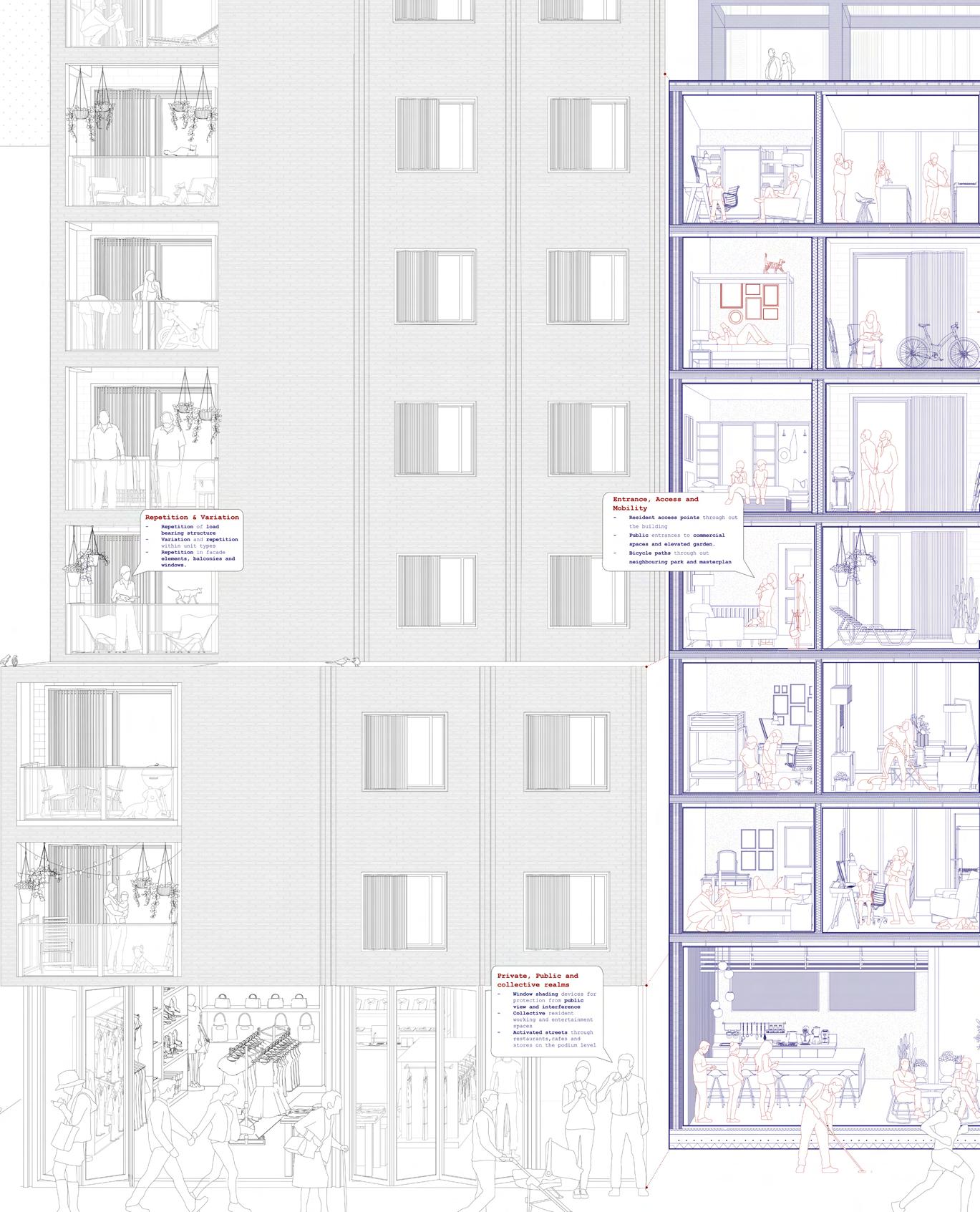 The Fundamentals of Housing Design studio engages in all aspects of contemporary housing design, throughout the different scales: from the individual dwelling to an inclusive city neighbourhood. Through a series of design and analysis we are able to explore the relationships between of linking & stacking, repetition & variation, access & circulation, type and typology, while consciously applying concepts of structure and spatiality, sustainability and climate responsiveness, materiality and expression. A group of twelve students composed the urban plan which is made up of five housing blocks, with a set of rules to be followed by each student throughout the design phase.