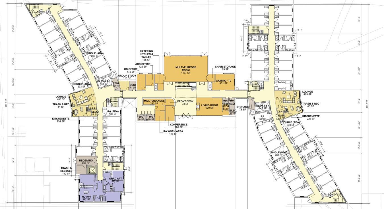 Located in the North Neighborhood Development of campus, the building is comprised of two residence towers, containing a community of 250 students per tower. Student rooms are mostly double configuration, with a mix of single and ADA compliant rooms per wing. Each floor contains approximately twenty-seven rooms, including one Resident Assistant room. Bathroom facilities are arranged in four groups per typical floor, containing shared lavatory space and private toilet/shower compartments. Each residential floor of each tower has a dedicated lounge and kitchen space.