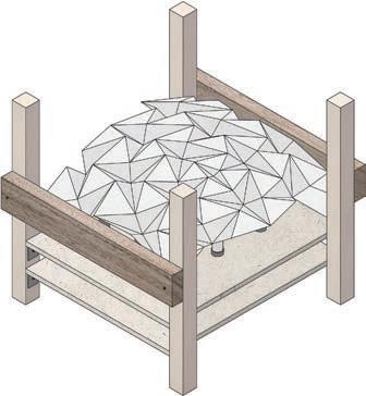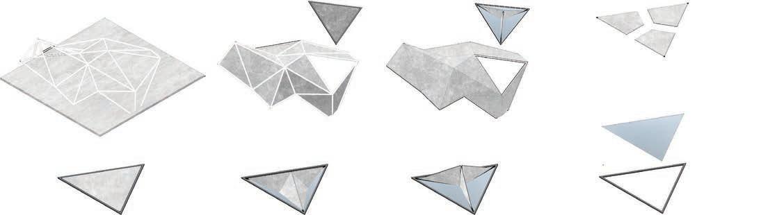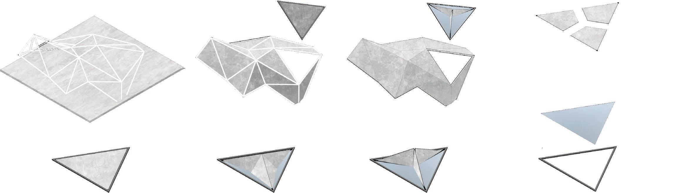 A form finding machine was used to develop the form for Regeneration. The machine used magnetically powered point forces to expand a folded Resch Tesselation pattern across a surface. The Resch Tesselation is a triangular origami form that expands when pushed allowing unique and effective spaces to be created based on the users chosen force placements and strength.