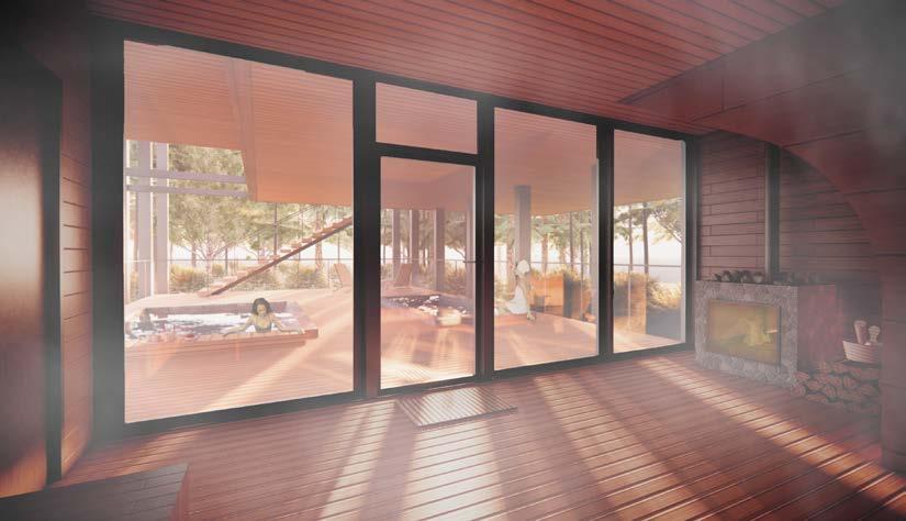 Whilst the sauna at the bottom uses dark, earthy materials to ground it to the forest floor and create a comforting, protected, secure and warm space; which work to suggest tranquility, peace and introspection.