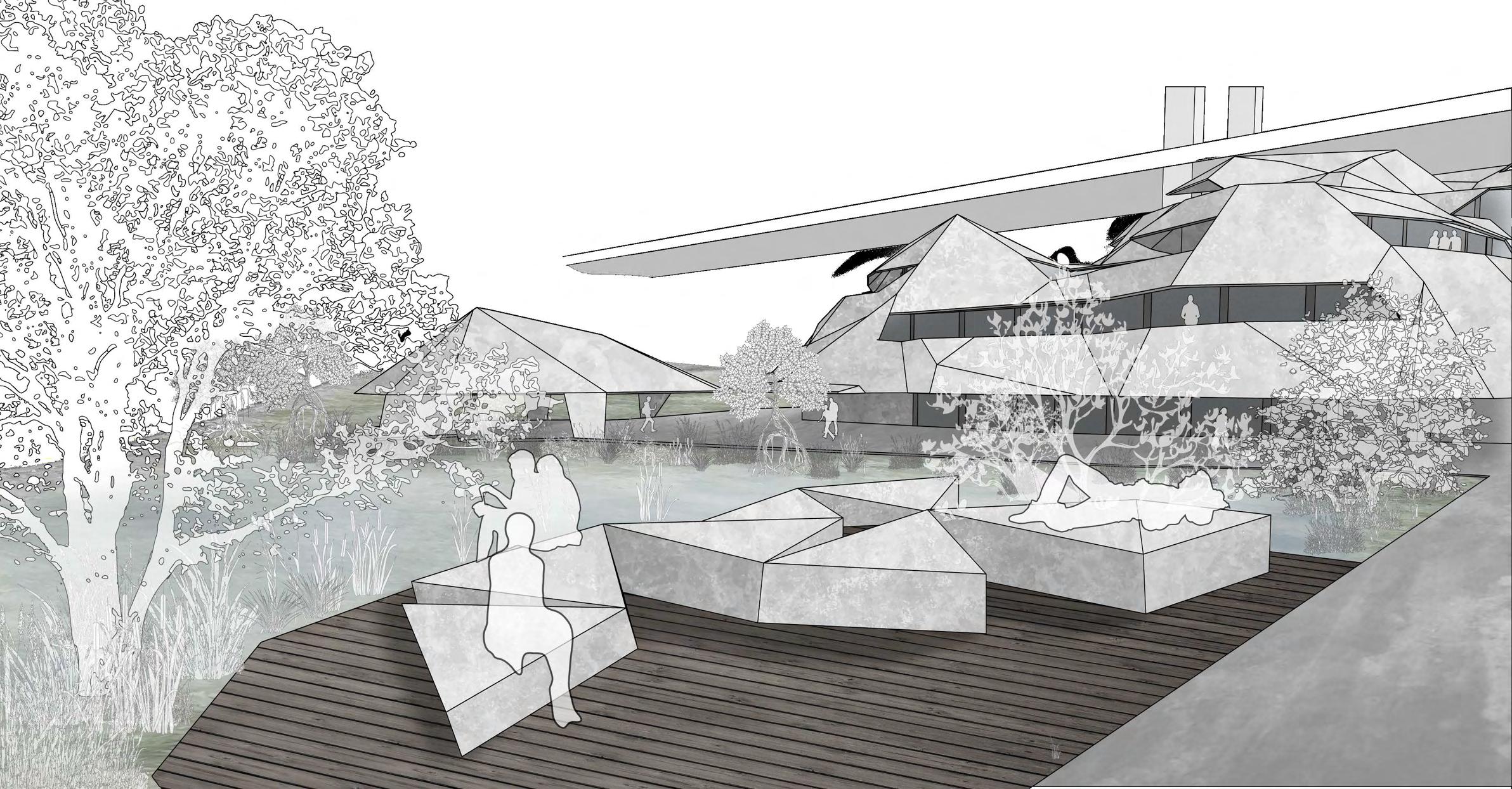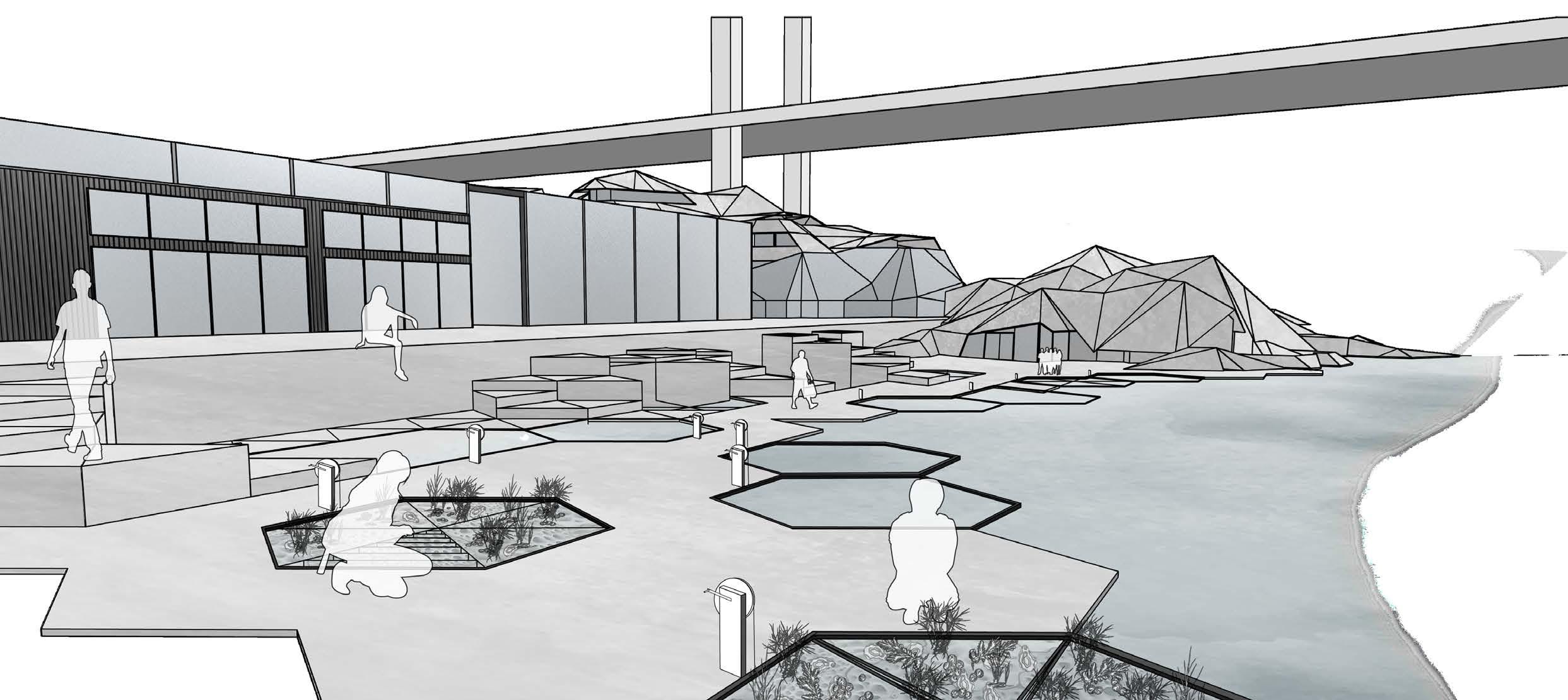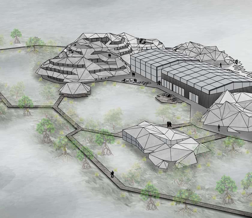Applying this to the site, the program elements were used as point forces to expand the Resch Tesselation across the site to create the form as seen below. The locations have been chosen according to site development outlines. The form finding technique created structures that were separated with sharp and jagged features. This feature has been kept as it makes unique forms in rock like shapes which naturally blend the structures into the waterfront.
