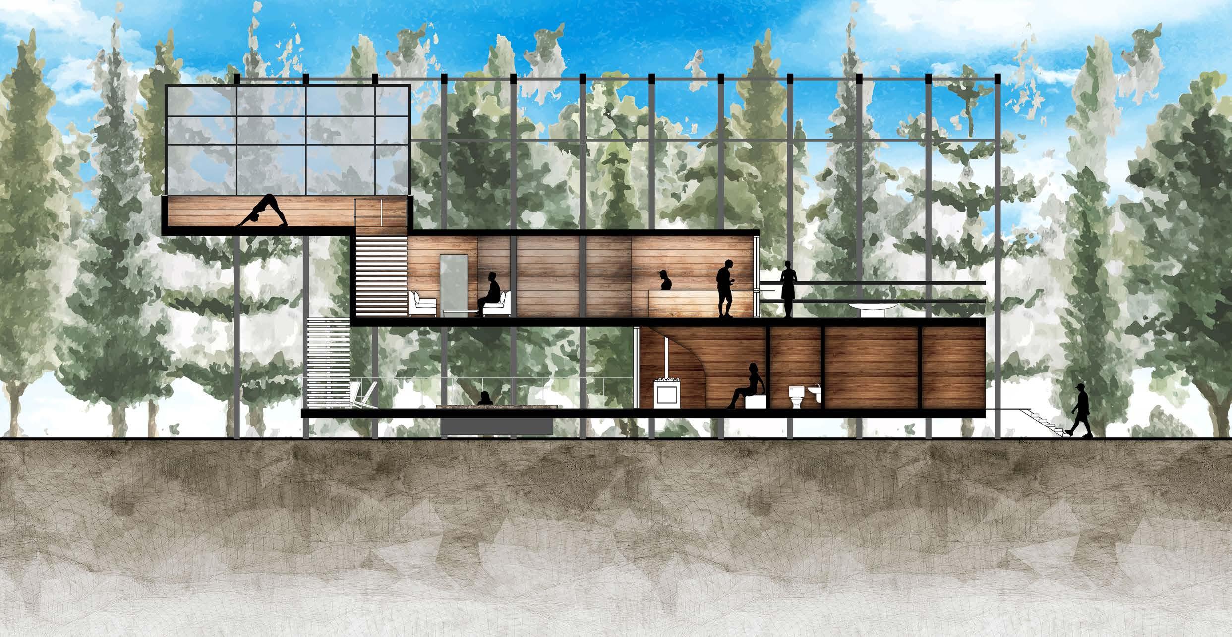 The design creates three spaces that focus on the fundamentals of Yoga and connects them with Latvian culture. To strengthen these connections. The program takes advantage of elevation to with the spaces ascending starting at the earthy comforting Latvian Sauna and ending with the open, light Yoga studio amongst the swaying treetops.