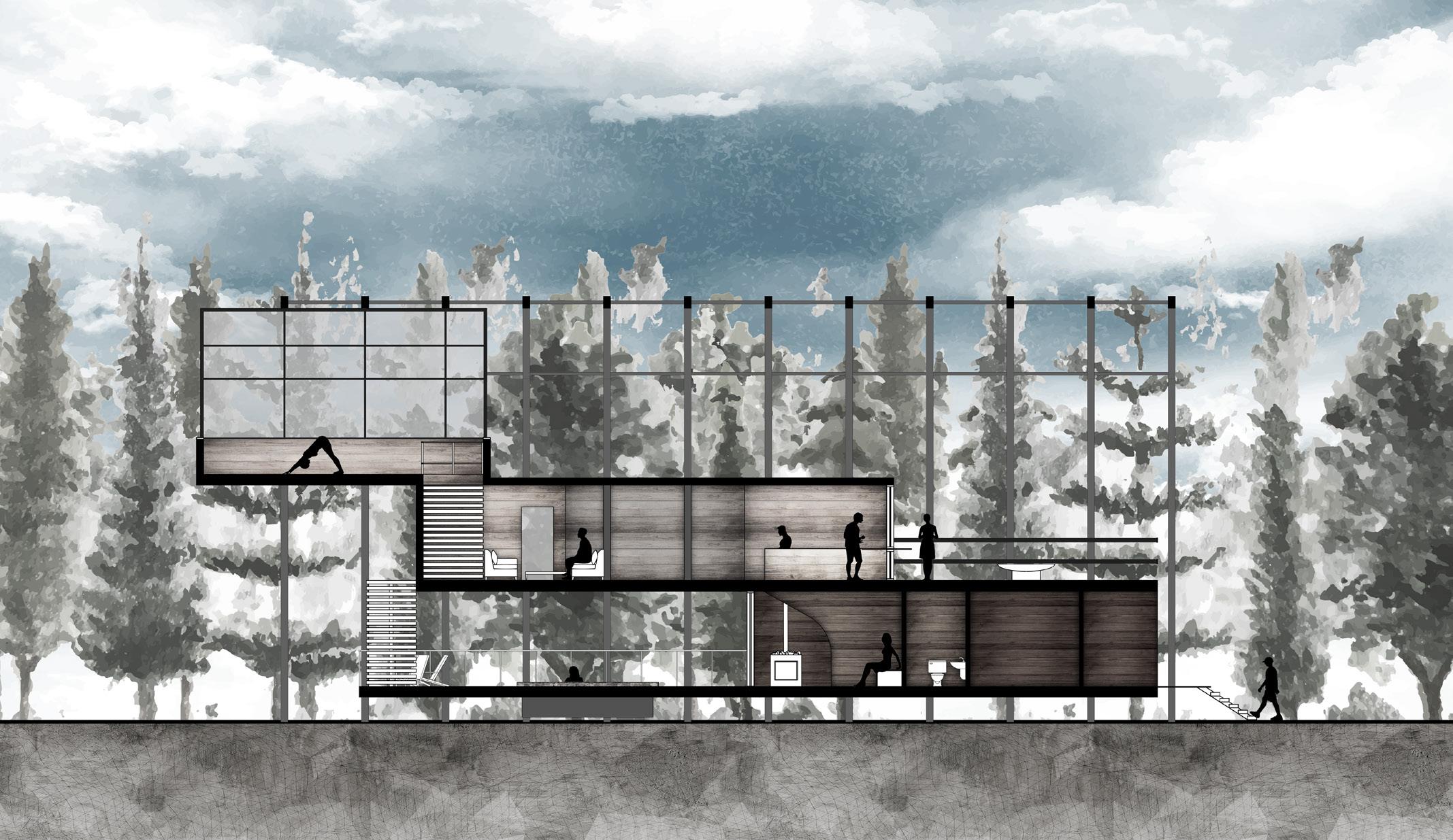 The design creates three spaces that focus on the fundamentals of Yoga and connects them with Latvian culture. To strengthen these connections the program takes advantage of elevation with ascending spaces starting at the earthy comforting Latvian Sauna and ending with the open, light Yoga studio amongst the swaying treetops.