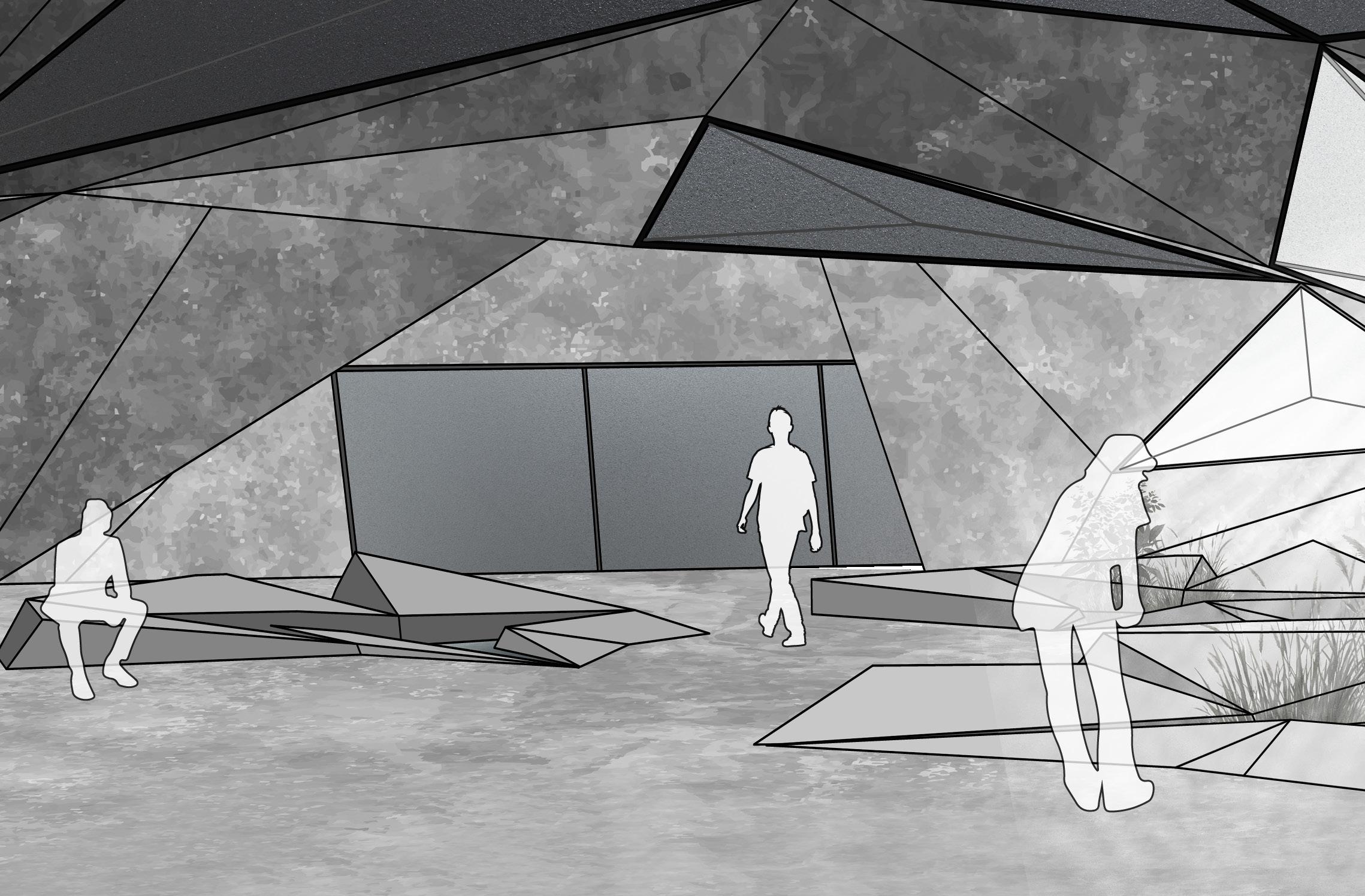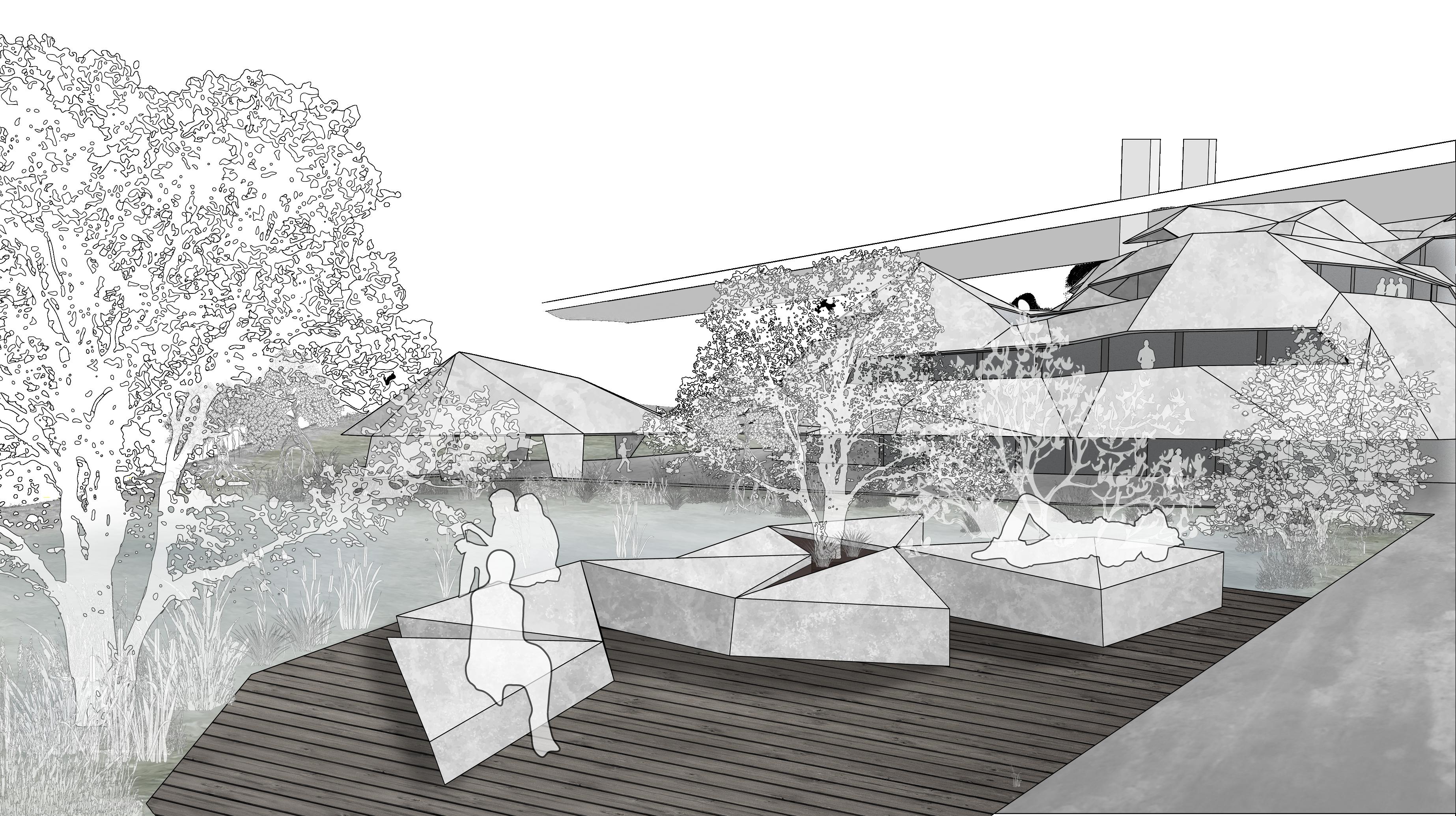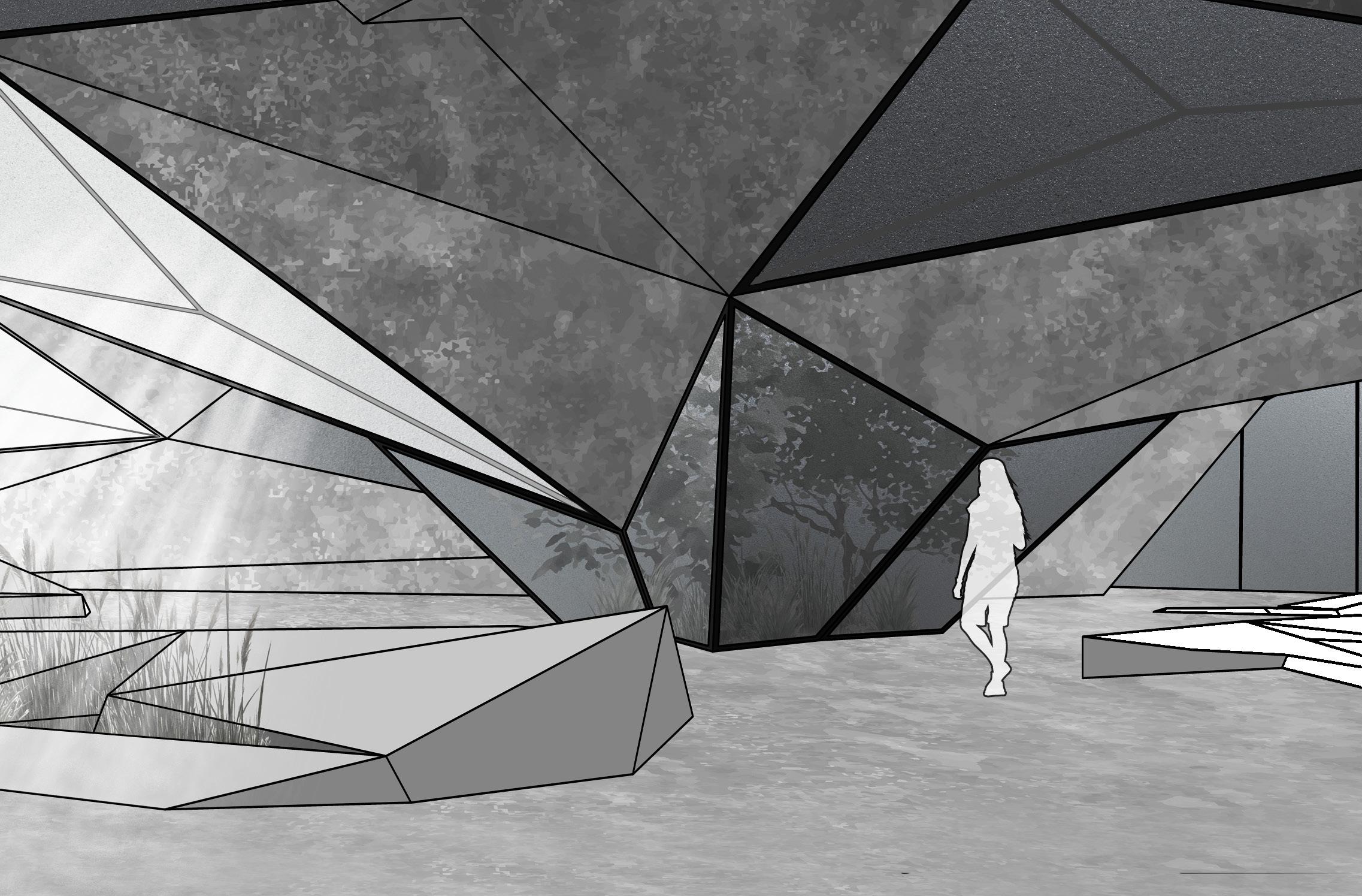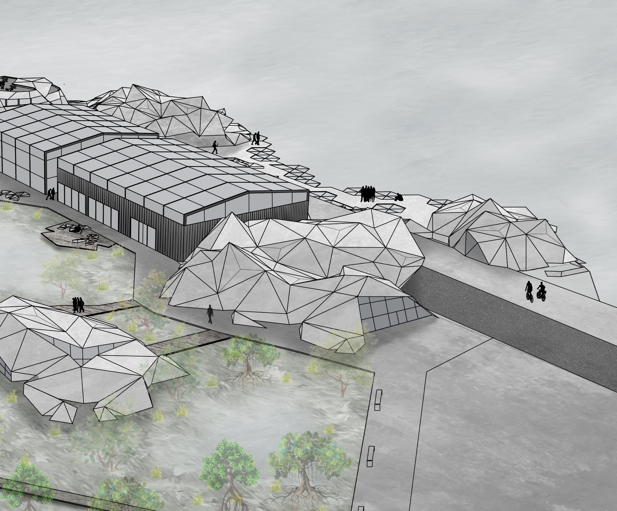 The form of Regeneration was created using a Resch Tessellation, a foldable expanding surface, expanded across the site. The surface creates natural rocky shapes that blend the structures into the surrounding wetlands and waterfront. This is further enhanced through facade materials, cement sheeting which gives the forms a rocky texture.