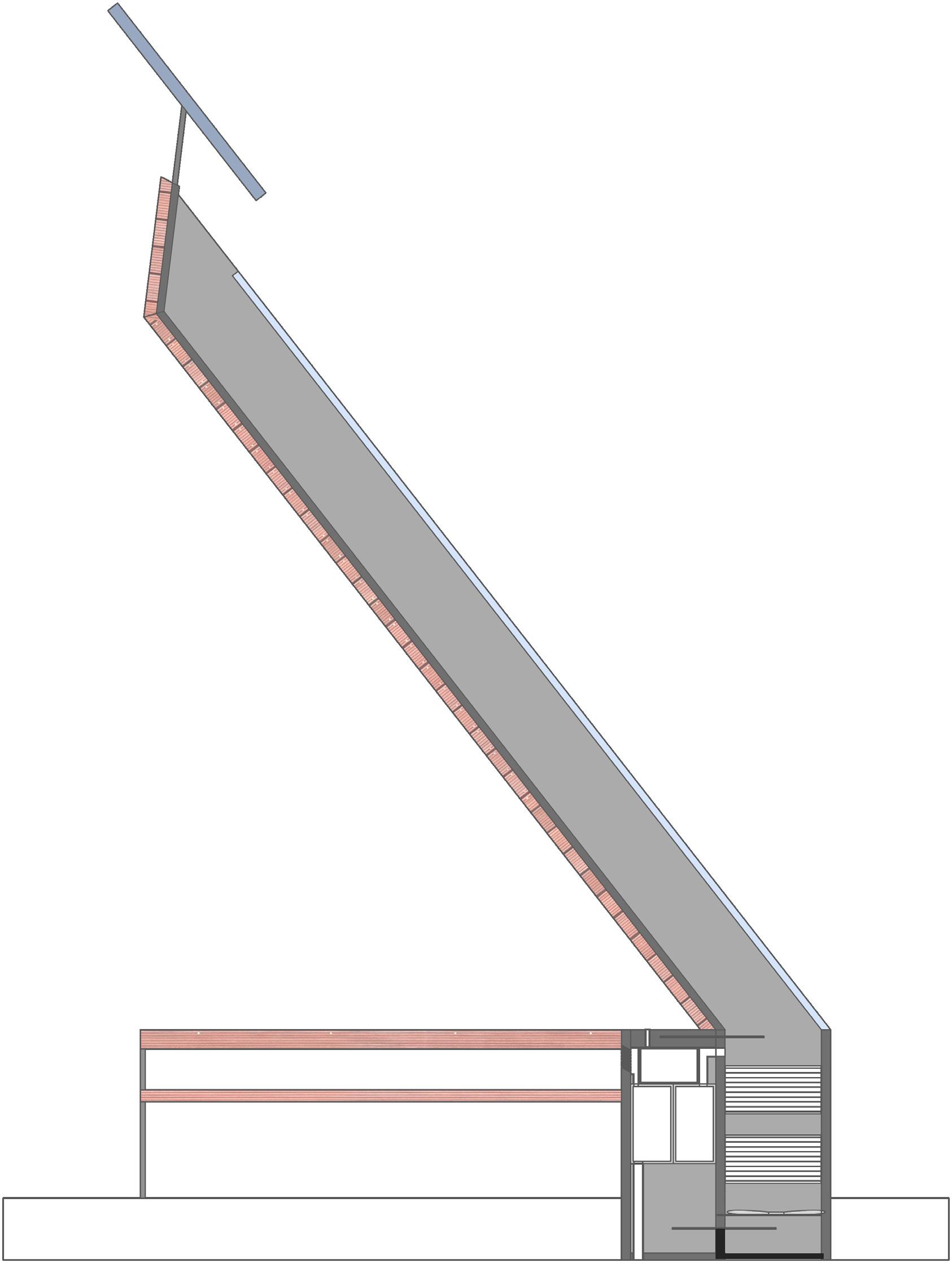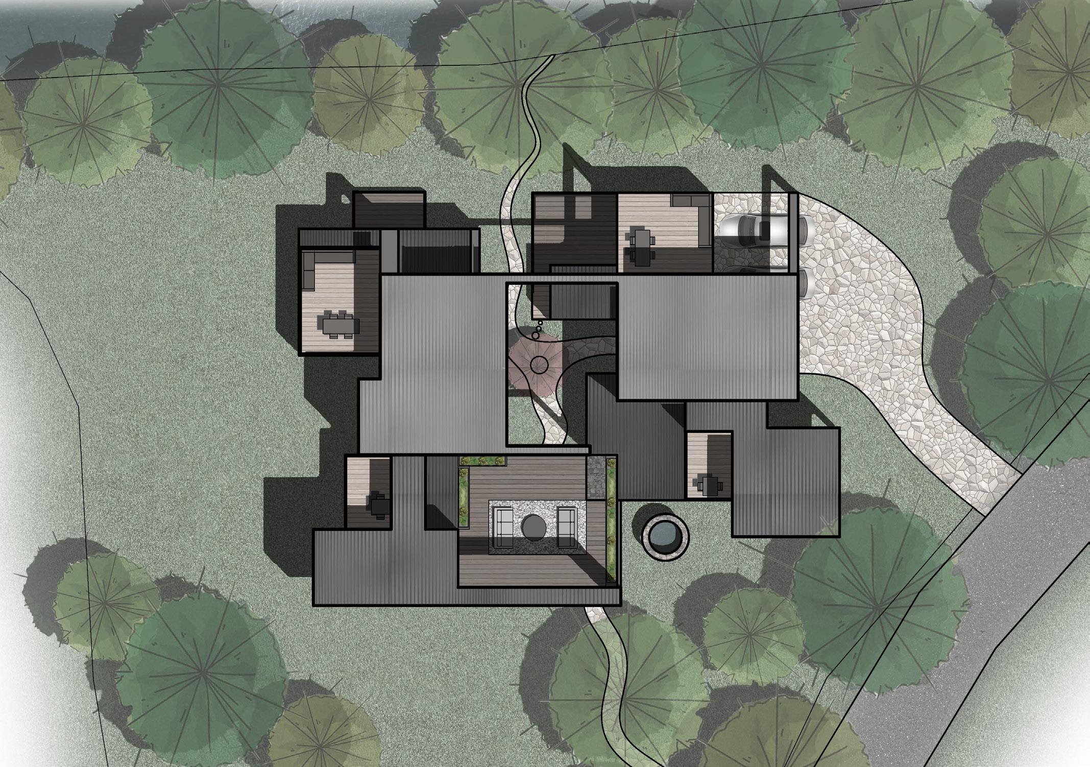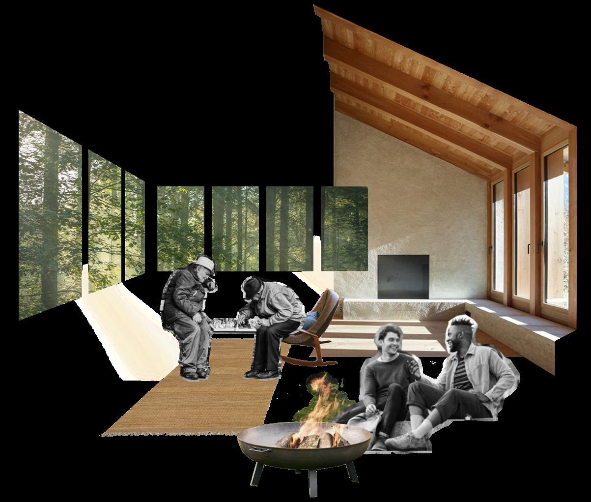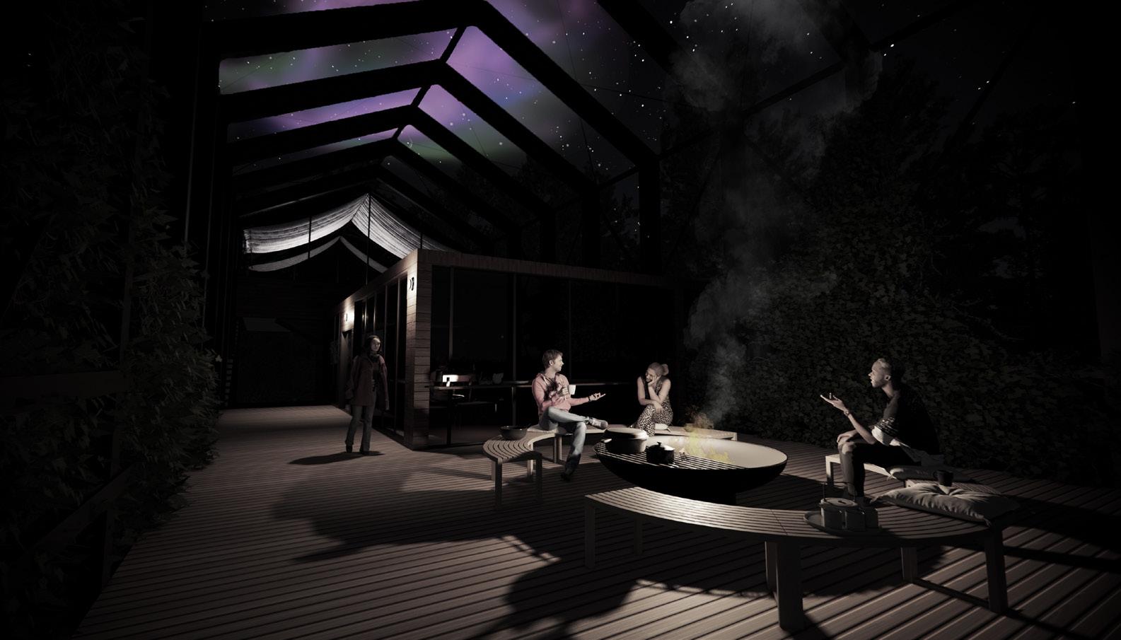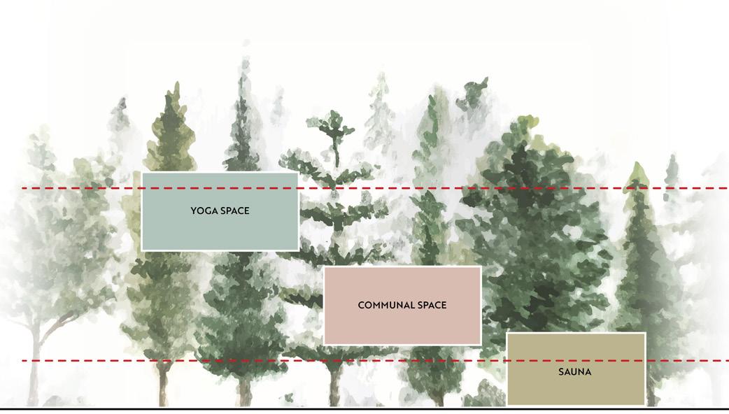 Whilst the sauna at the bottom uses dark, earthy materials to ground it to the forest floor and create a comforting, protected, secure and warm space; which work to suggest tranquility, peace and introspection.