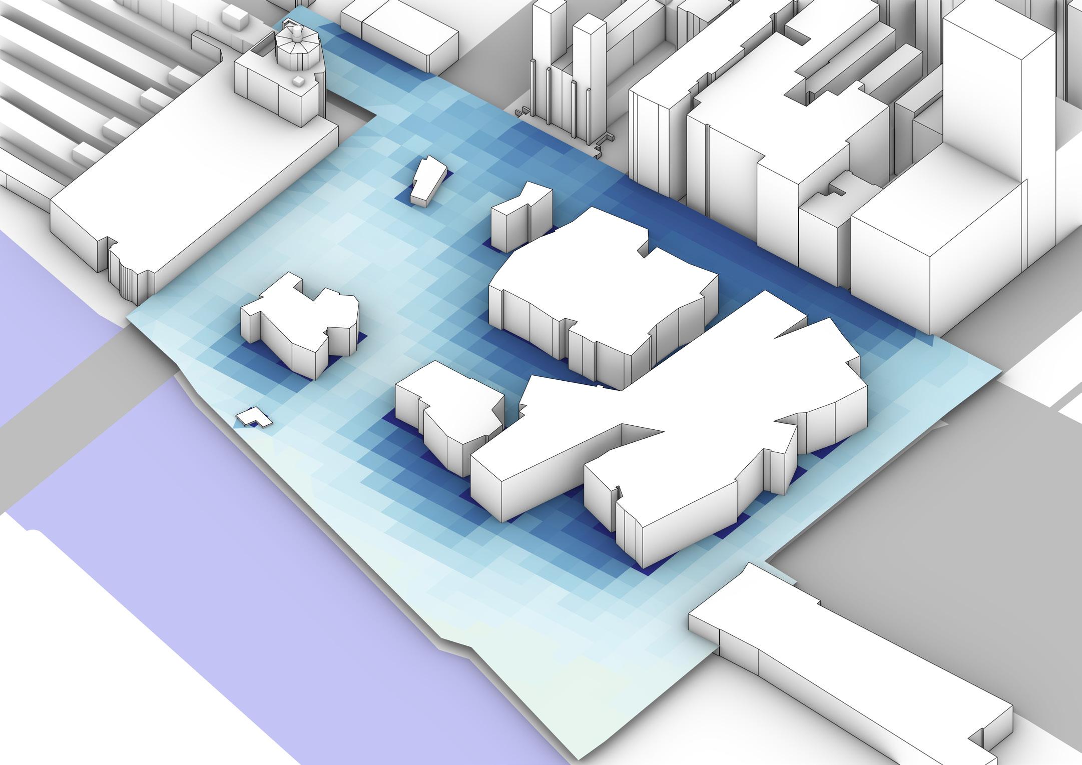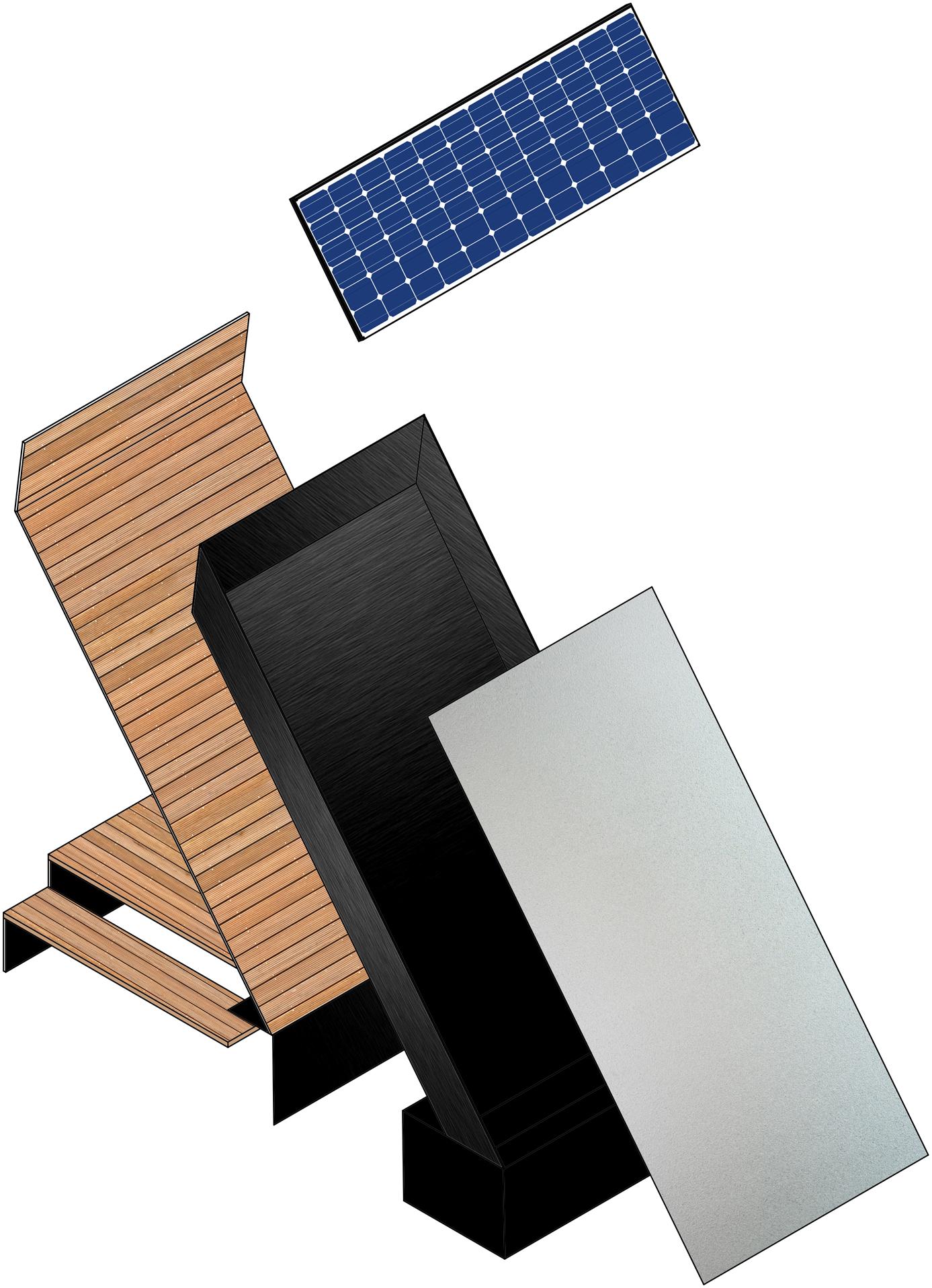 The units were developed through Grasshopper and research to optimise airflow through the solar chimeny by angling the chimney to the average sun direction and also placing it appropriately in Federation Square.