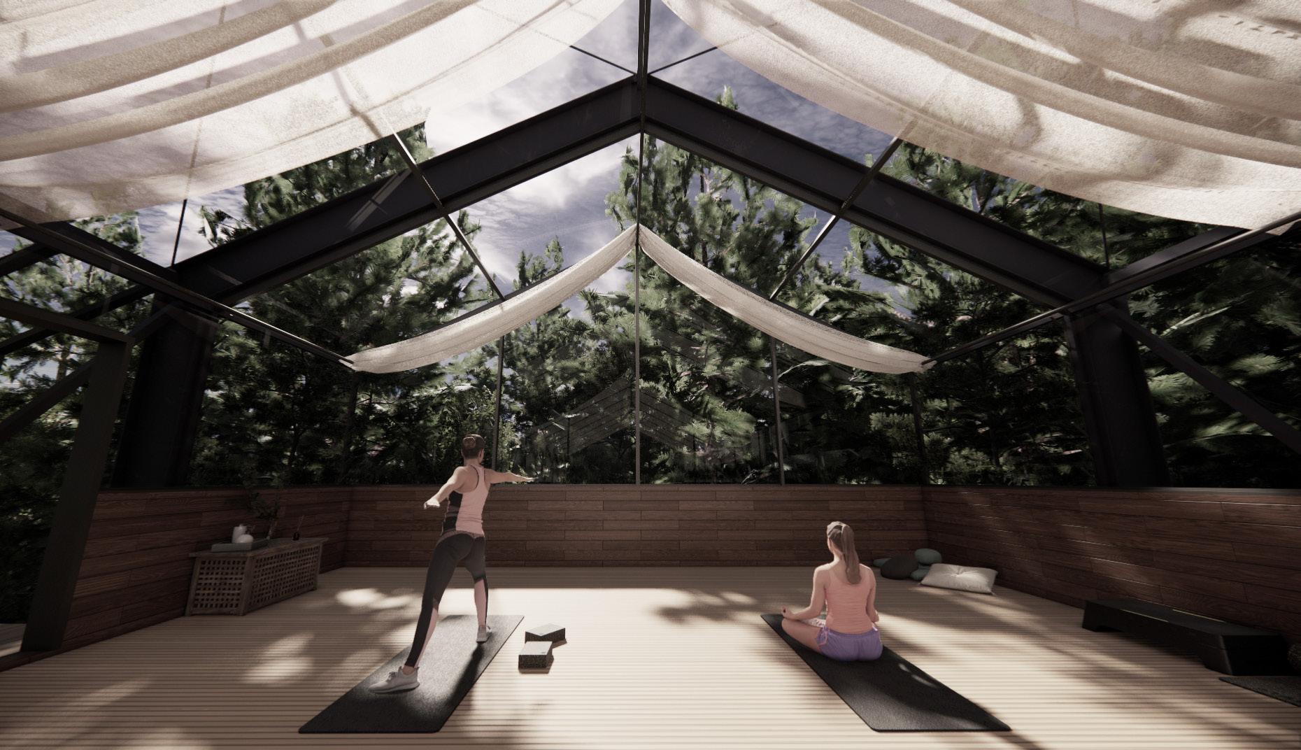 Each space is designed to use it’s surrounding to enhance the connection to it. The Yoga space at the top opens is built with windows extending over the roof, opening the entire space to nature projecting guests’ minds upwards and outwards into the surrounding world.