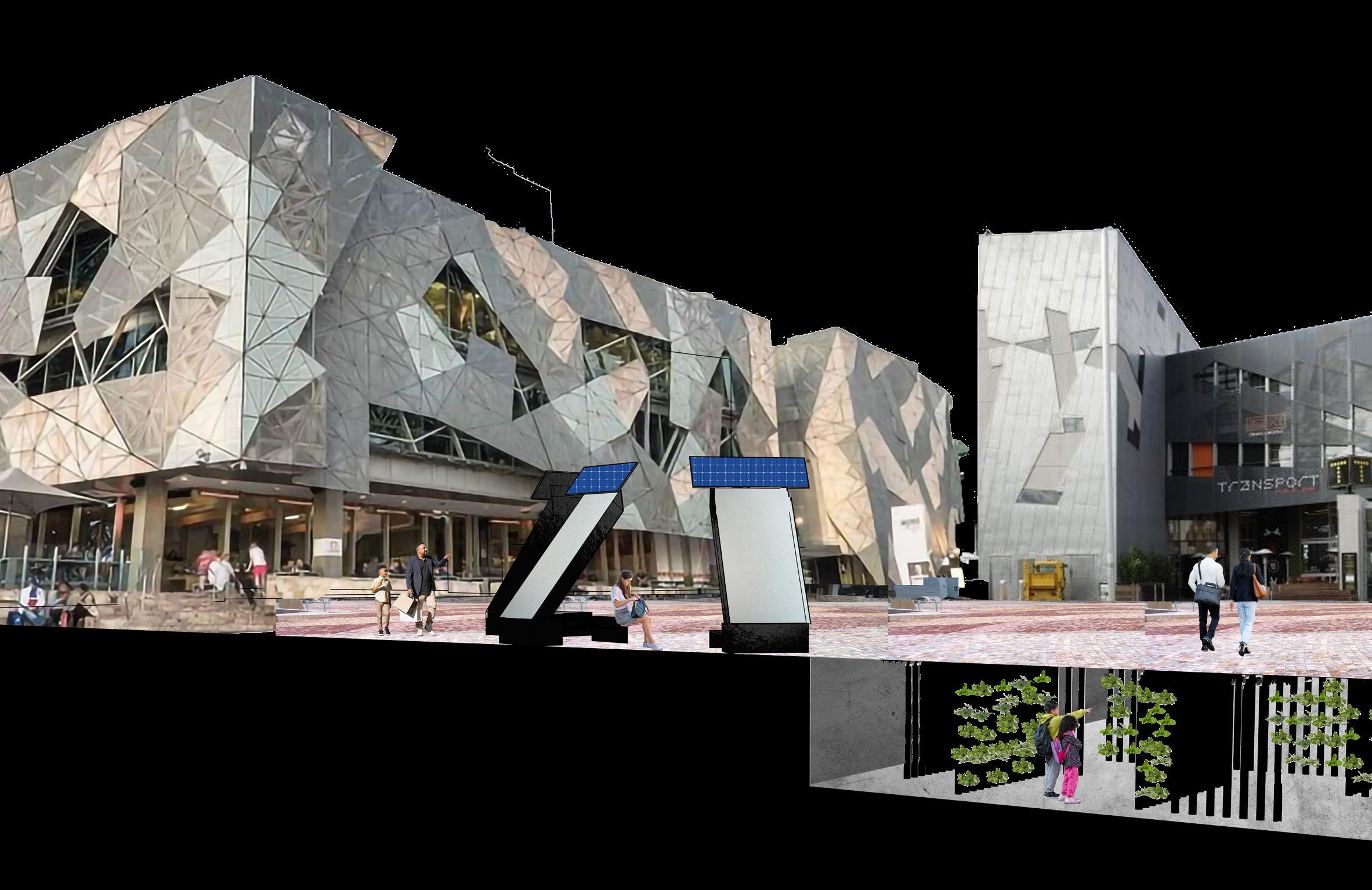 Designed for the new Melbourne Metro Tunnel project and placed in Federation Square, the Solar Revitaliser is a solar chimney that extracts Carbon Dioxide emitted from pedestrians in underground spaces by capturing it using an experimental system developed by MIT. The system then converts it to Oxygen and Acetate using the process of Artificial Photosynthesis.
