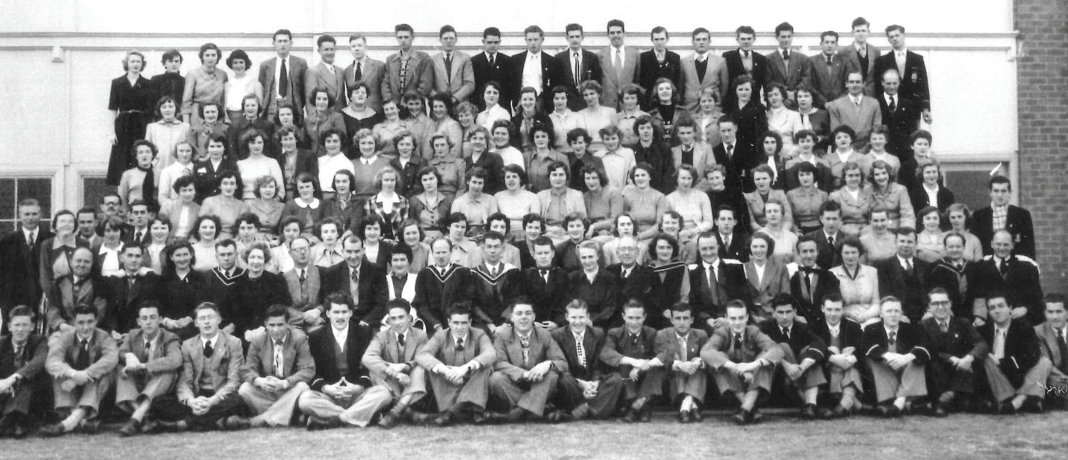 Left: BTC First Graduation Group with staff, 1952; Right: Mrs Dorothy Catts opening of DMG Memorial gates.