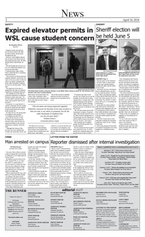 Expired elevator permits in Sheriff election will be held June 5 WSL cause student concern By Alejandra Alberto Reporter Students, faculty and staff use the elevators located in the Walter Stiern Library various times throughout the day. However, some students noticed the elevators in the library had not been inspected since Sept. 29, 2016 and the permit expired Sept. 29, 2017. This has brought up concerns of a few CSU Bakersfield students who use the elevators daily. Communications major Joshua Franco stated that this is something that concerns him. “The elevators not being inspected regularly definitely concerns me because worst case scenario is that not only is my safety in jeopardy, but all the other thousands of students who use the elevators daily,” Franco said. The inspection of elevators is regulated by the State of California Department of Industrial Relations. The regulations on the State of California Department of Industrial Relations website states that, “No elevator shall be operated without a valid, current permit issued by the Division.” The permit, or a copy thereof, to operate a passenger elevator, freight elevator or incline elevator shall be posted conspicuously and securely in the elevator car. For other devices, the permit shall be available on the premises.” According to an interview via email with the Director of Public Affairs and Communications, Michael Lukens, the elevators are inspected monthly by the elevator maintenance company Thyssenkrupp. “Although the licenses of the elevators have been updated just recently, the reason they weren’t up-