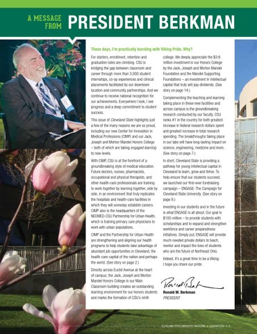 college. We deeply appreciate the $3.6 million investment in our Honors College by the Jack, Joseph and Morton Mandel Foundation and the Mandel Supporting Foundations – an investment in intellectual capital that truly will pay dividends. (See story on page 14.) Complementing the teaching and learning taking place in these new facilities and across campus is the groundbreaking research conducted by our faculty. CSU ranks #1 in the country for both greatest increase in federal research dollars spent and greatest increase in total research spending. The breakthroughs taking place in our labs will have long-lasting impact on science, engineering, medicine and more. (See story on page 7.) In short, Cleveland State is providing a pathway for young intellectual capital in Cleveland to learn, grow and thrive. To help ensure that our students succeed, we launched our first-ever fundraising campaign – ENGAGE: The Campaign for Cleveland State University. (See story on page 8.) Investing in our students and in the future is what ENGAGE is all about. Our goal is $100 million – to provide students with scholarships and to expand and strengthen workforce and career preparedness initiatives. Simply put, ENGAGE will provide much-needed private dollars to teach, mentor and impact the lives of students who are the future of Northeast Ohio. Indeed, it’s a great time to be a Viking. I hope you share our pride.