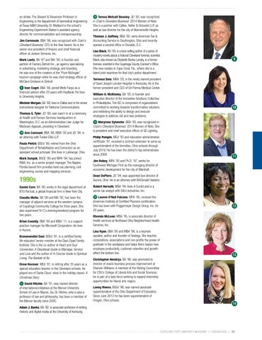 on stroke. The Stewart & Stevenson Professor in Engineering in the department of biomedical engineering at Texas A&M University, Dr. Maitland is the school’s Engineering Experiment Station’s assistant agency director for commercialization and entrepreneurship. Jim Carnovale, BBA ’86, was recognized with Crain’s Cleveland Business’ CFO of the Year Award. He is the senior vice president of finance and chief financial officer at Judson Services, Inc. Mark Lantz, BA ’87 and MA ’90, is founder and partner of Factory Detroit Inc., an agency specializing in advertising, marketing strategy, and branding. He was one of the creators of the “Pure Michigan” tourism campaign while he was chief strategy officer at McCann Erickson in Detroit. 9 Ivan Cugel, BBA ’88, joined Wells Fargo as a financial advisor after 20 years with KeyBank. He lives in University Heights.
